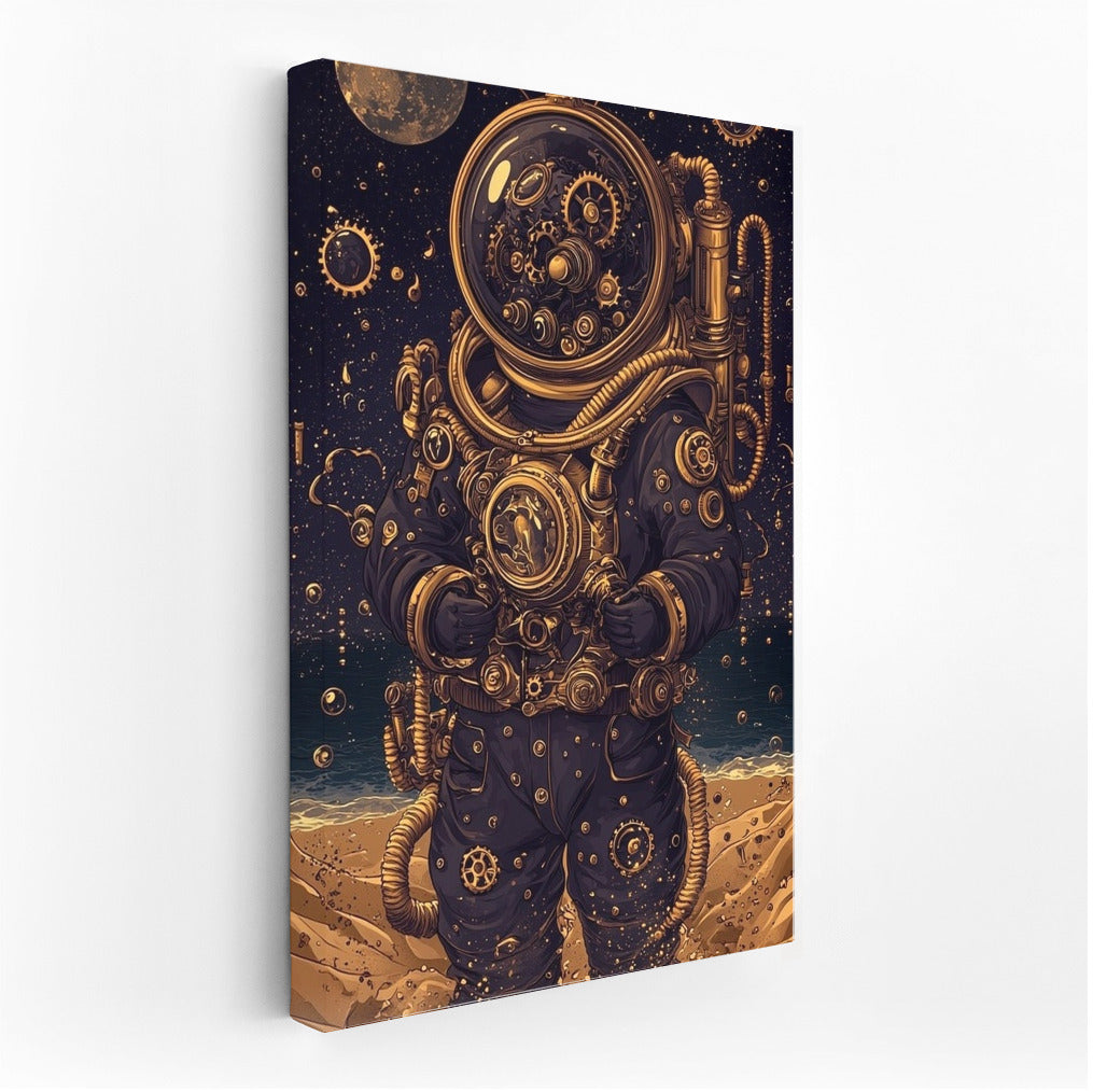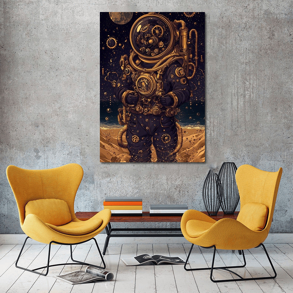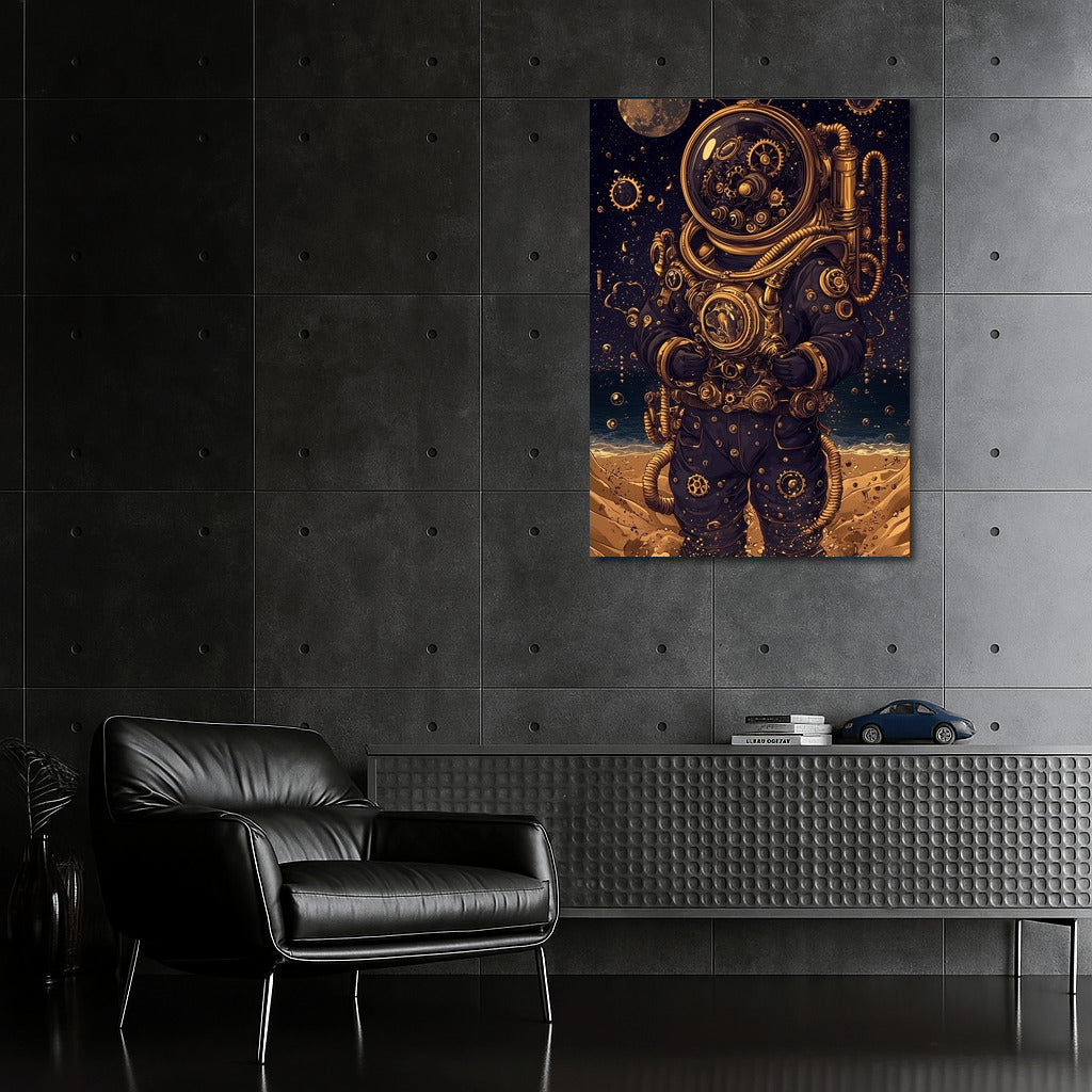 Steampunk space travel: a poster with a mysterious astronaut against the background of the starry sky and the moon. Wall art of the future! See more from the collection: Mixed Wall Art