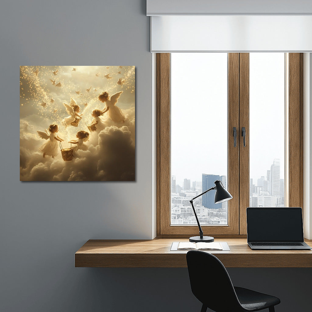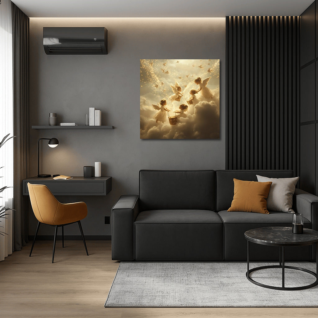 Heavenly fairy tale on the poster: angels among clouds and shining stars. Wall art that fills the house with magic and dreams. See more from the collection: Mixed Wall Art