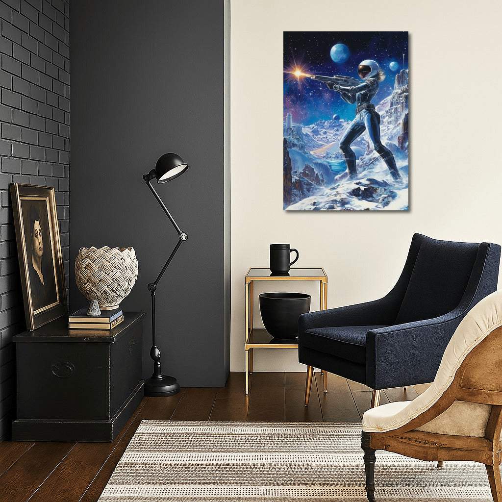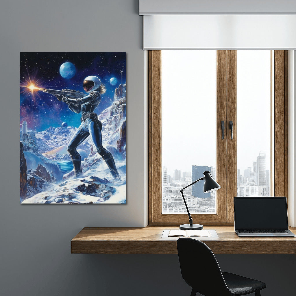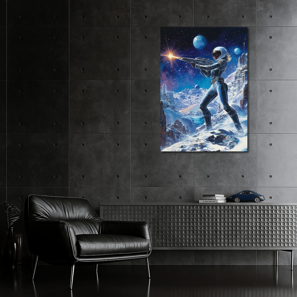 Space adventure: a poster with a warrior in a futuristic spacesuit on a snowy planet will inspire you to dream about the stars! See more from the collection: Space & Astronomy Art