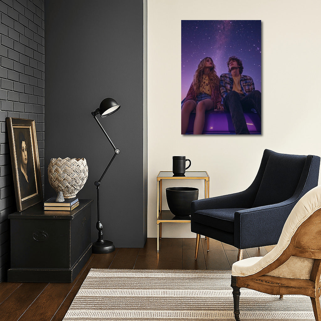 Space dreams: poster with young dreamers under the starry sky on the hood of a purple car. Wall art for romantics! See more from the collection: Mixed Wall Art