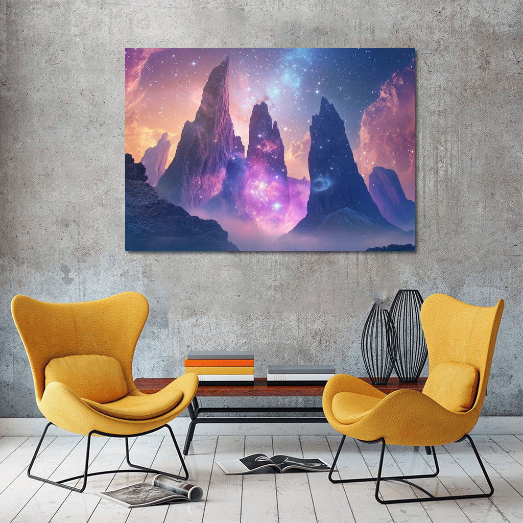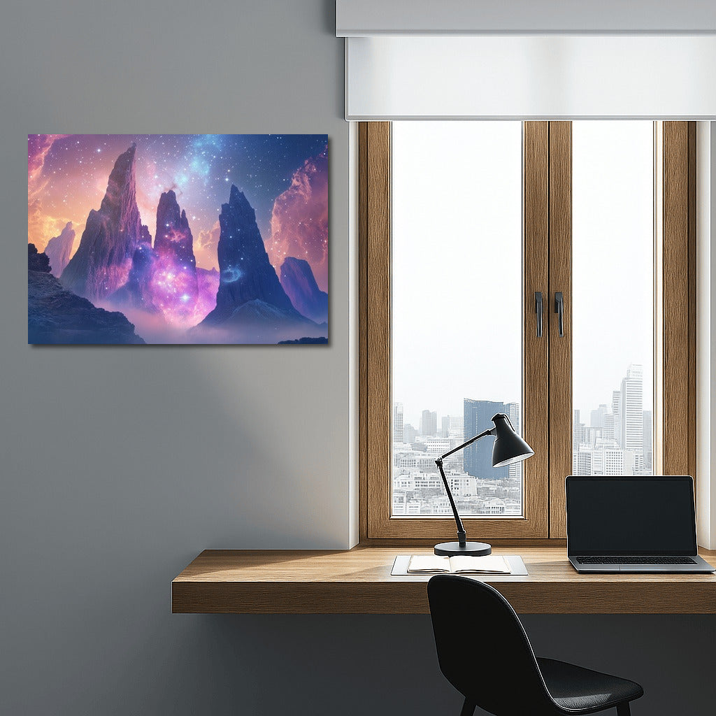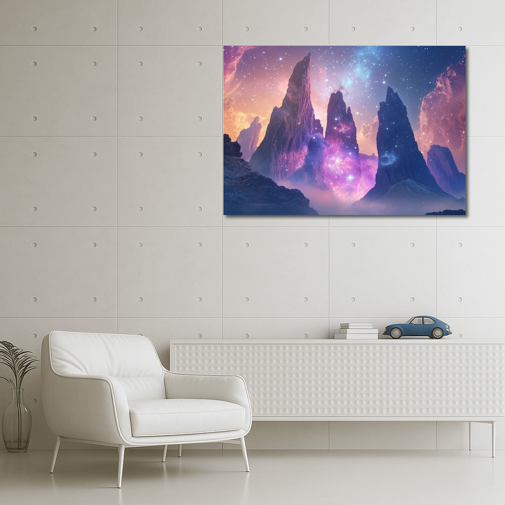 Dive into a space dream with this poster: mysterious mountains and shining stars create a unique wall art. See more from the collection: Nature & Landscapes Art