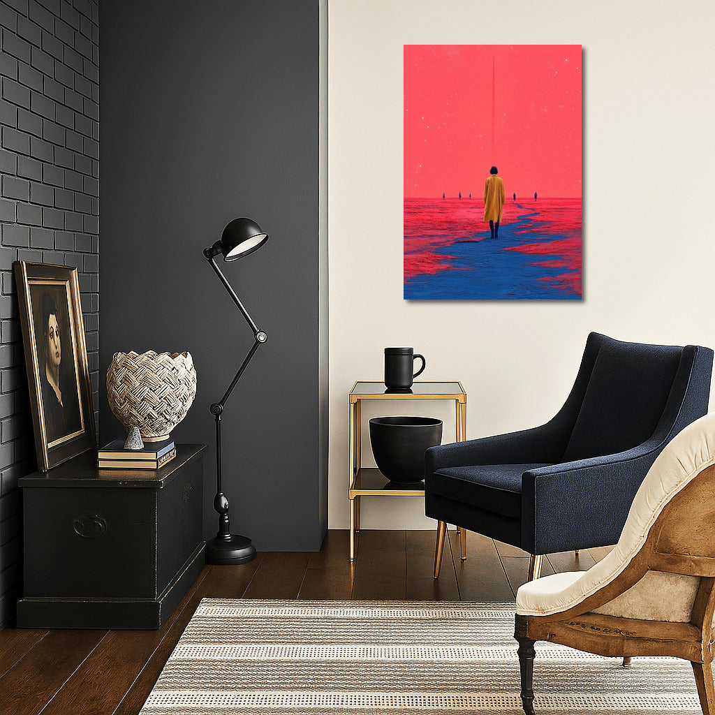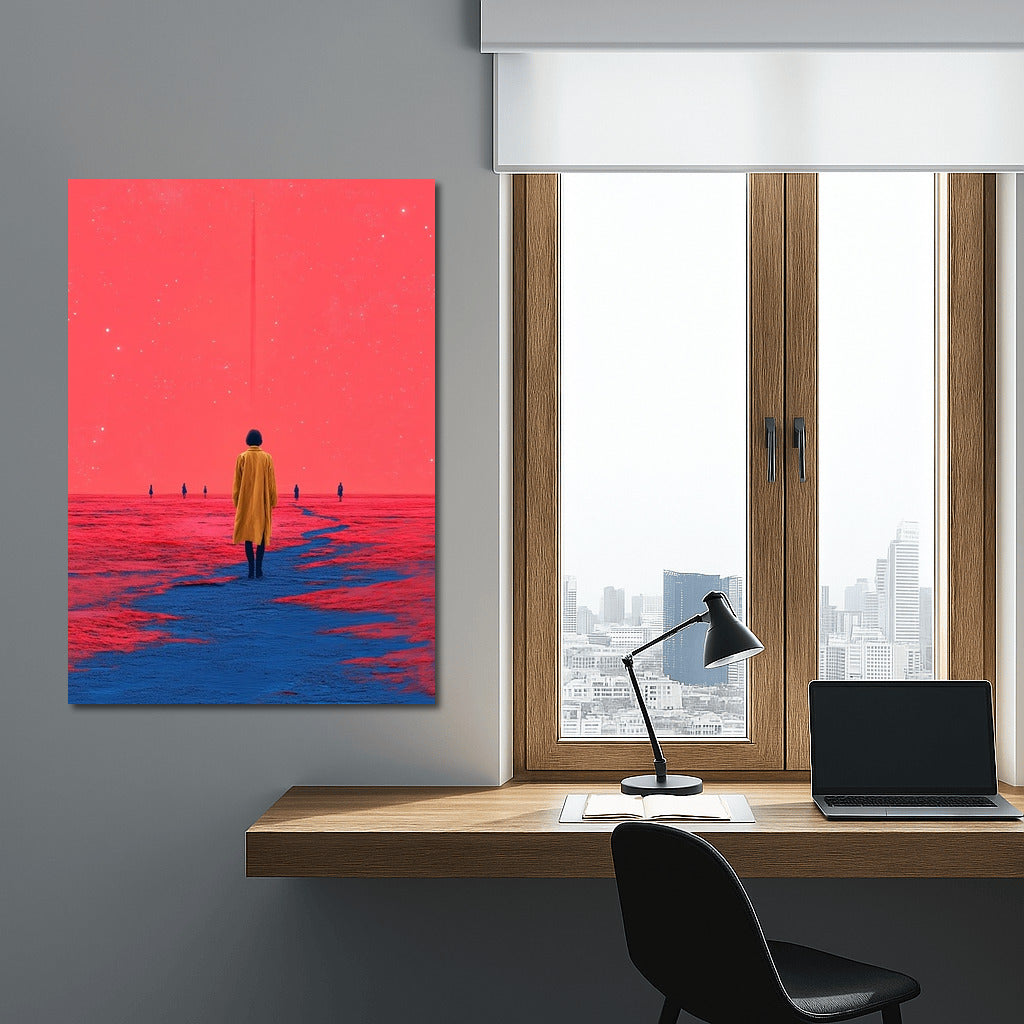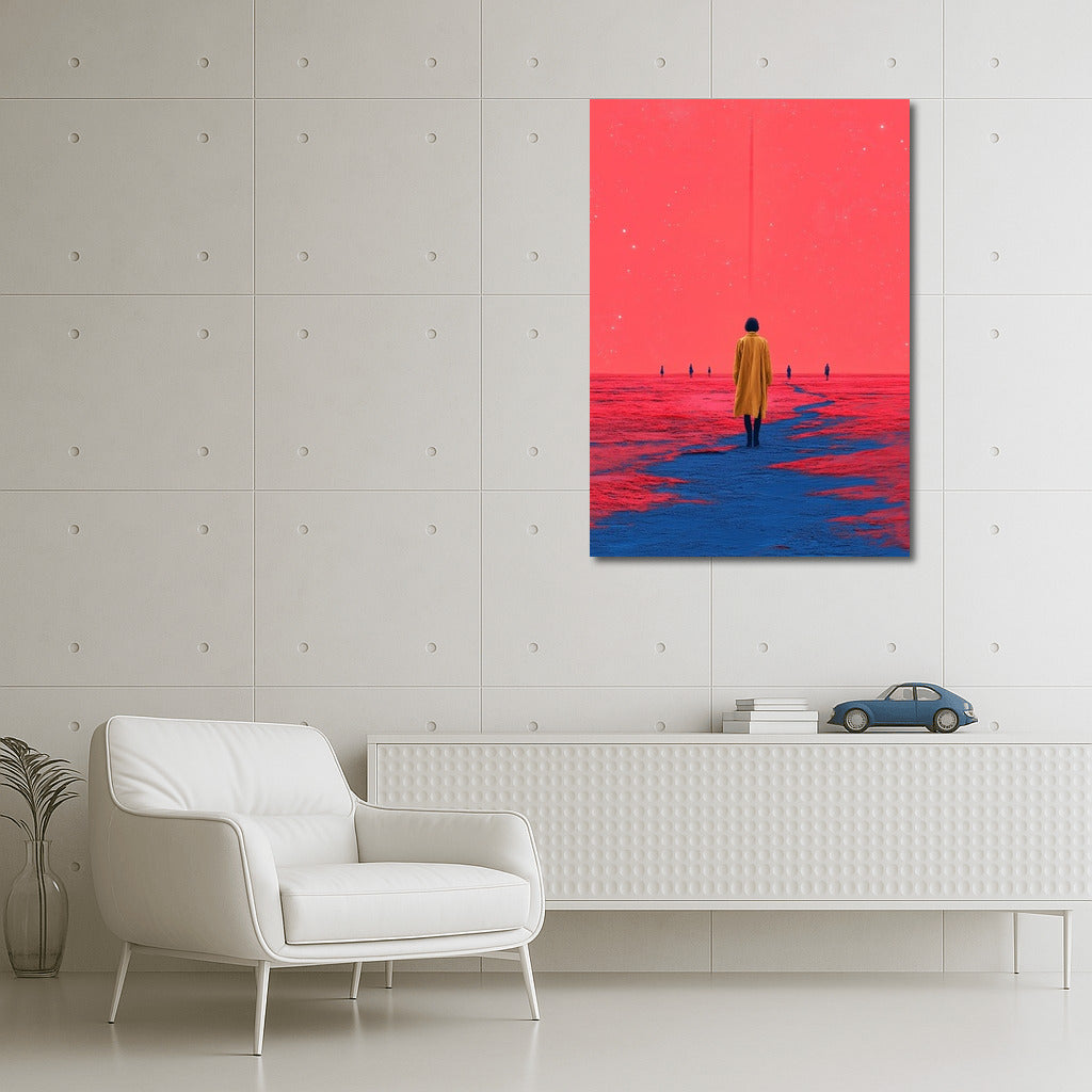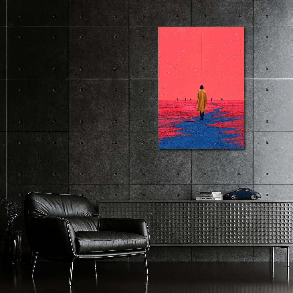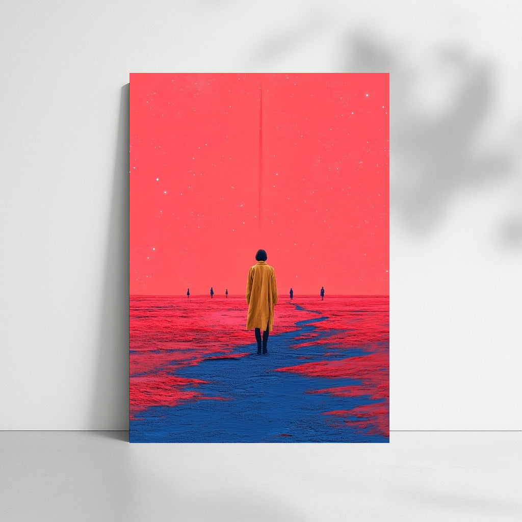 Fantasy poster: a figure in yellow against a cosmic horizon. Immerse yourself in dreamy wall art. See more from the collection: Mixed Wall Art
