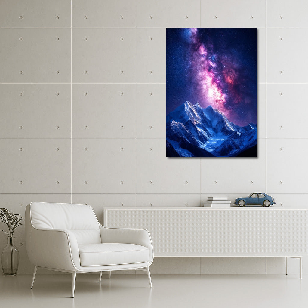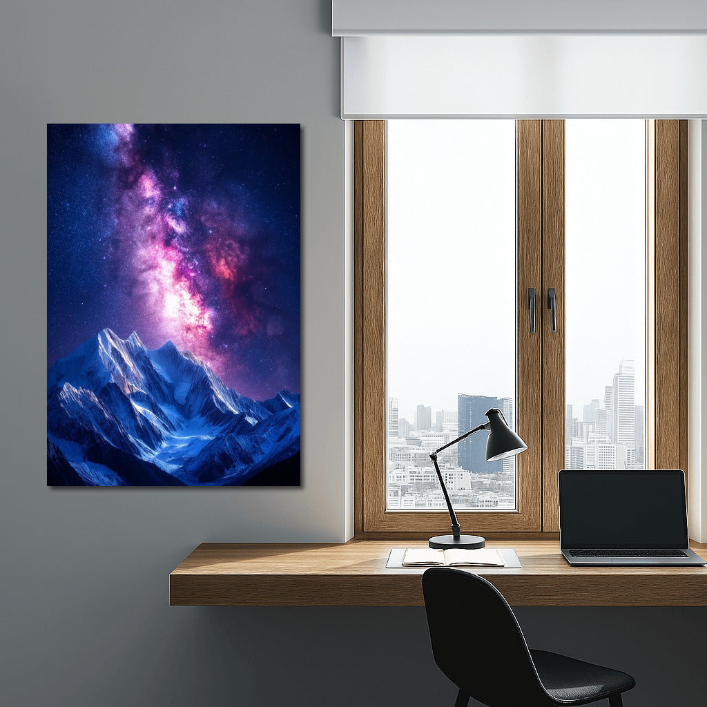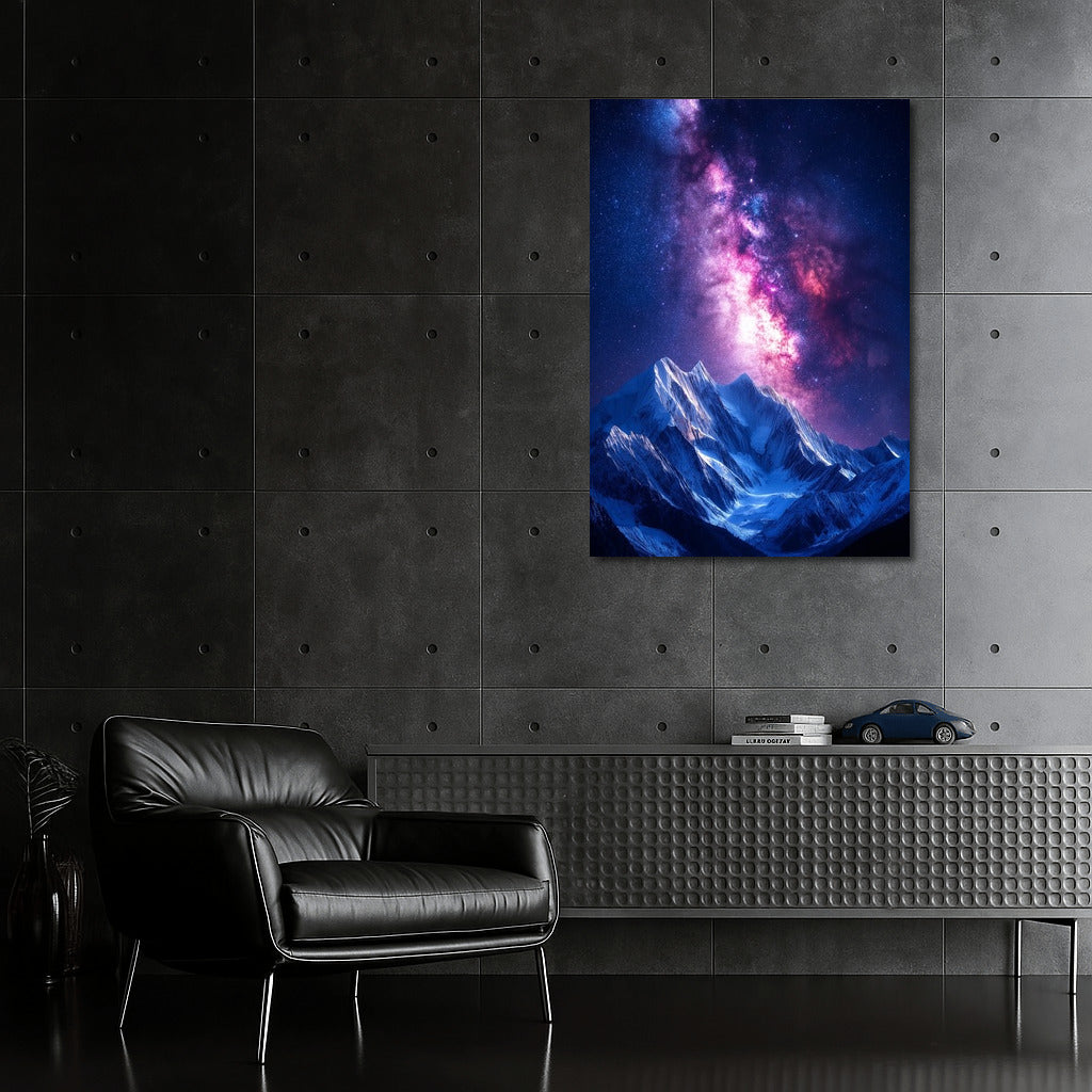 A mesmerizing poster with a mountain landscape and a night sky where the milky way is like a painting on canvas. Ideal for wall art. See more from the collection: Nature & Landscapes Art