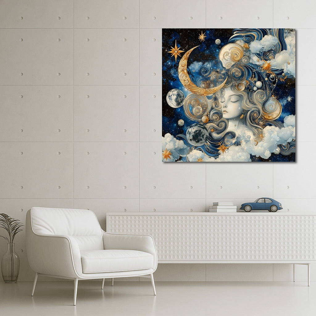 Magical wall art: dream girl among stars and moon. Magical poster for dreamy interiors. ✨ See more from the collection: Mixed Wall Art