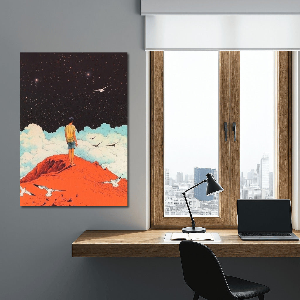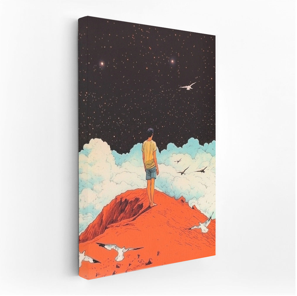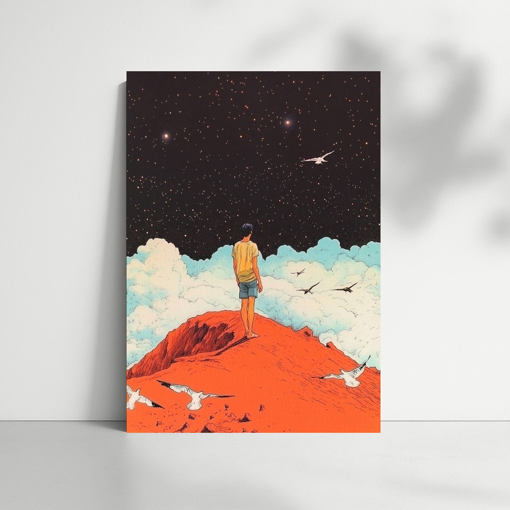 The poster depicts a man on top of a red mountain looking up at the starry sky. Perfect wall art for dreamers. See more from the collection: Mixed Wall Art