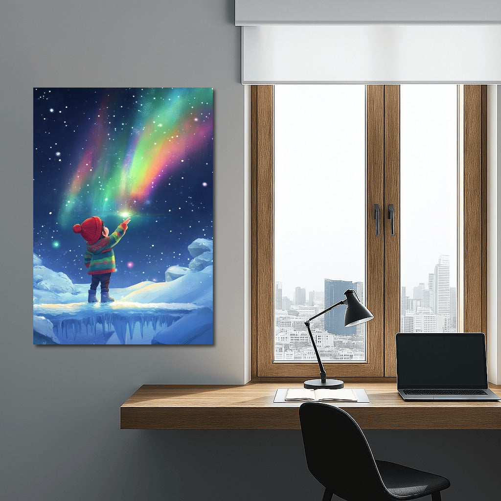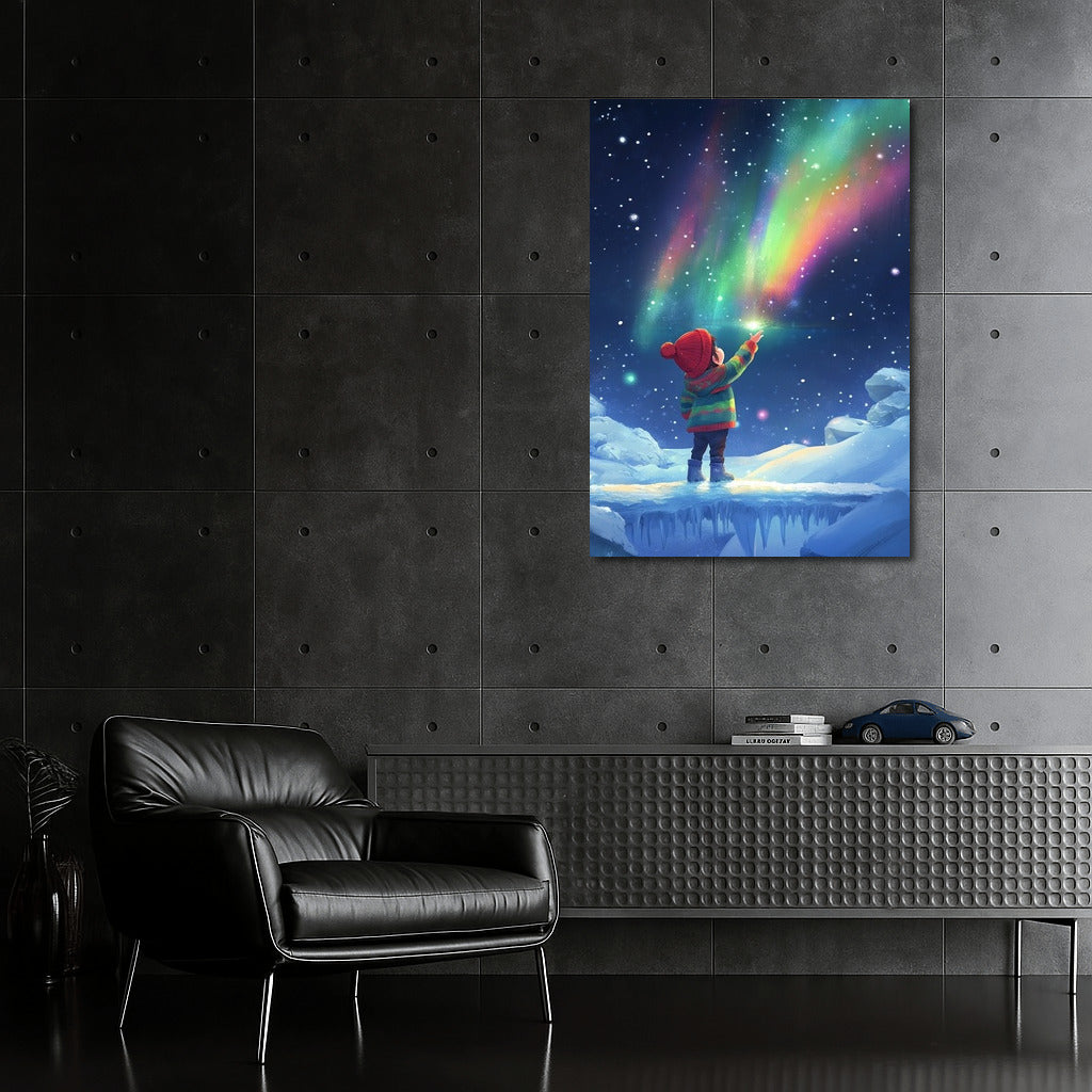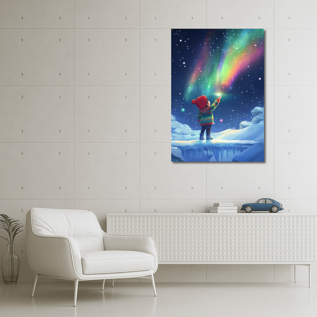 A boy in a winter fairy tale reaches for the stars. A magical poster for the home that creates an atmosphere of wonder and dream. Wall art. See more from the collection: Nature & Landscapes Art