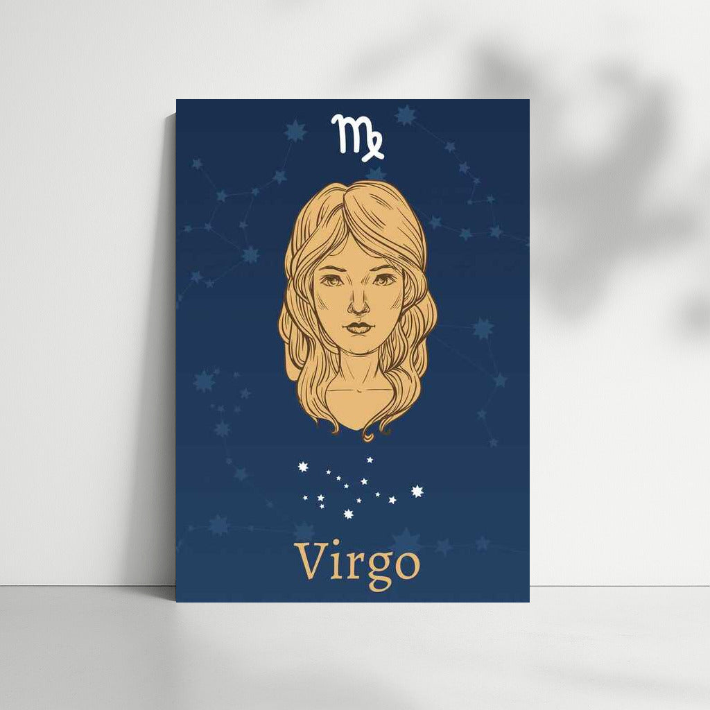 Virgo Poster: A graceful portrait against a backdrop of stars, symbolizing harmony and constellation. Ideal for wall art. See more from the collection: Virgo Zodiac Sign Art