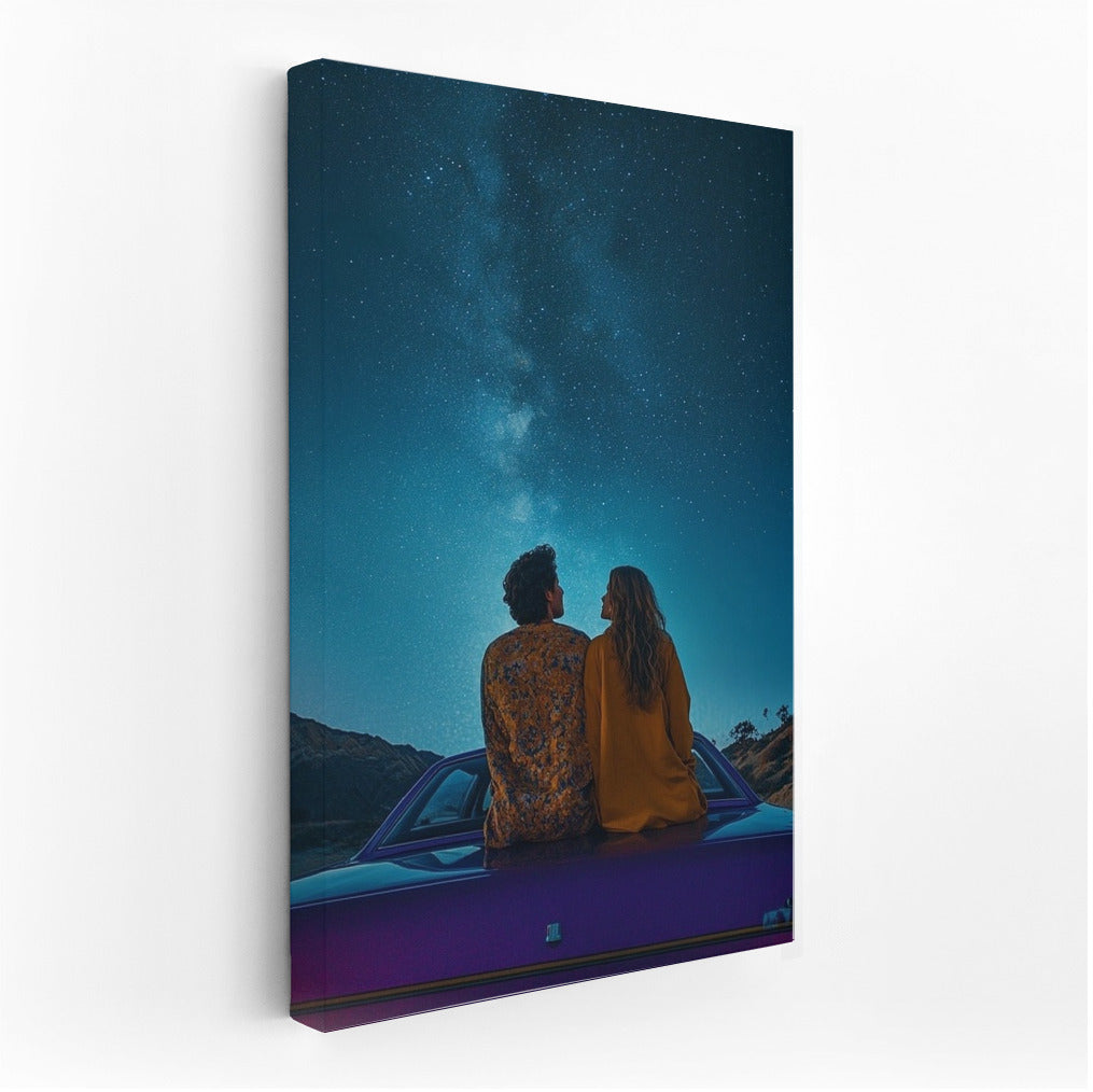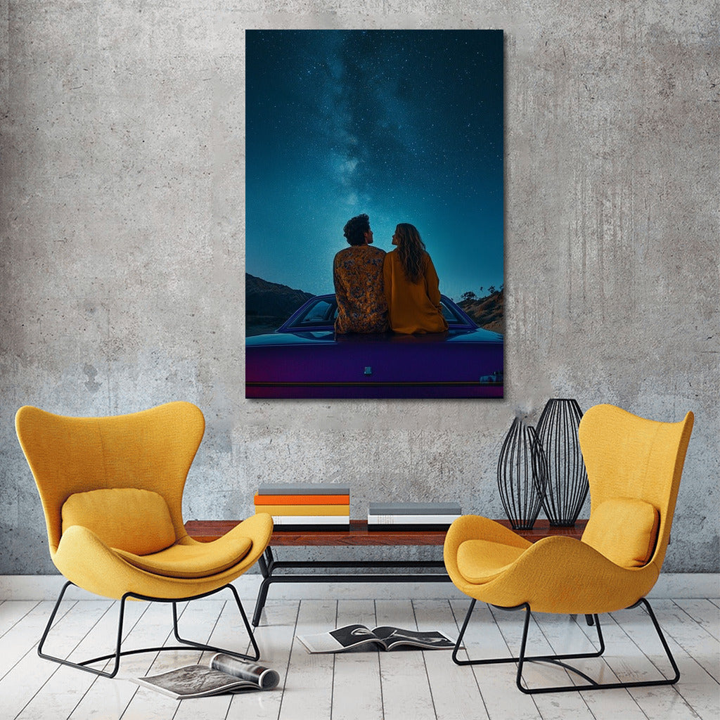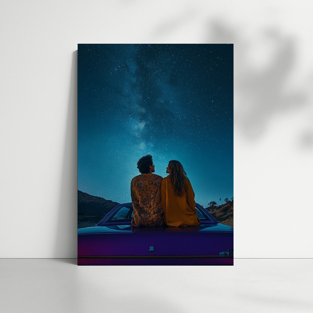 Under the starry sky: a girl and a man in a classic Dodge. The poster is a gateway to the world of dreams and romance. Wall art for the soul. See more from the collection: Love Art