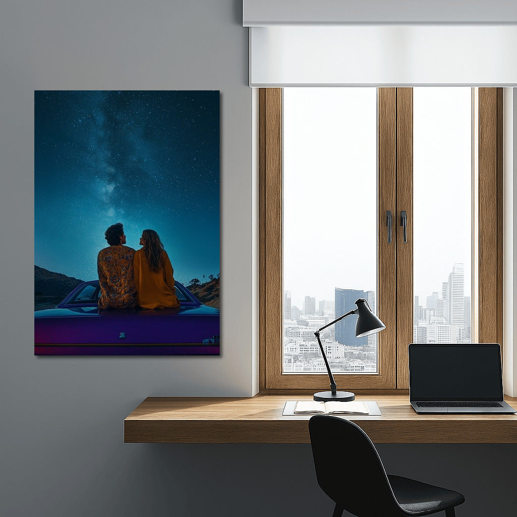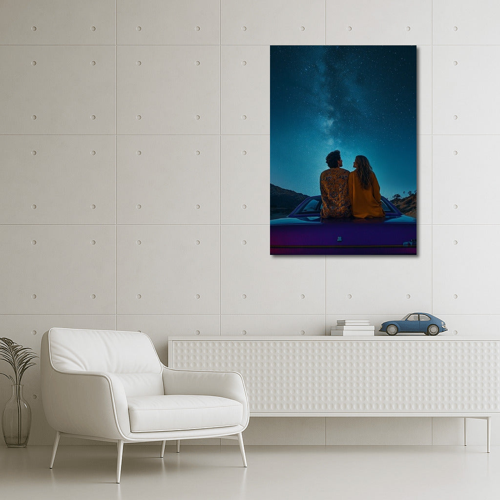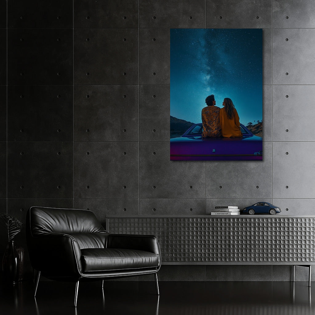 Under the starry sky: a girl and a man in a classic Dodge. The poster is a gateway to the world of dreams and romance. Wall art for the soul. See more from the collection: Love Art