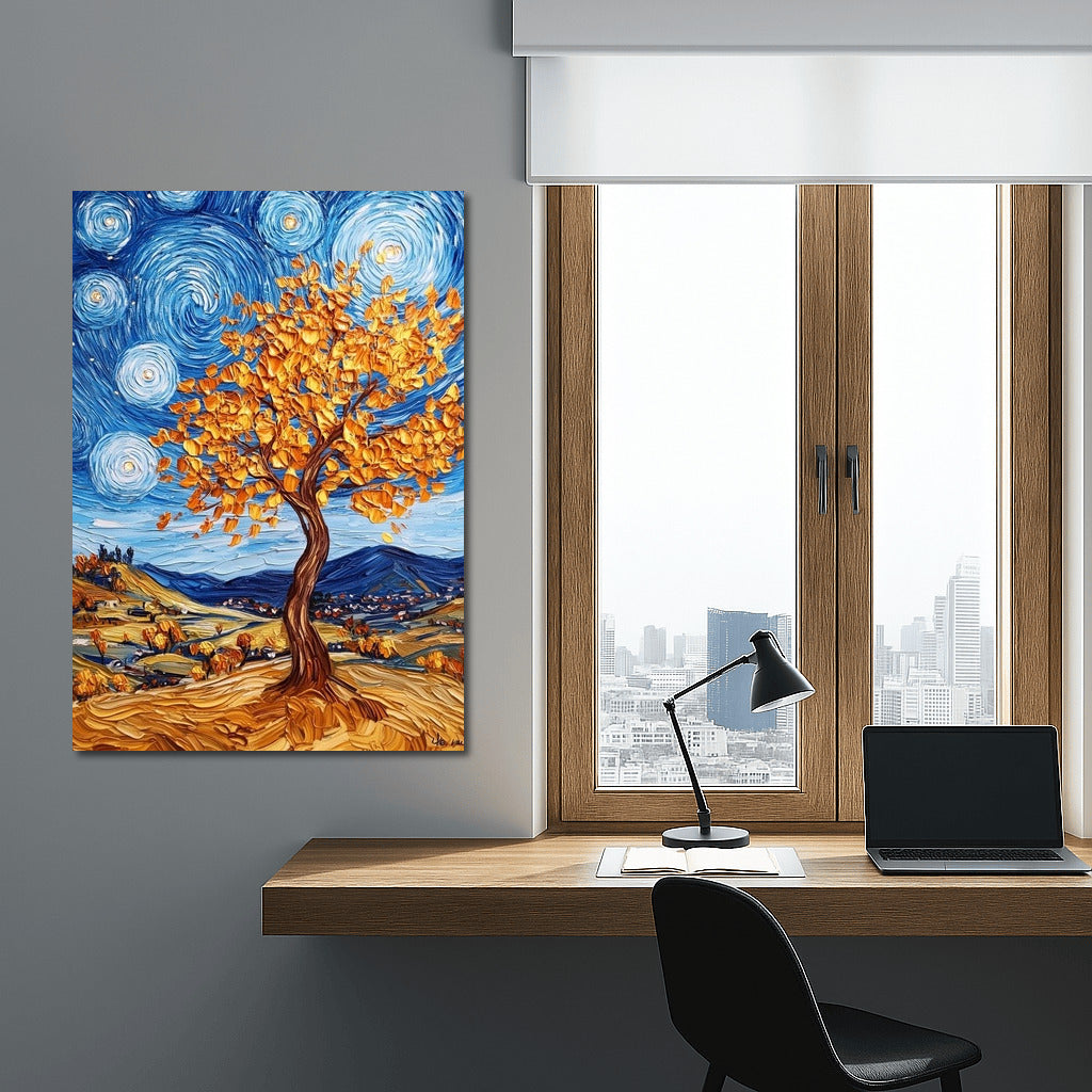 Mesmerizing wall art: golden tree under a swirl of starry sky. Discover the magic of nature in your space! See more from the collection: Mixed Wall Art