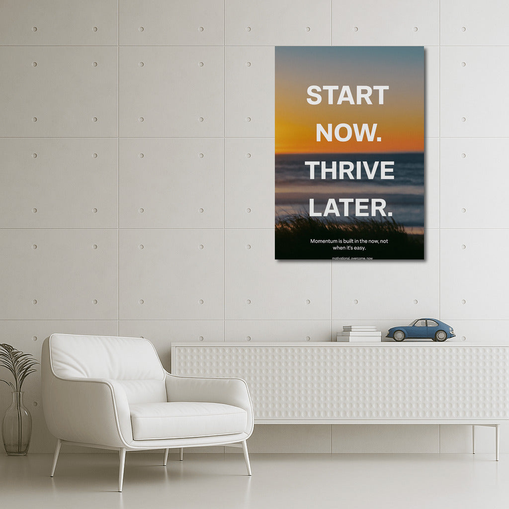 Wall art that inspires: Start now. Thrive later. A great motivator to overcome obstacles. See more from the collection: Inspirational & Motivational Quotes Art