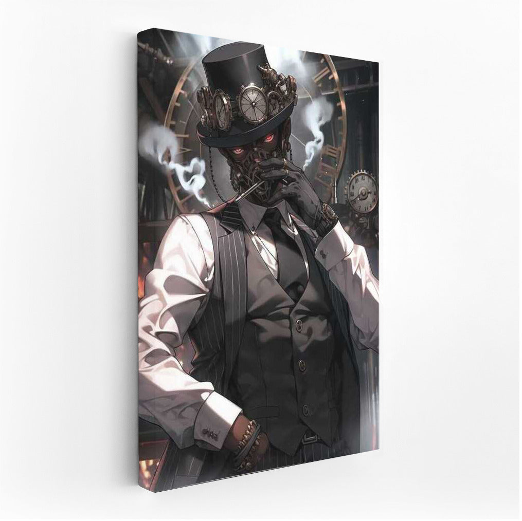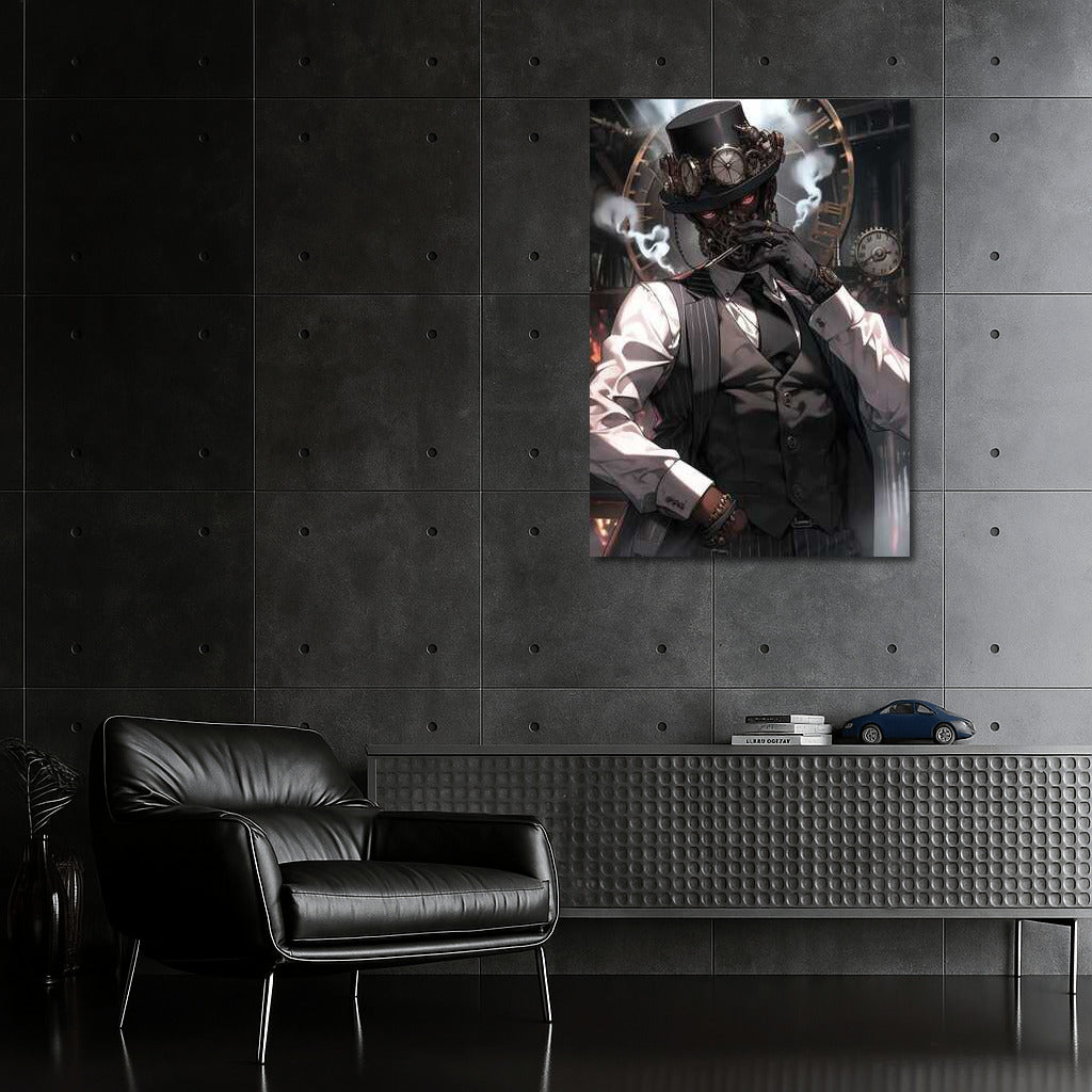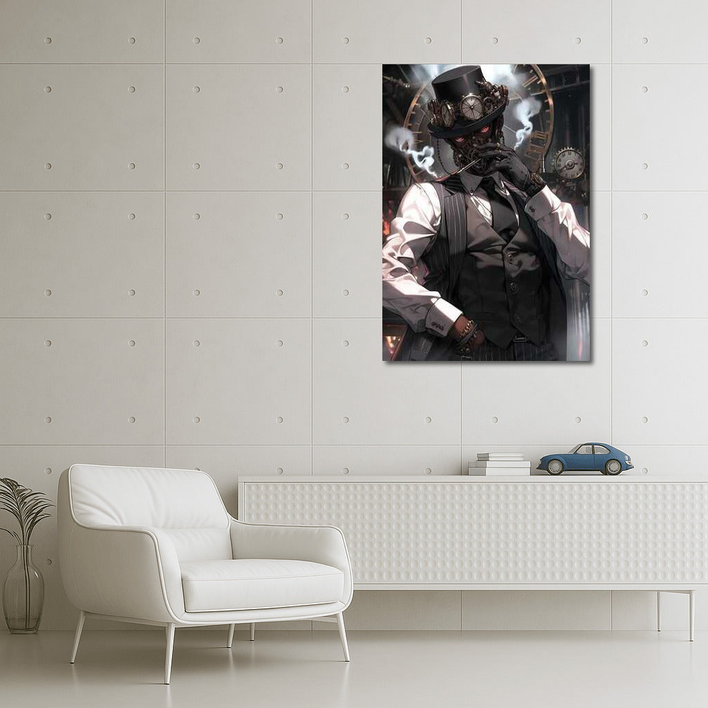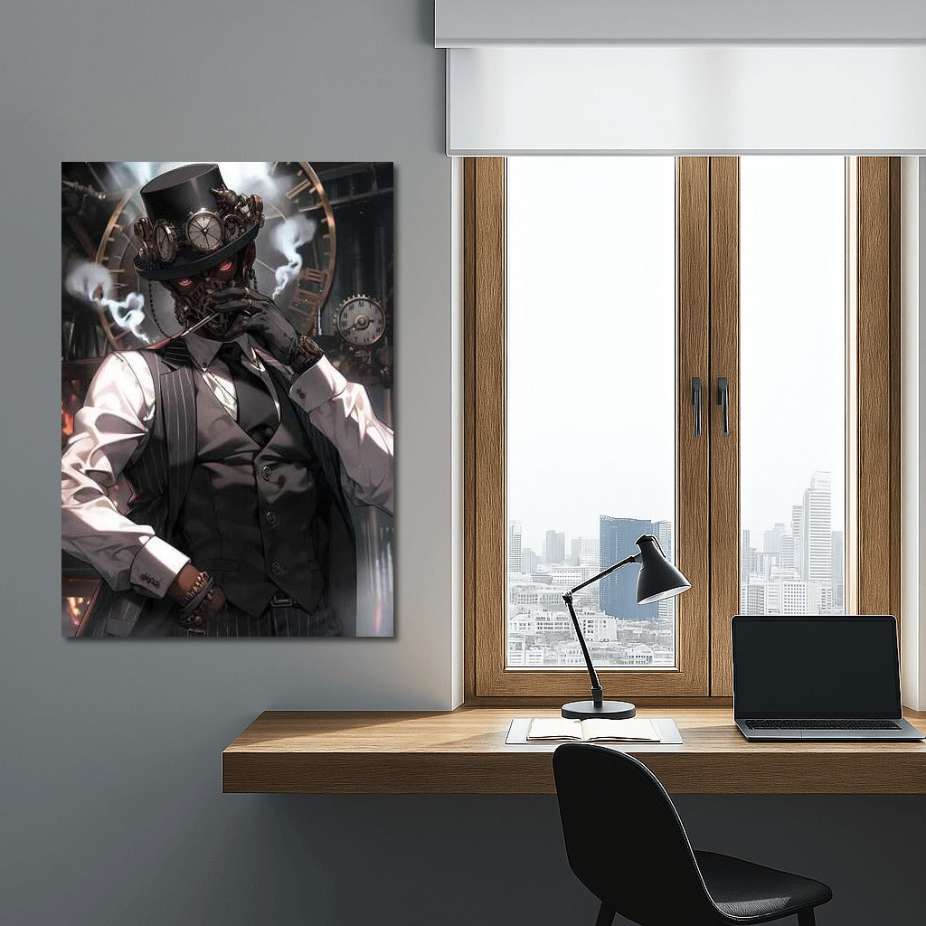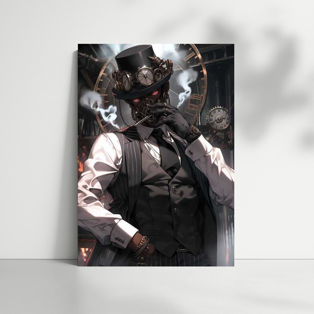 Stylish poster in the world of Steampunk: a mysterious hero with gears and a clock against the background of factory aesthetics. Ideal for your interior! See more from the collection: Steampunk Art