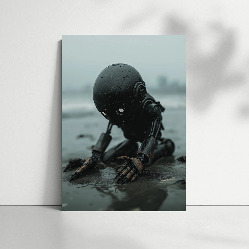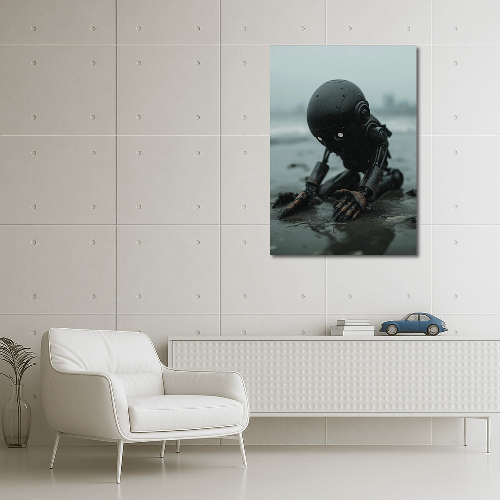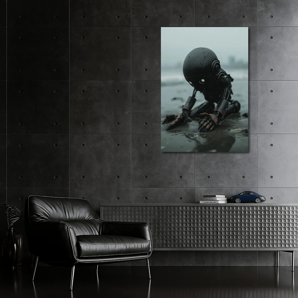 Metal figure on the beach. This poster is a fascinating dive into the world of the future, where art and technology merge. See more from the collection: Mixed Wall Art