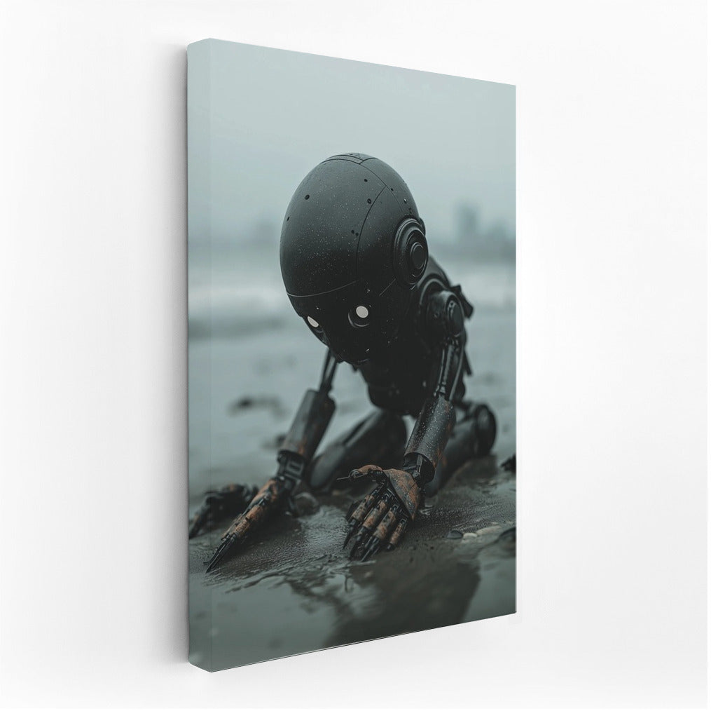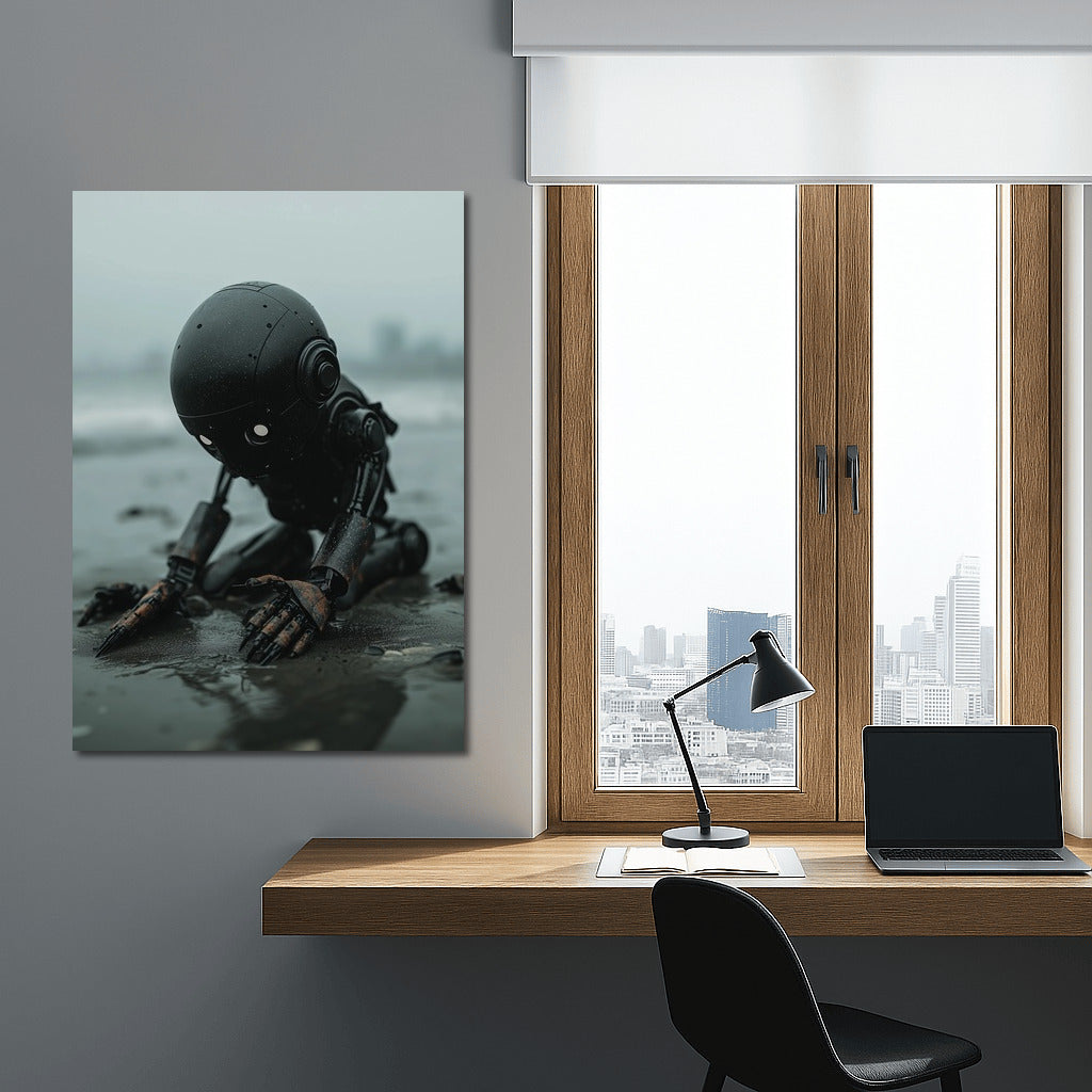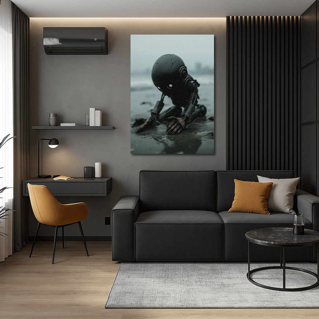 Metal figure on the beach. This poster is a fascinating dive into the world of the future, where art and technology merge. See more from the collection: Mixed Wall Art