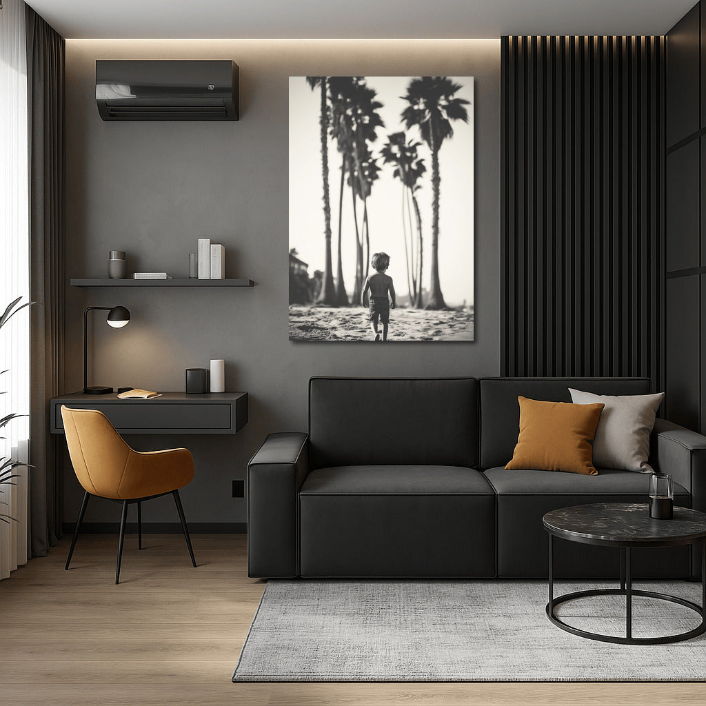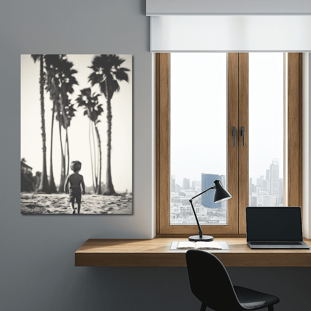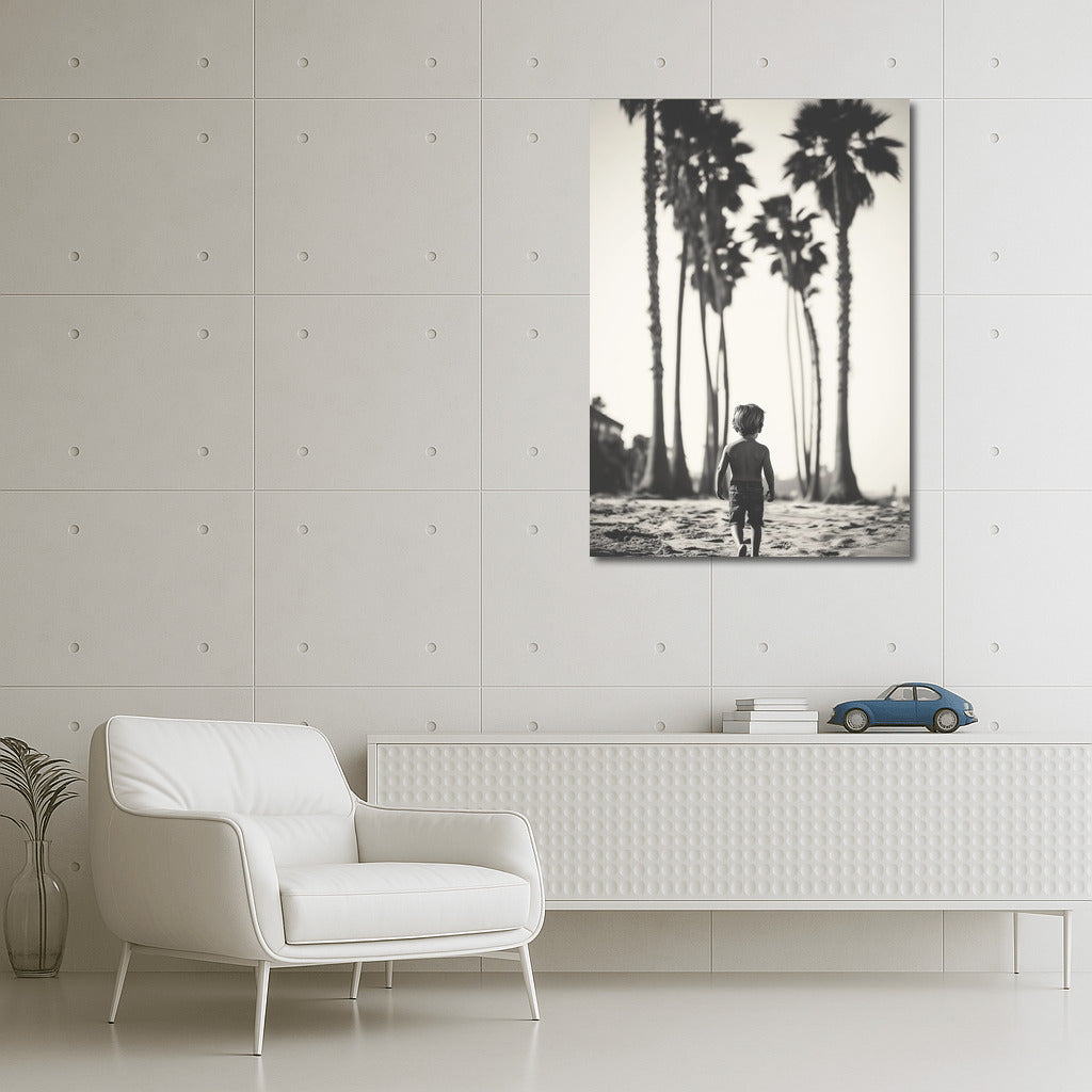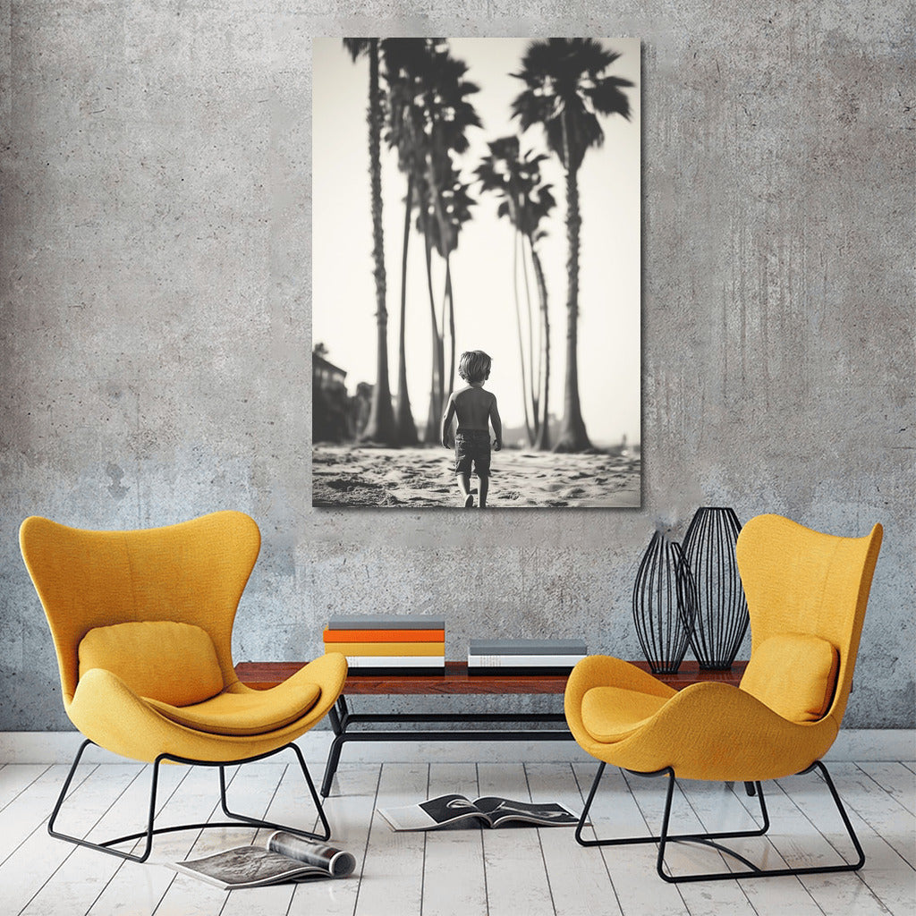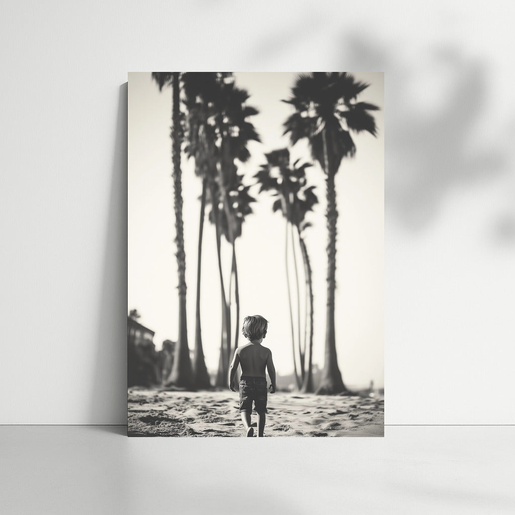 Sunny poster: a child walks towards adventure among slender palm trees. Wall art about freedom and serenity. See more from the collection: Black and White Art