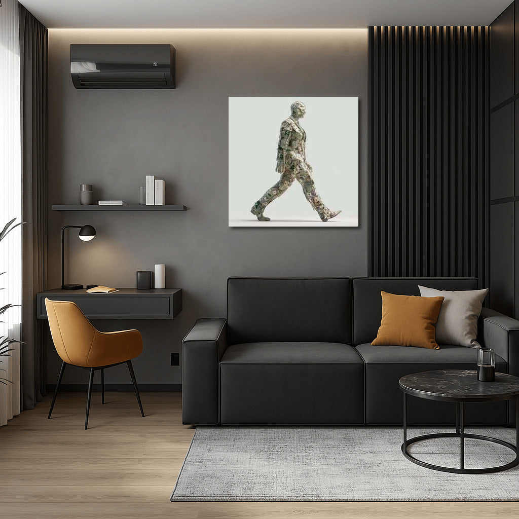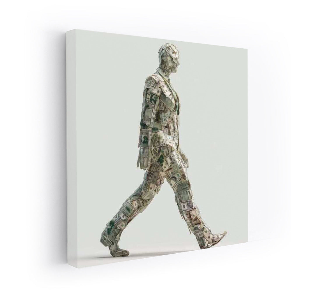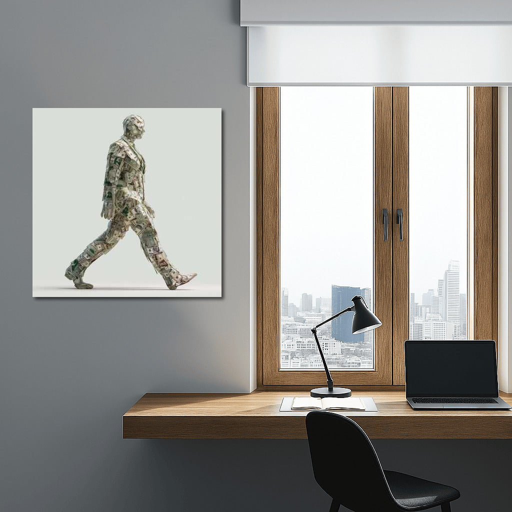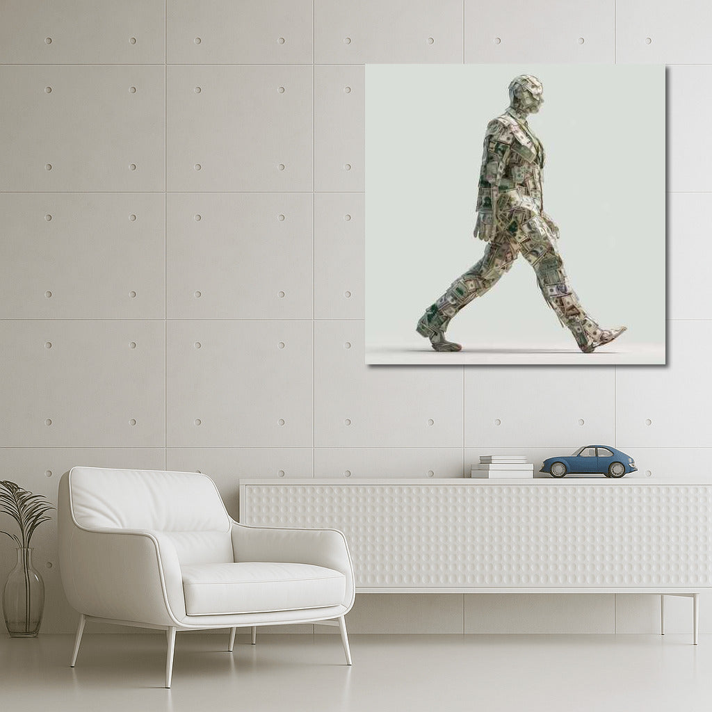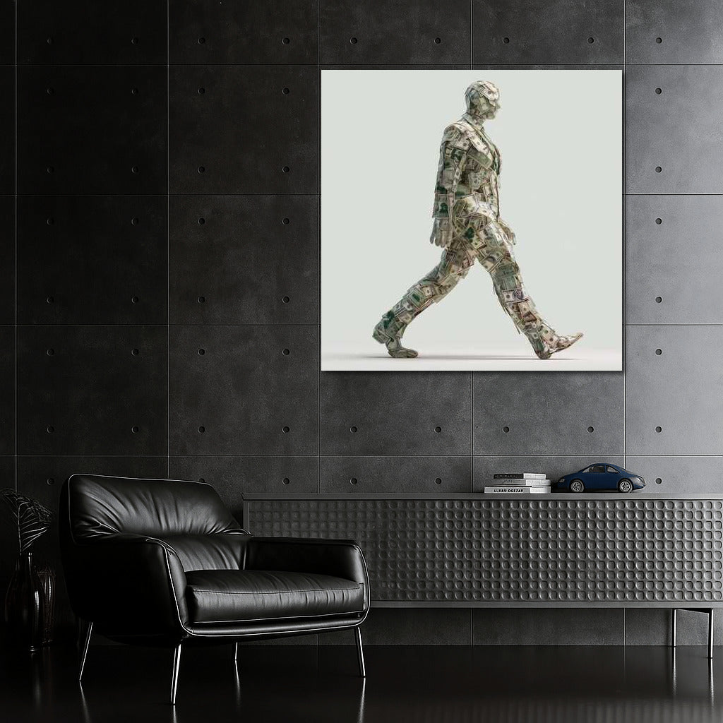 A man made of money walks towards success in this unique wall art. The poster symbolizes strength and movement towards a dream. See more from the collection: Money Art