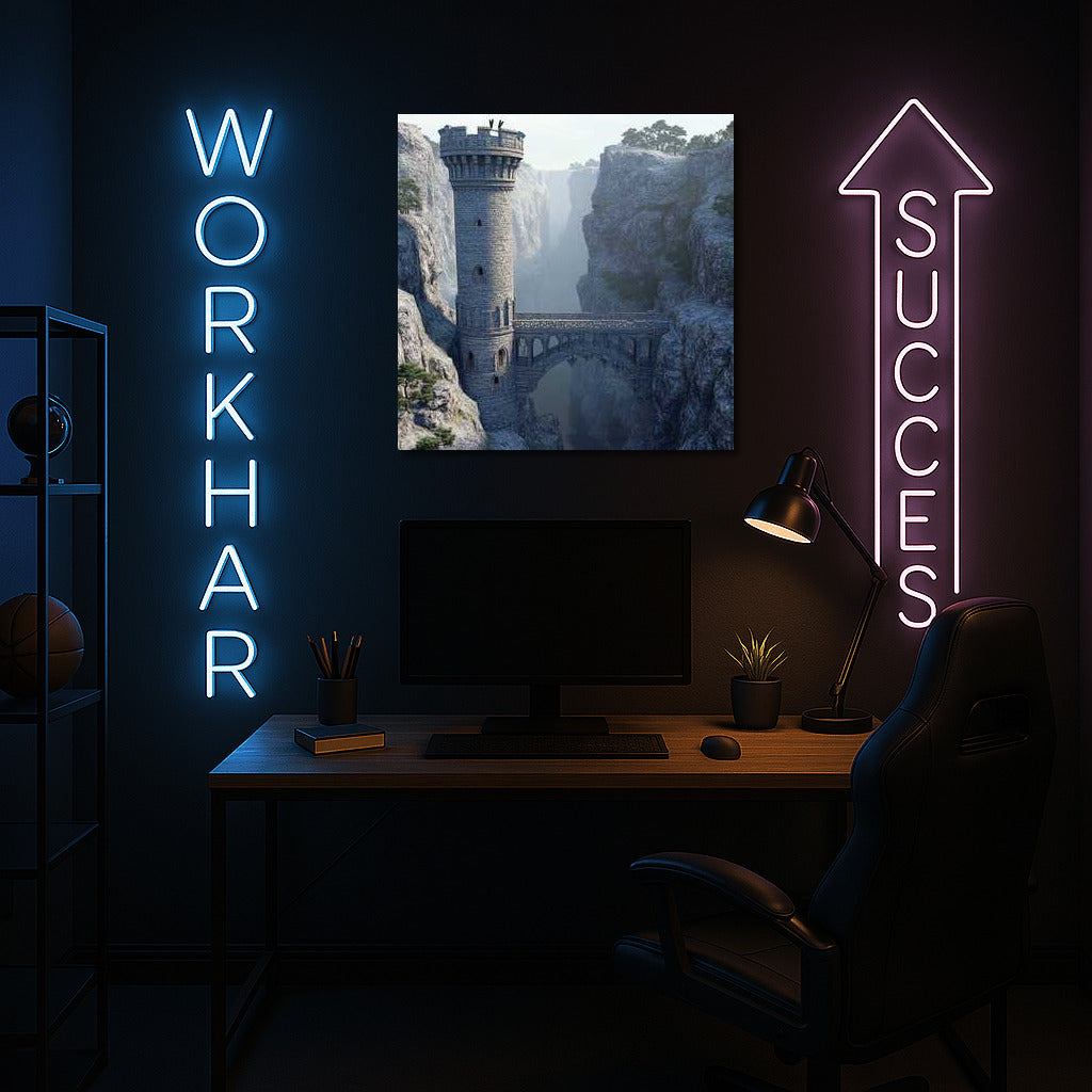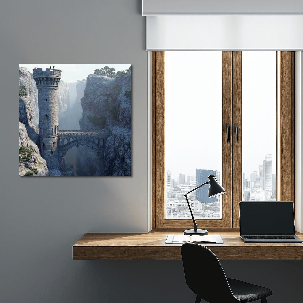 Immerse yourself in a fantasy world with wall art featuring a stone tower overlooking a mysterious canyon. See more from the collection: Fantasy Art