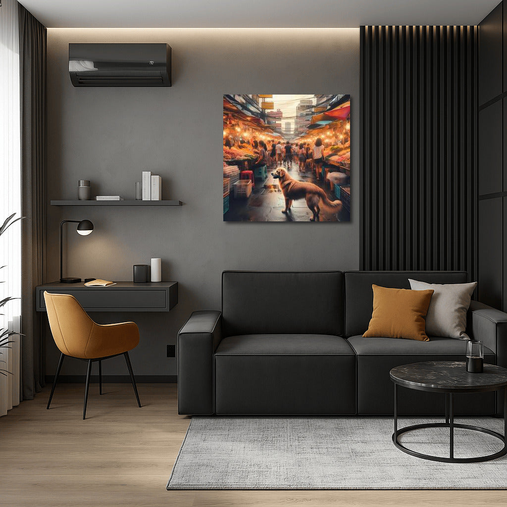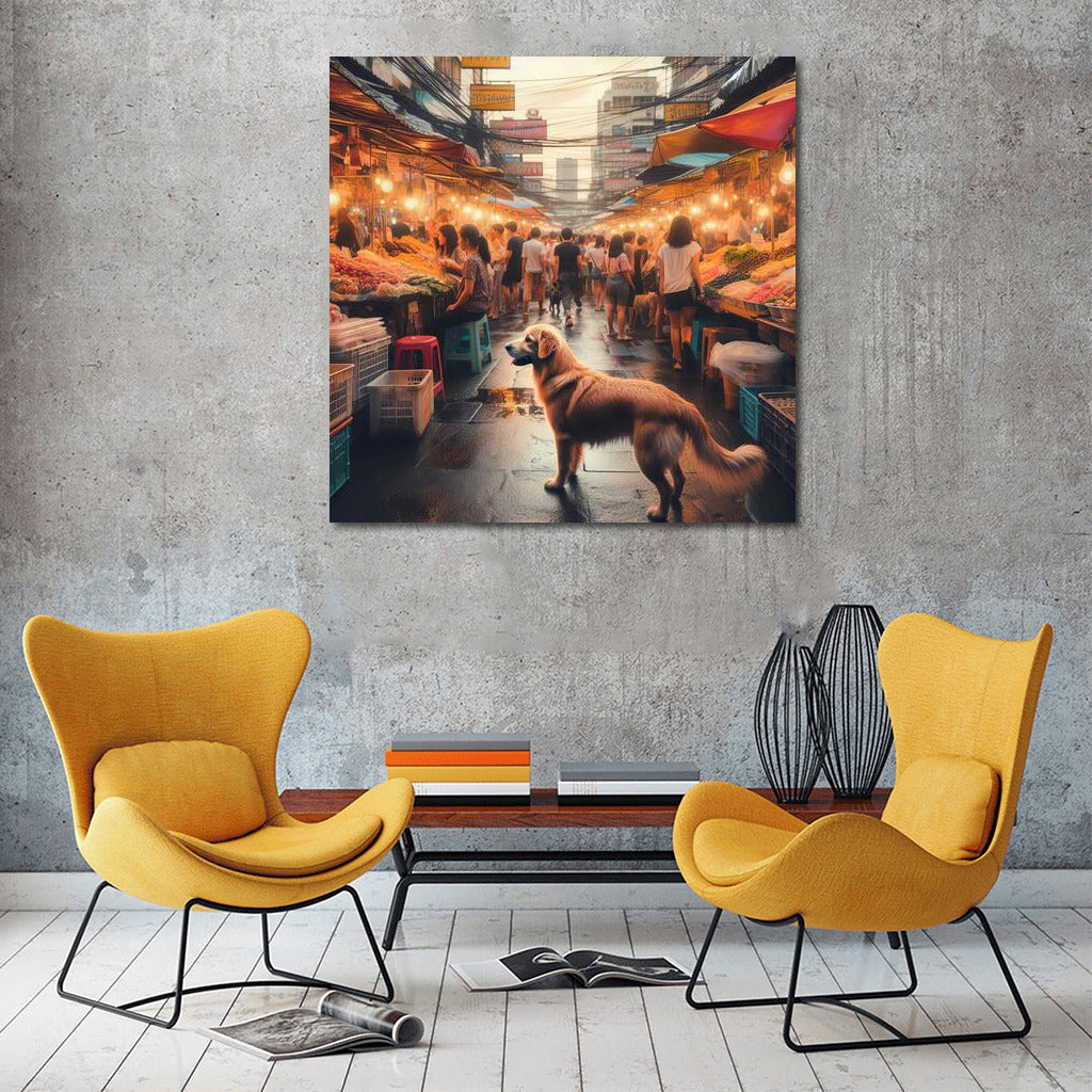 The vibrant painting transports you to a bustling street market, where lantern lights and a smiling dog create a warm atmosphere. Wall art for the soul. See more from the collection: Animals Art