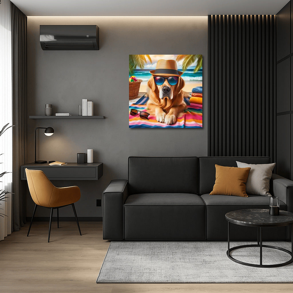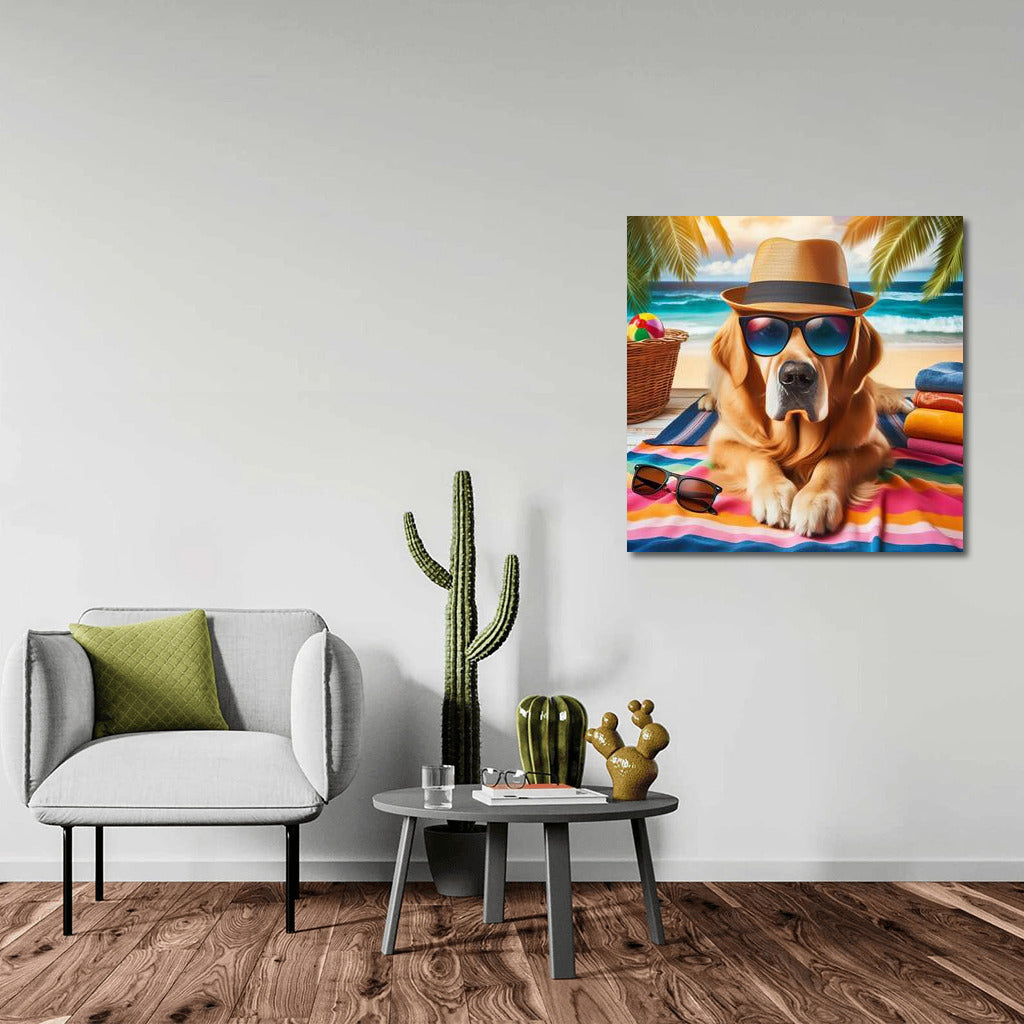 Stylish Beach Vacation: Dog in a Hat on the Fashionable Beach Wall Art