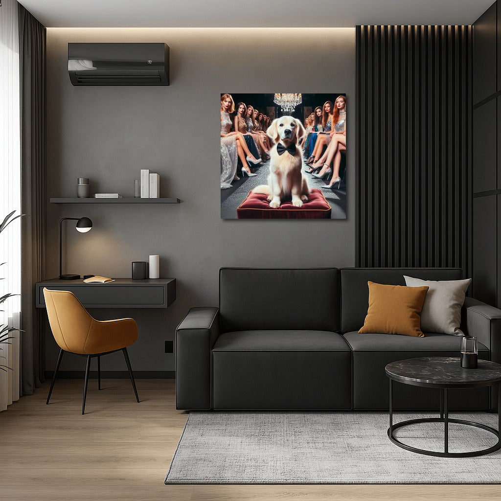An elegant dog at the center of a fashion show. This poster will bring your wall art to life with stylish charm. See more from the collection: Animals Art