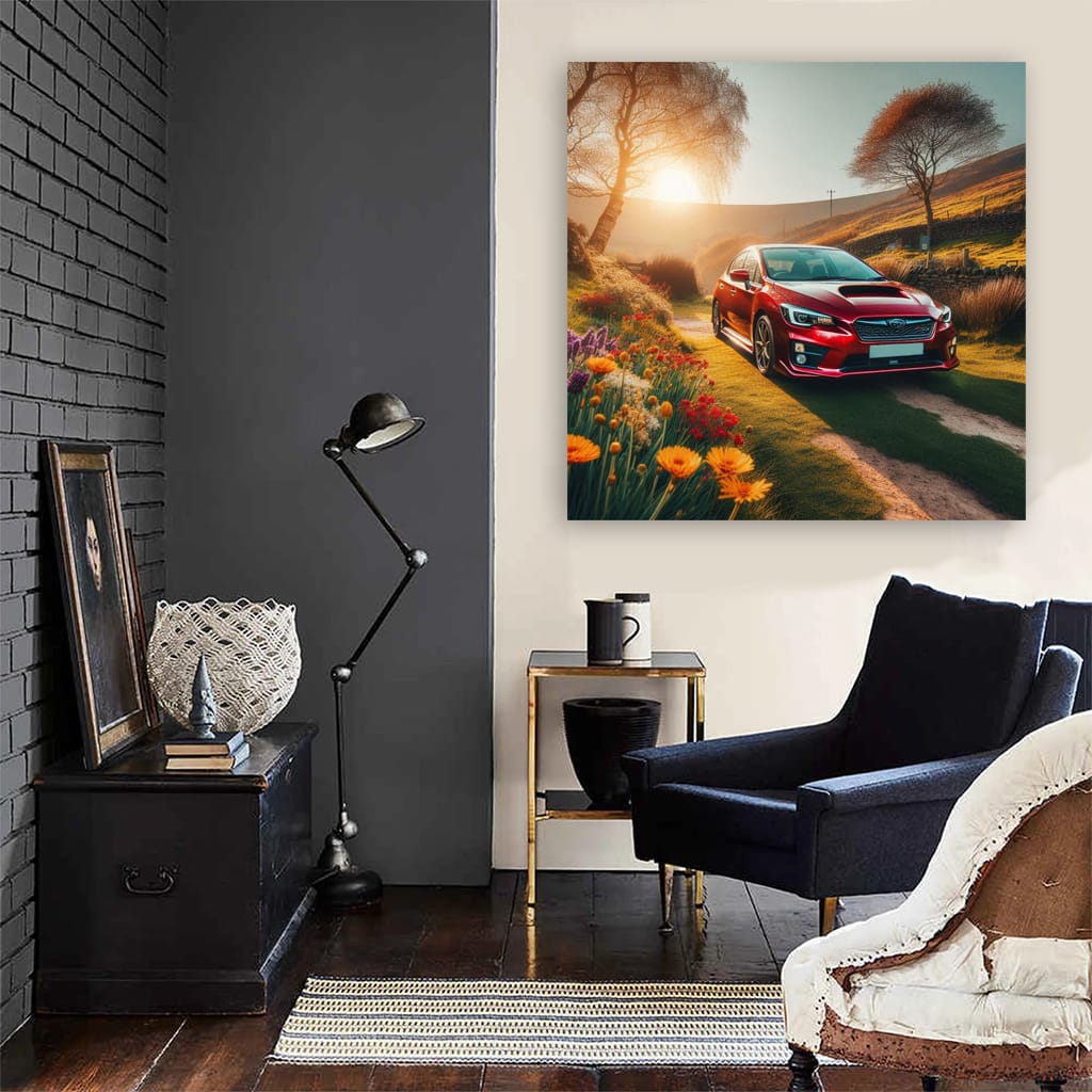Turn on the ignition and feel the roar of the engine through this painting. A poster with a Subaru Impreza in sunny weather is wall art for real car enthusiasts. This beast on your wall will charge you with adrenaline every day and inspire you to new feats. See more from the collection: Subaru Art