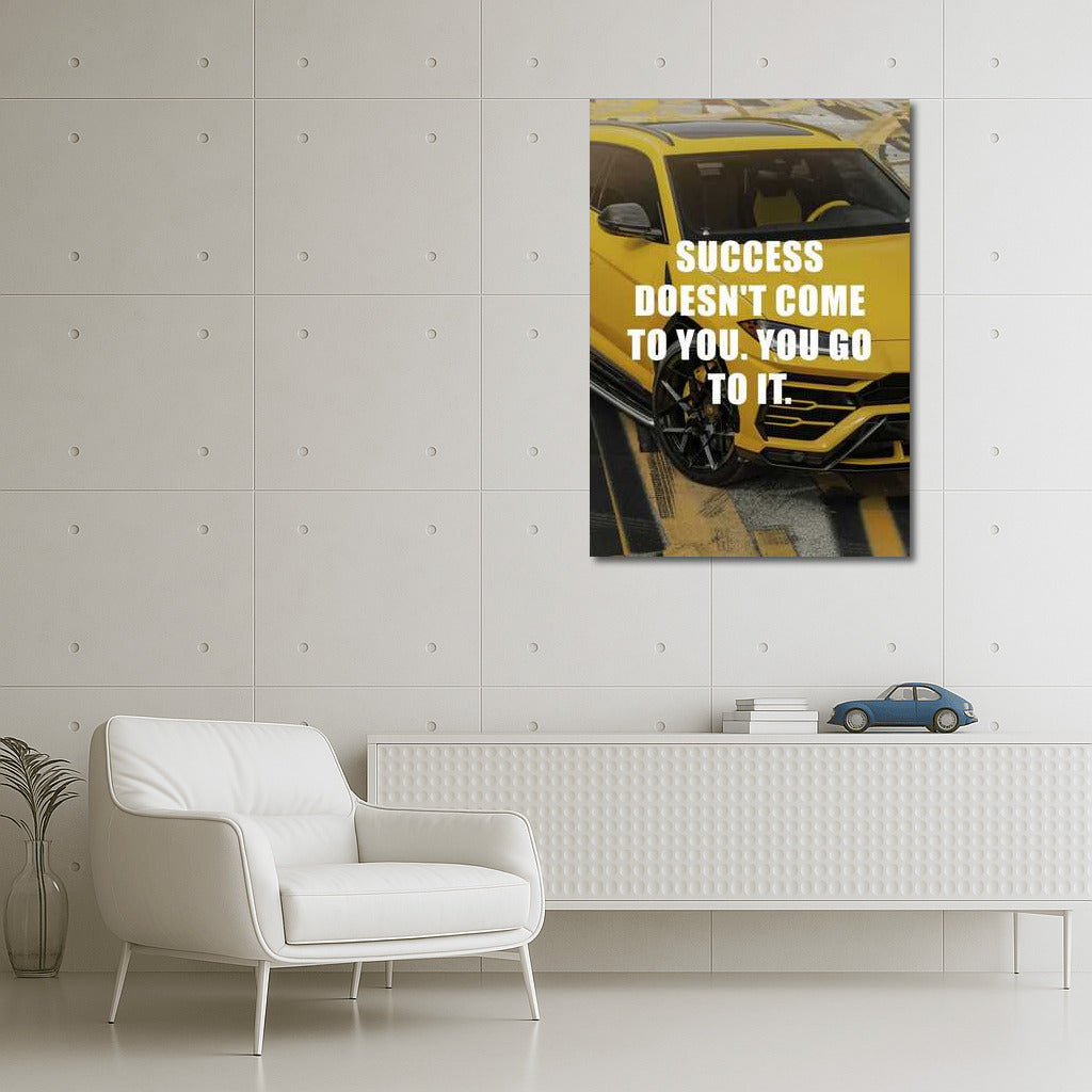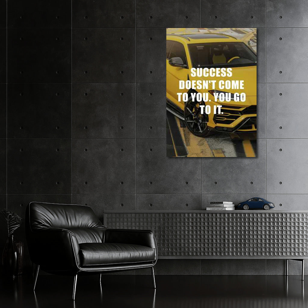 Text on the painting: SUCCESS DOESN'T COME TO YOU. YOU GO TO IT. Capture success with this poster! Everyday wall art for motivation and inspiration. Move towards success! See more from the collection: Inspirational & Motivational Quotes Art