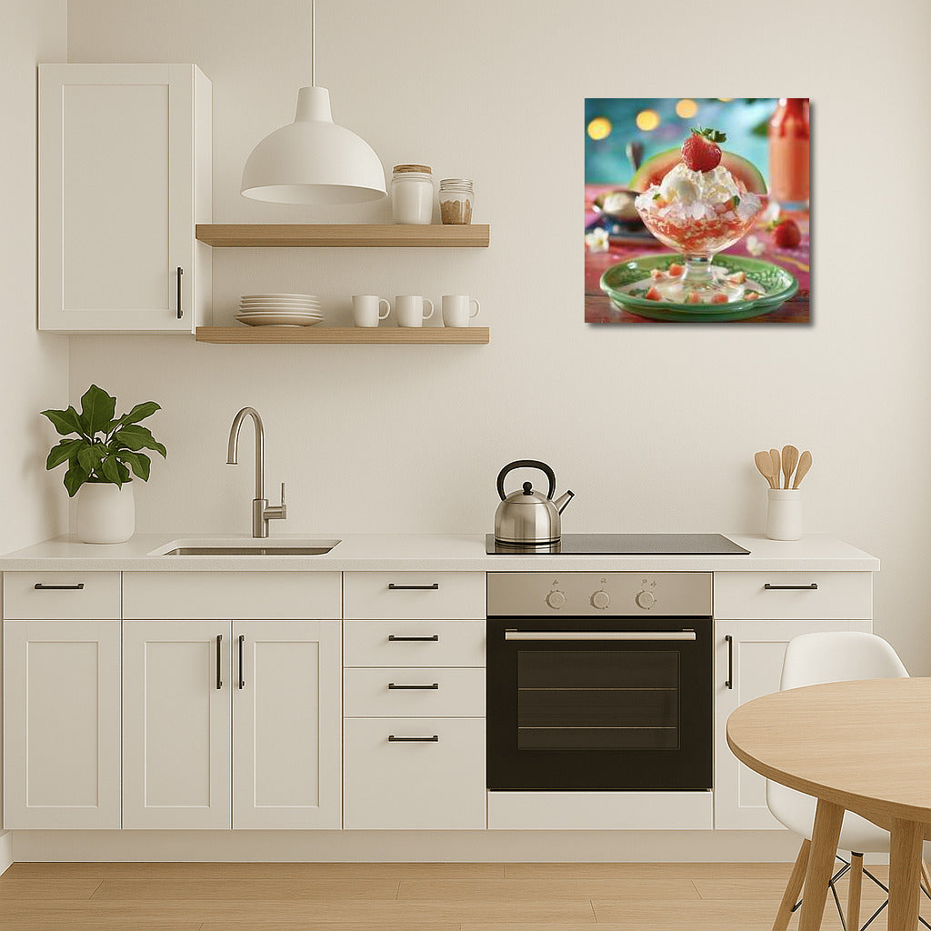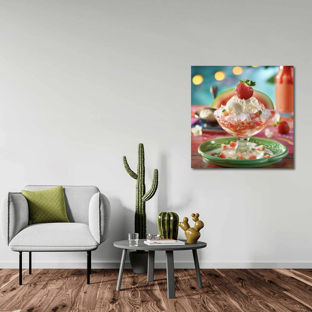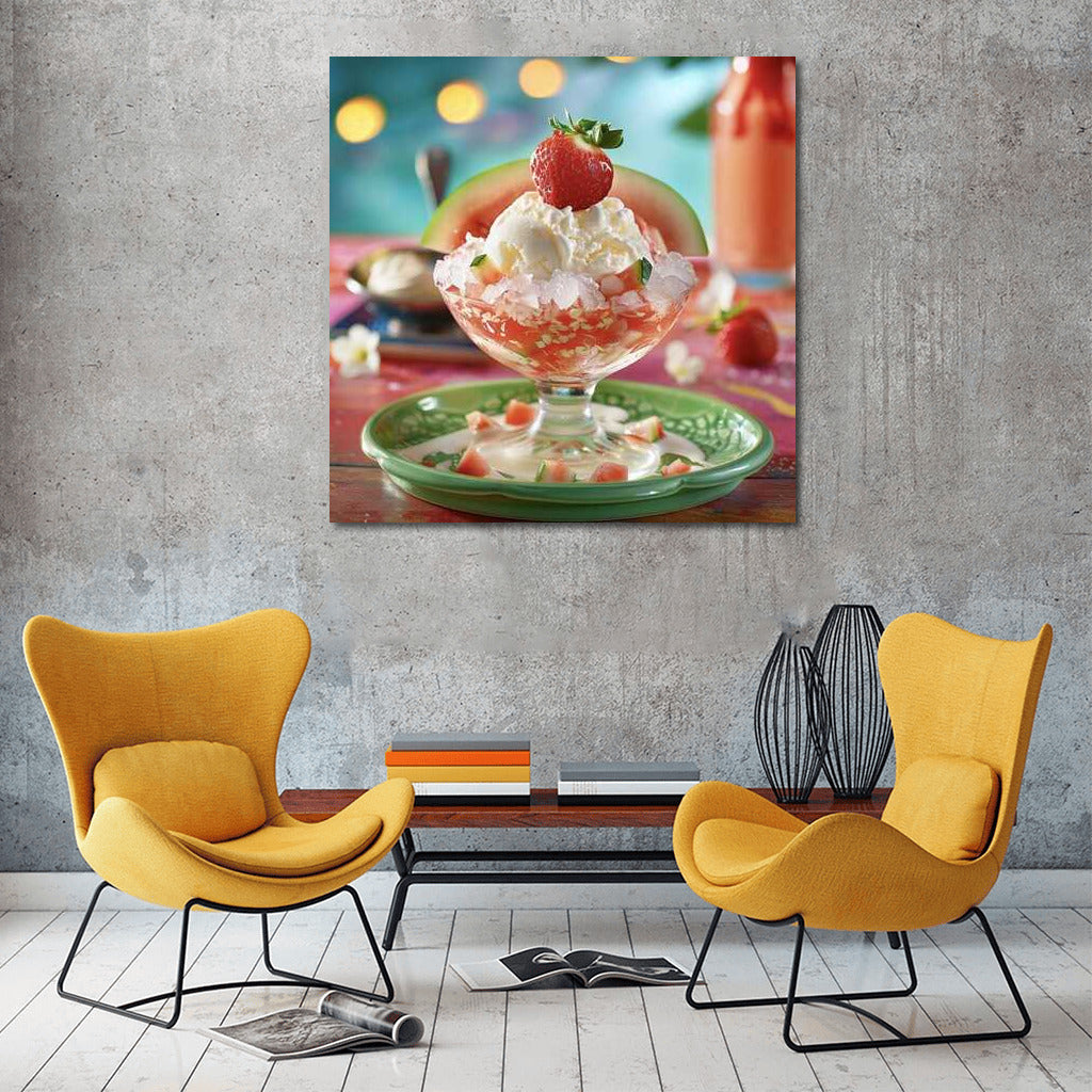 A delicate poster with a summer dessert: strawberries and watermelon in icy freshness will create an atmosphere on your wall art. See more from the collection: Food Art