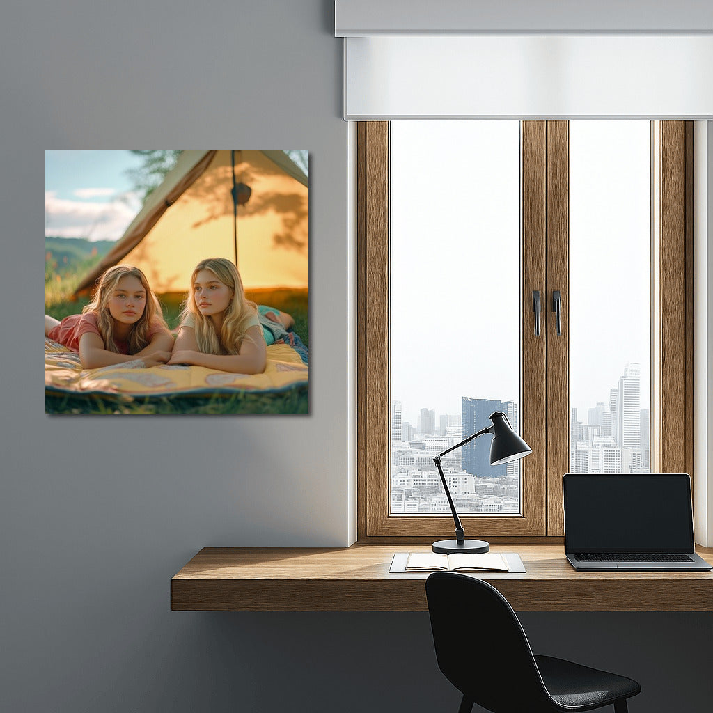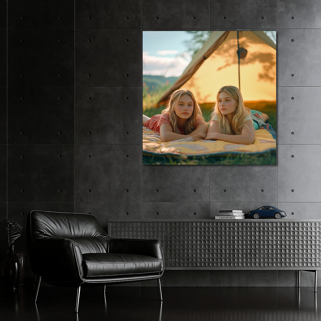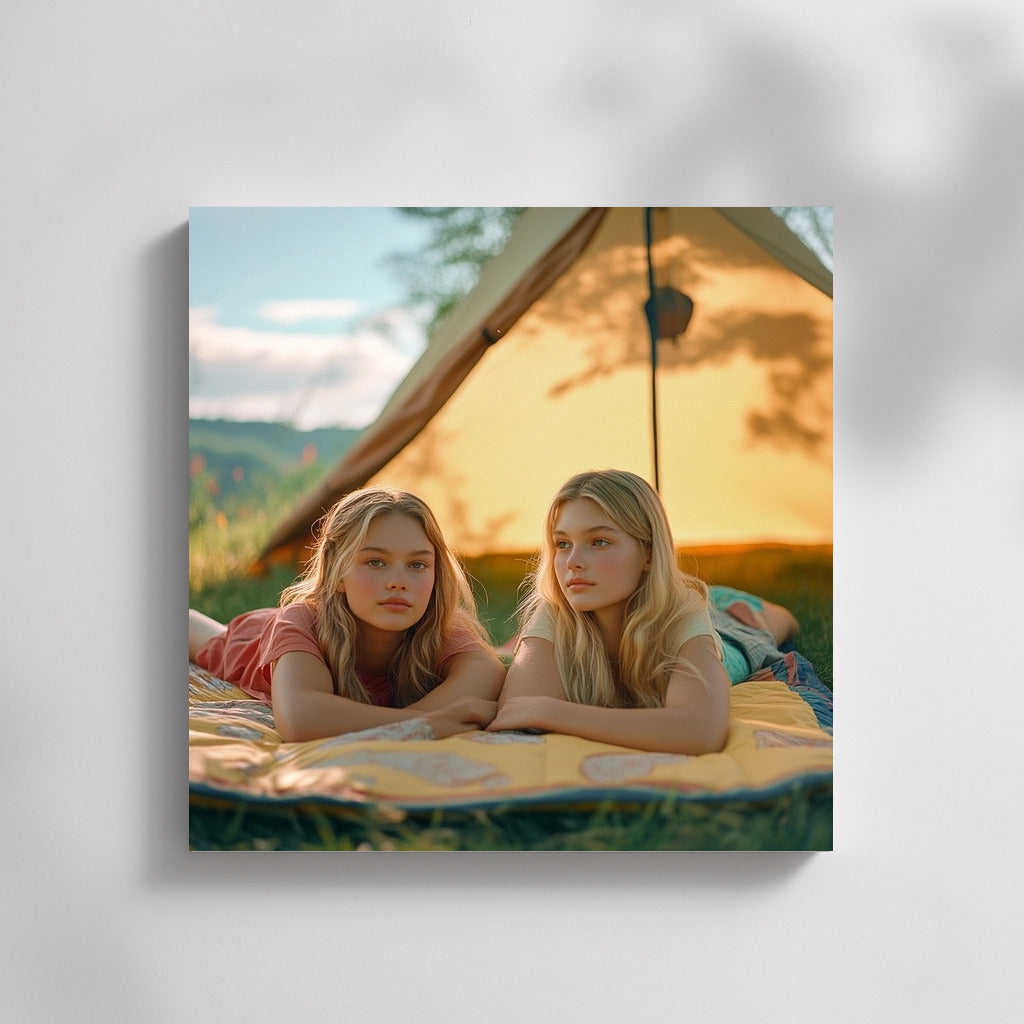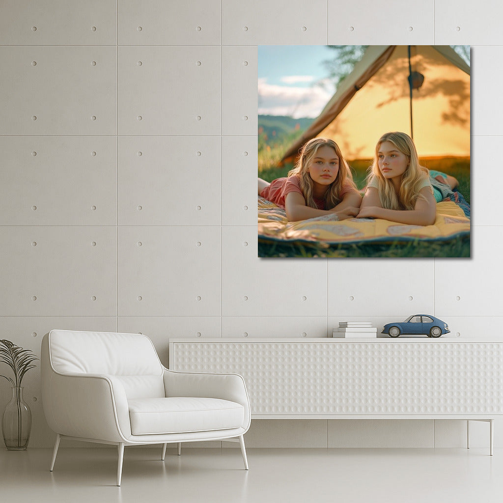 The image embodies a summer holiday: two figures on a blanket in front of a tent. A bright poster for inspiration and coziness. See more from the collection: Wall Art with Women
