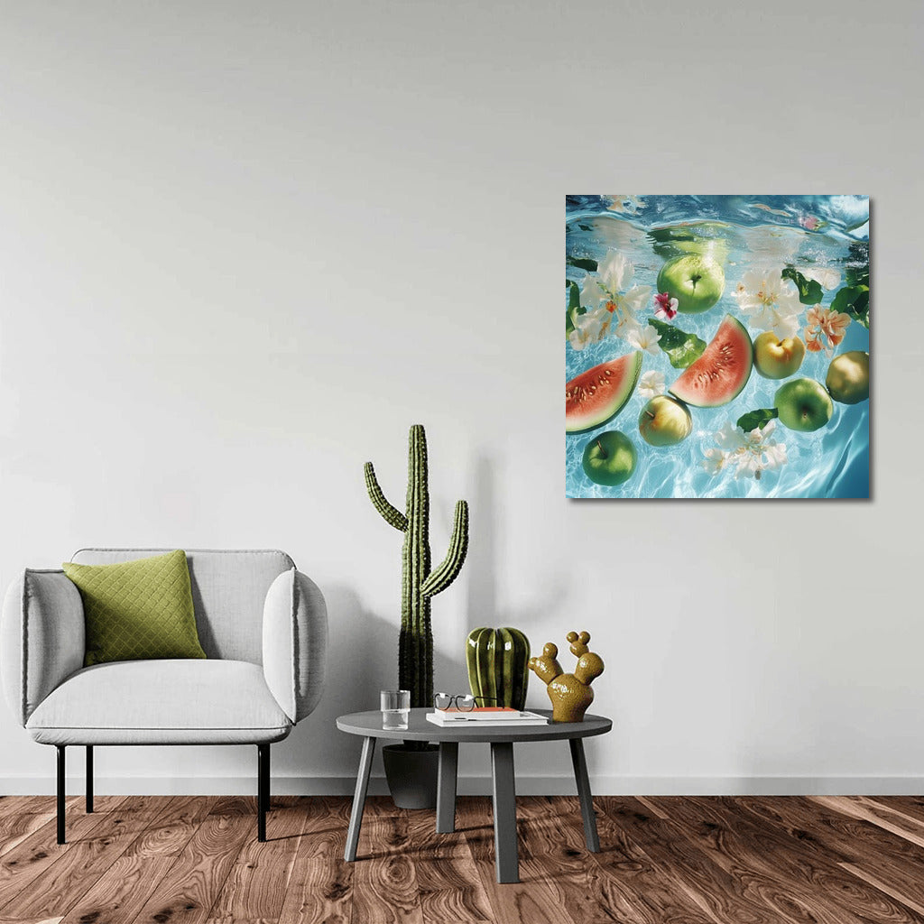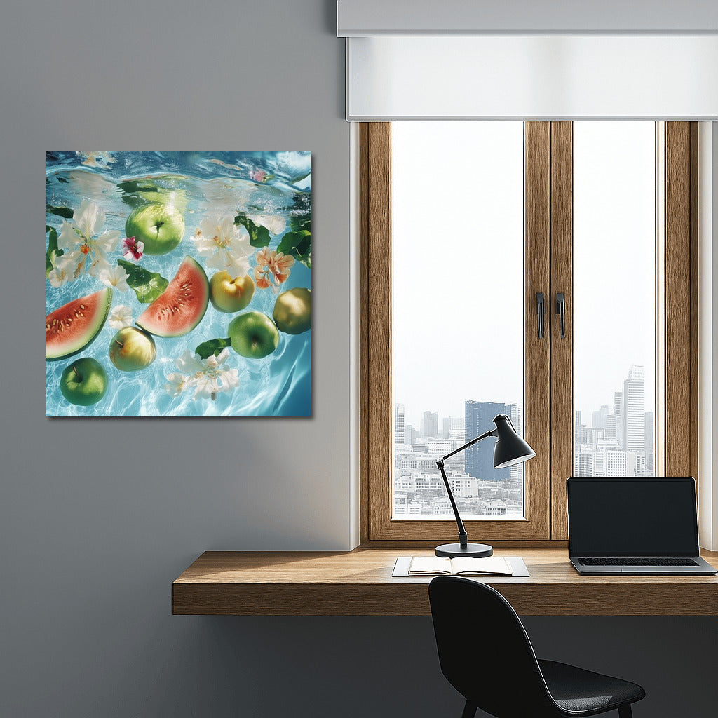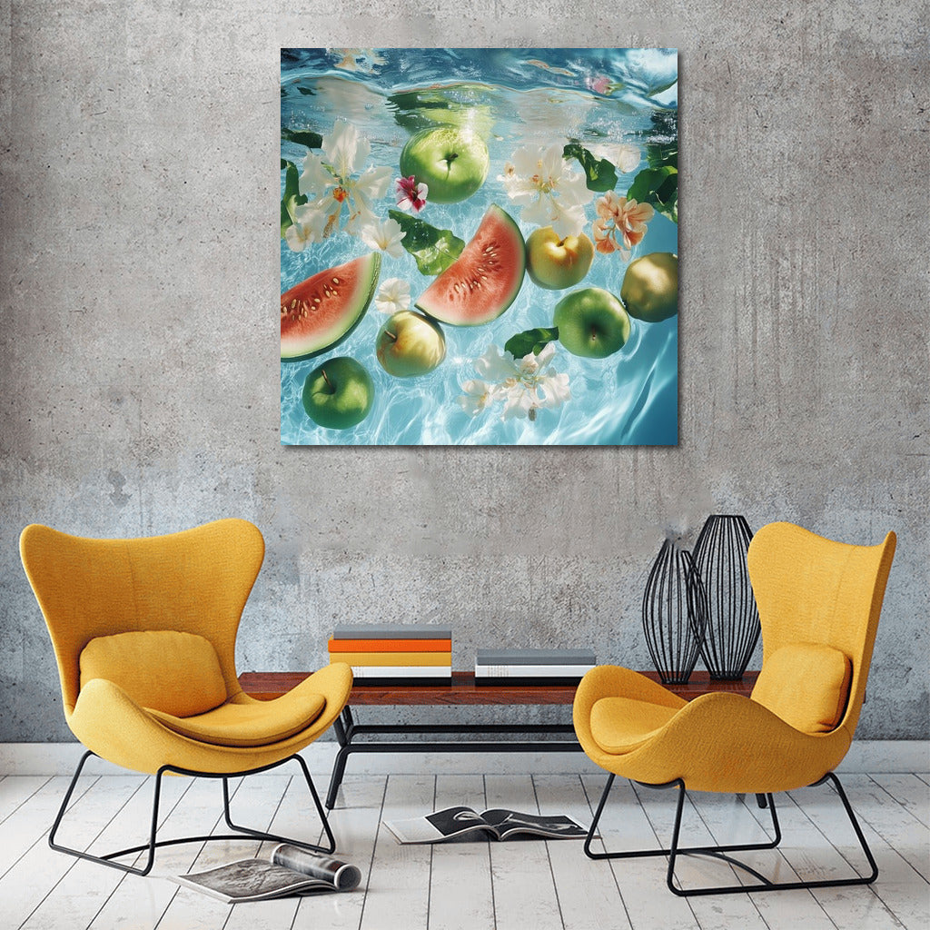 Juicy colors of summer: watermelons and apples floating in crystal water. This poster will become a bright accent of your wall art! See more from the collection: Food Art