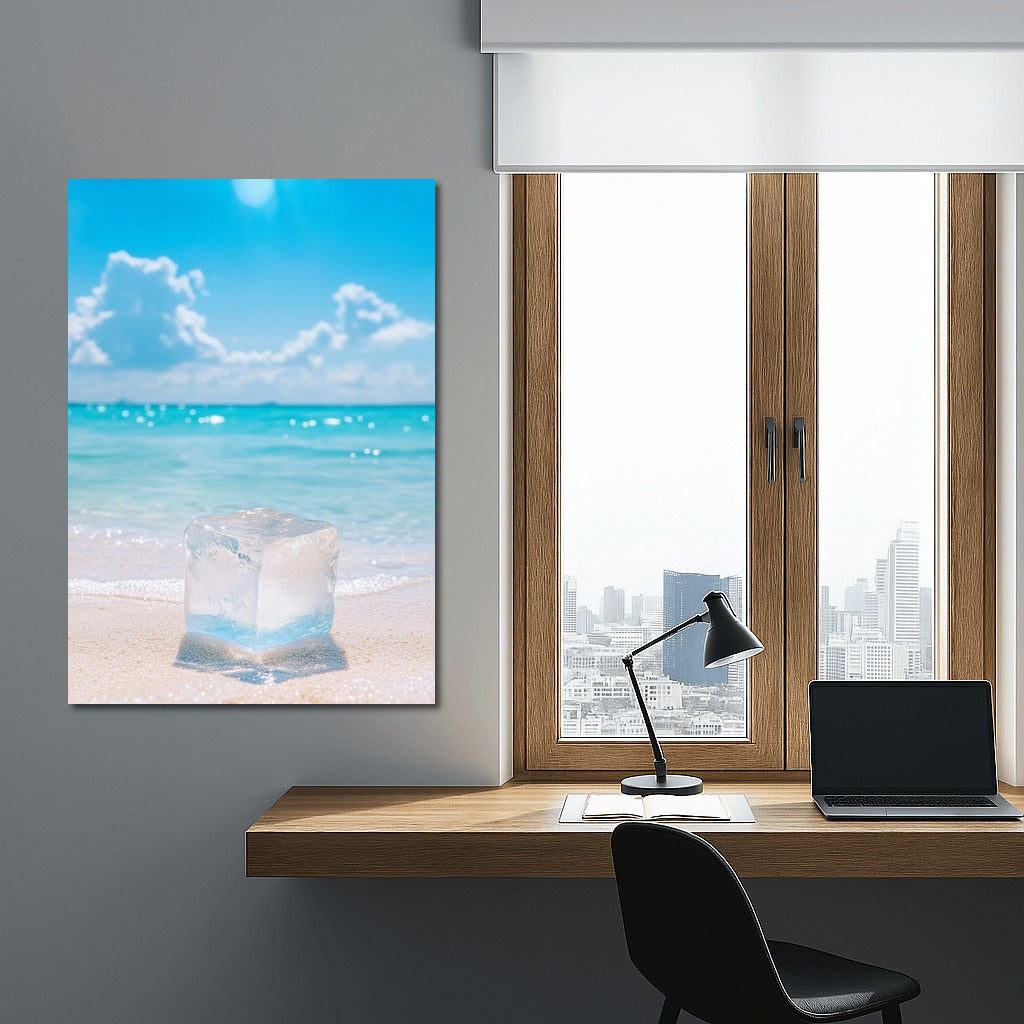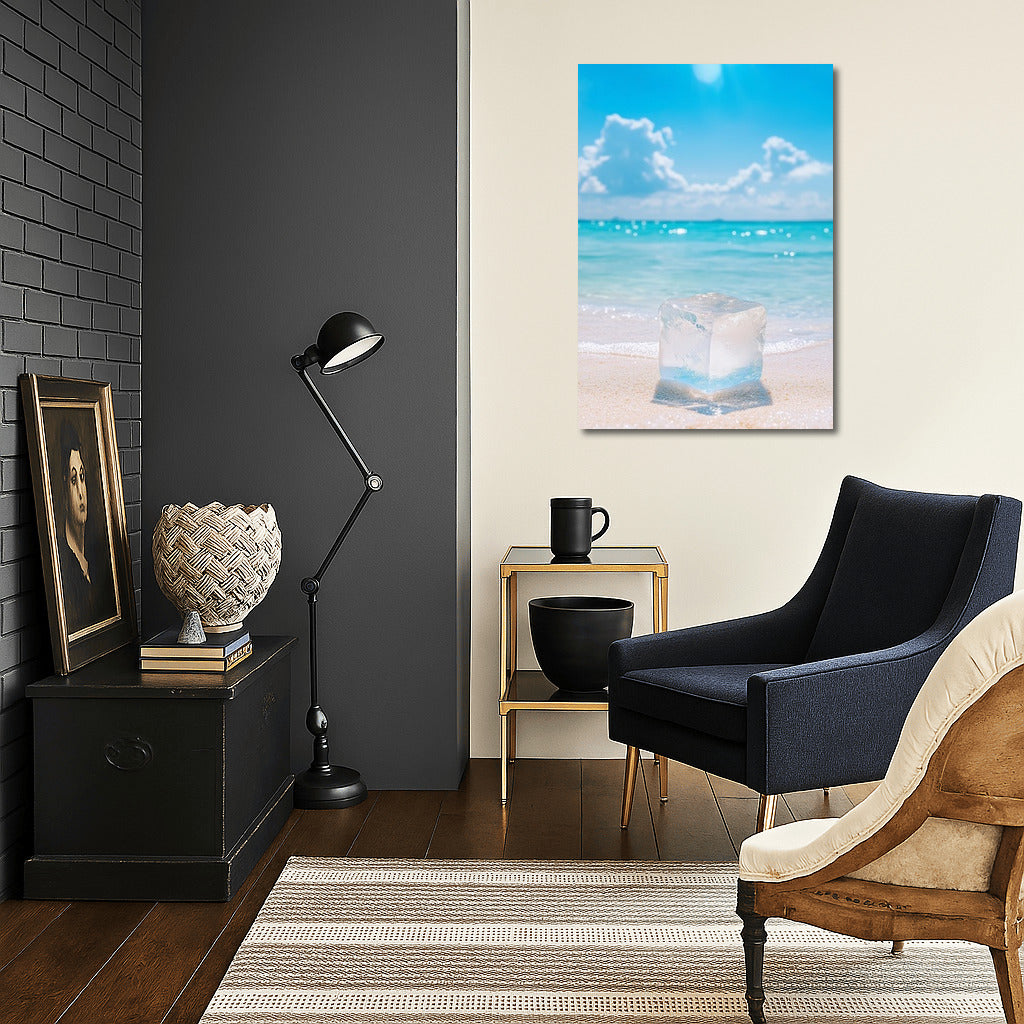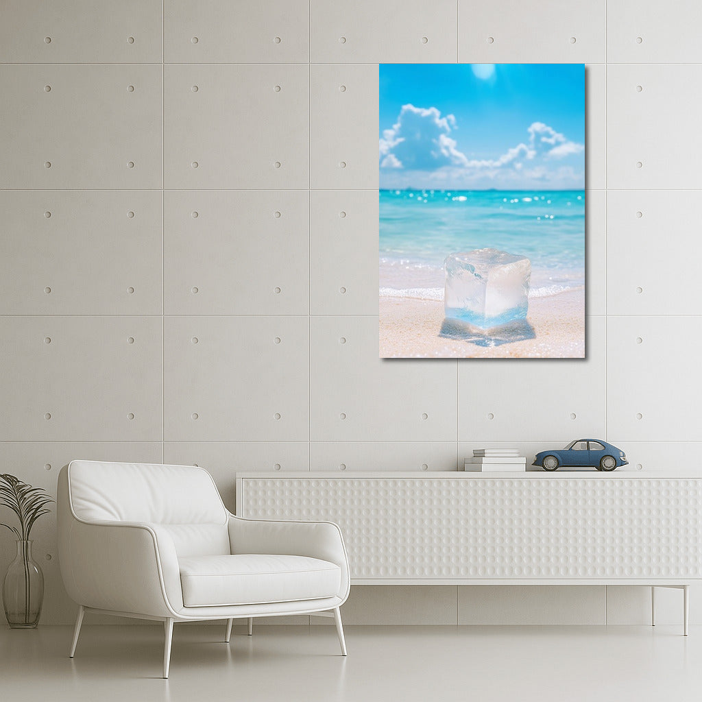 An ice cube in the sun on the seashore is a poster that will bring freshness and brightness to any space. See more from the collection: Mixed Wall Art