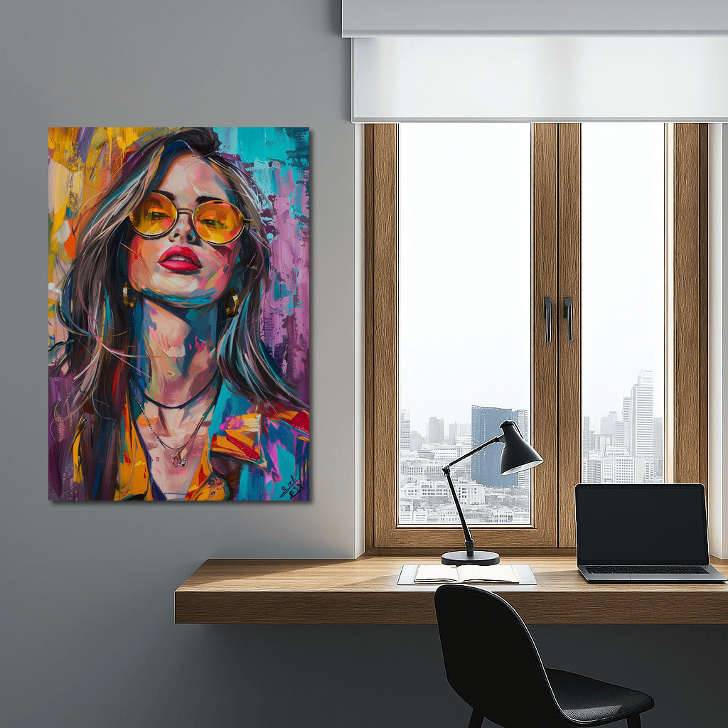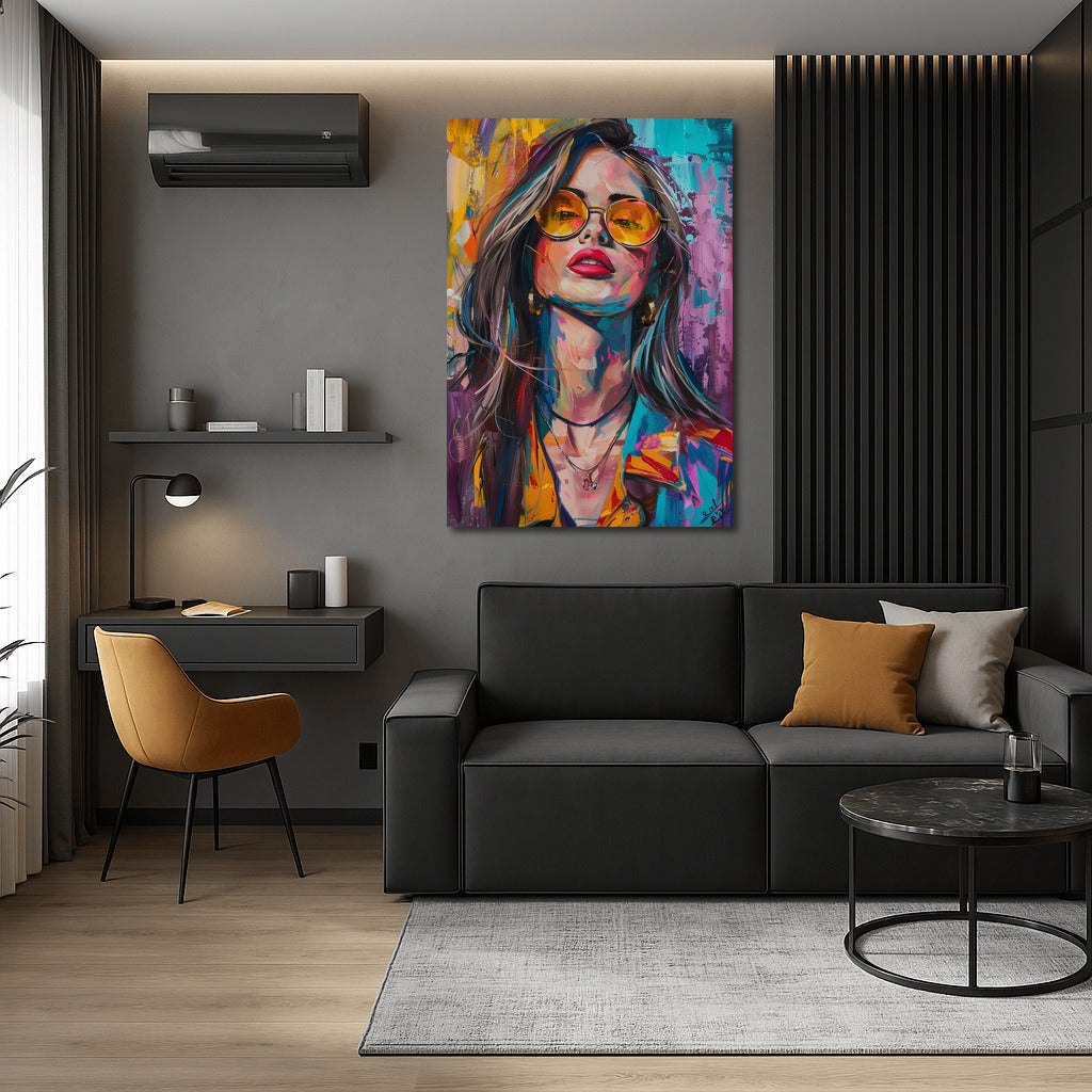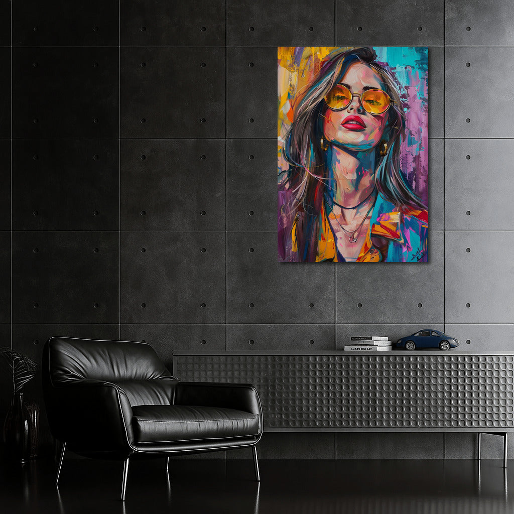 A bright painting with a spectacular woman in sunglasses. This poster will add boldness to your interior! Wall art for the brave. See more from the collection: Wall Art with Women