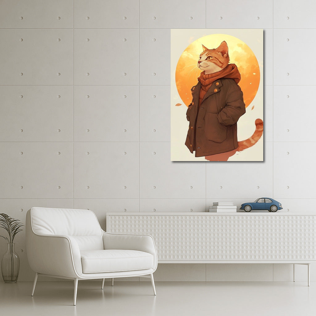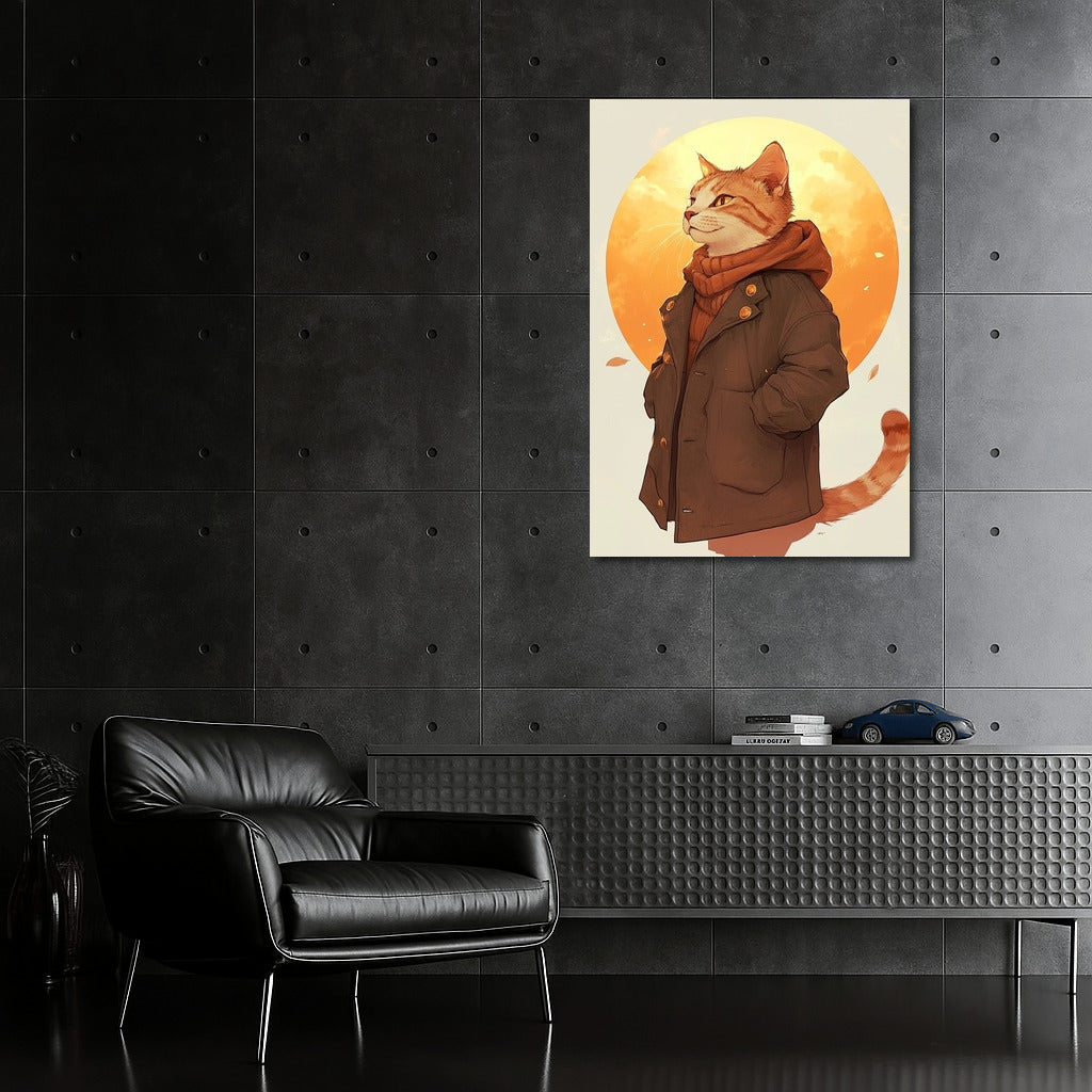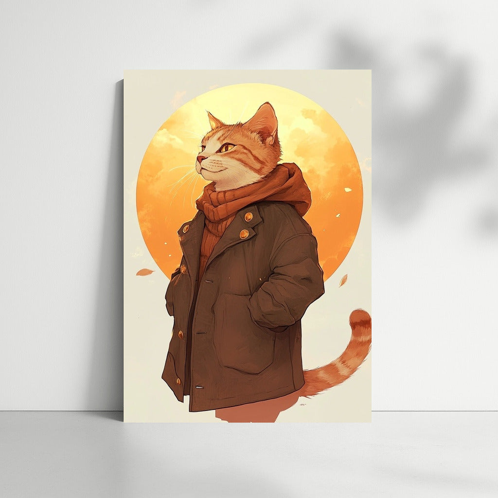 A poster with a stylish cat in a coat against the backdrop of a shining sun. Perfect wall art for lovers of unique design! See more from the collection: Animals Art