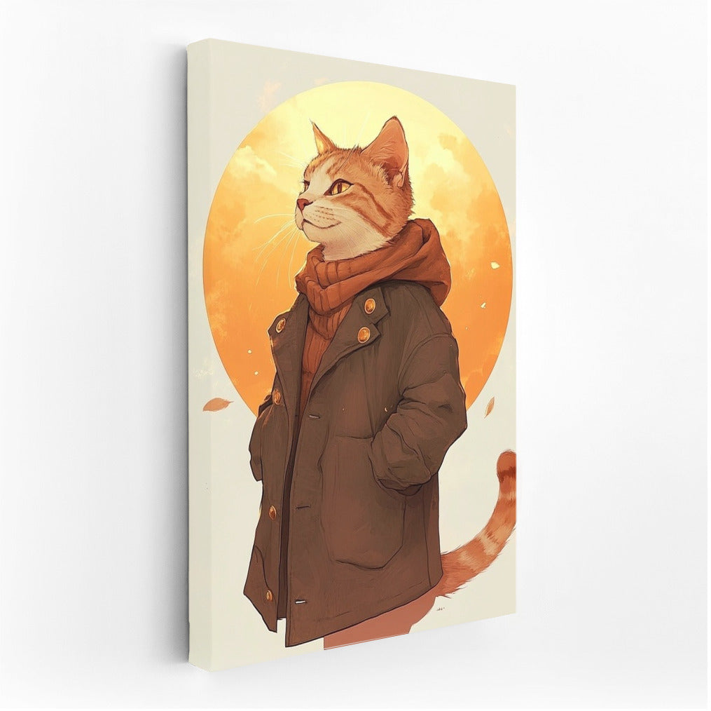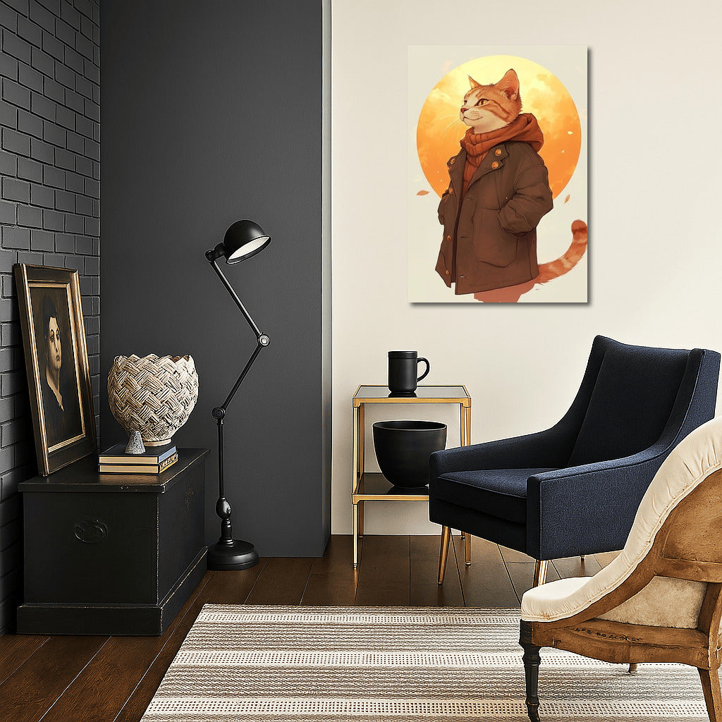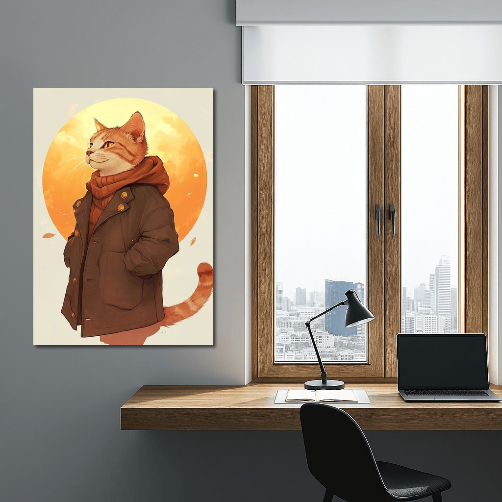 A poster with a stylish cat in a coat against the backdrop of a shining sun. Perfect wall art for lovers of unique design! See more from the collection: Animals Art