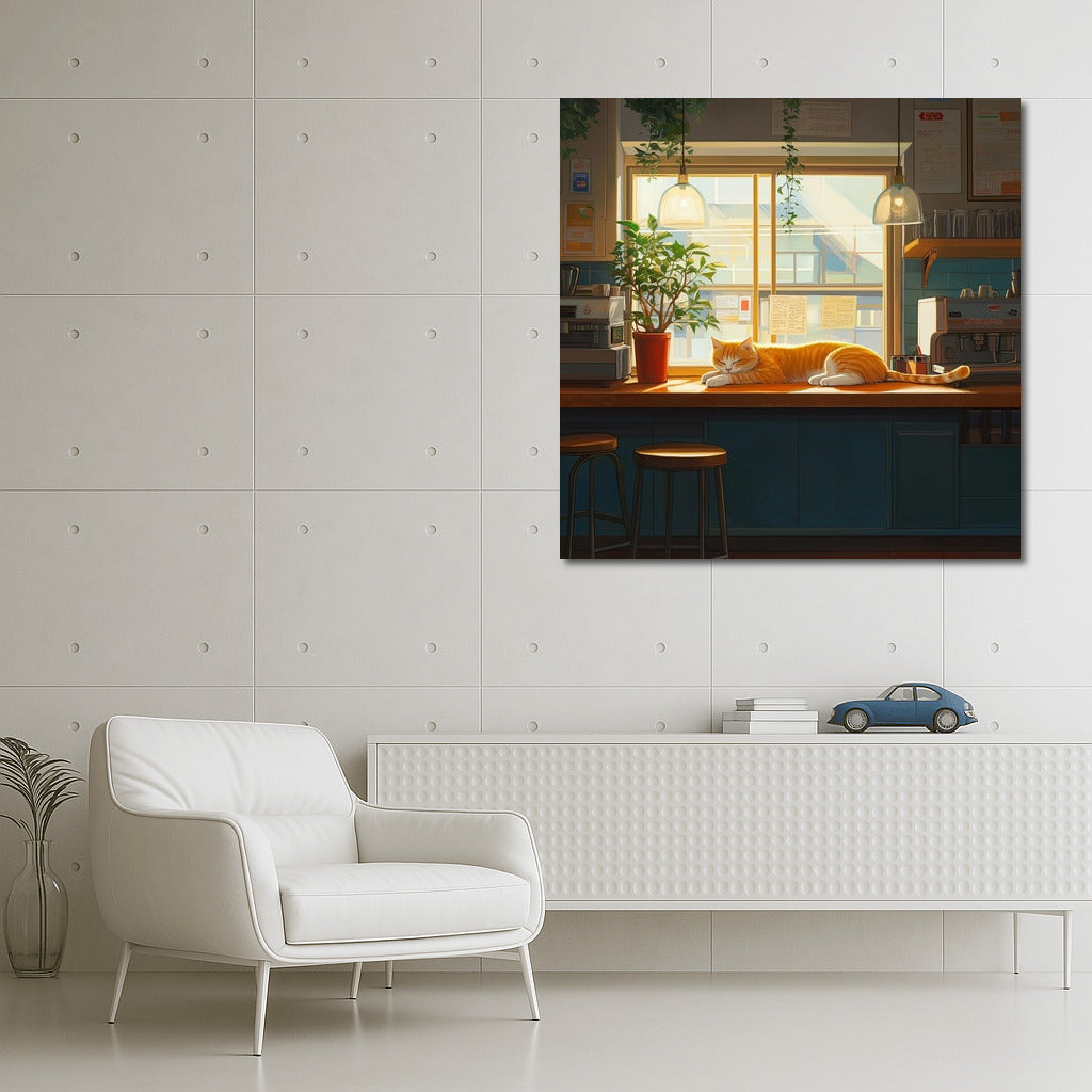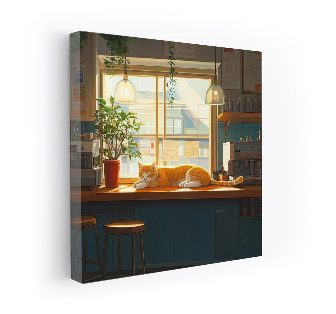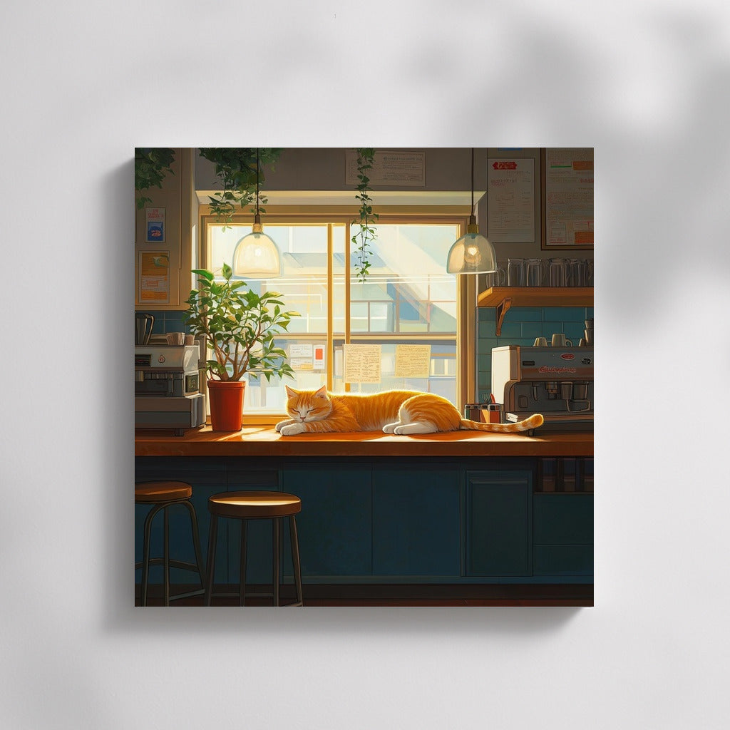 Gentle morning in a cozy coffee shop: a ginger cat on the counter enjoys the sunlight. A poster for creating home comfort. See more from the collection: Anime & Manga genres Art