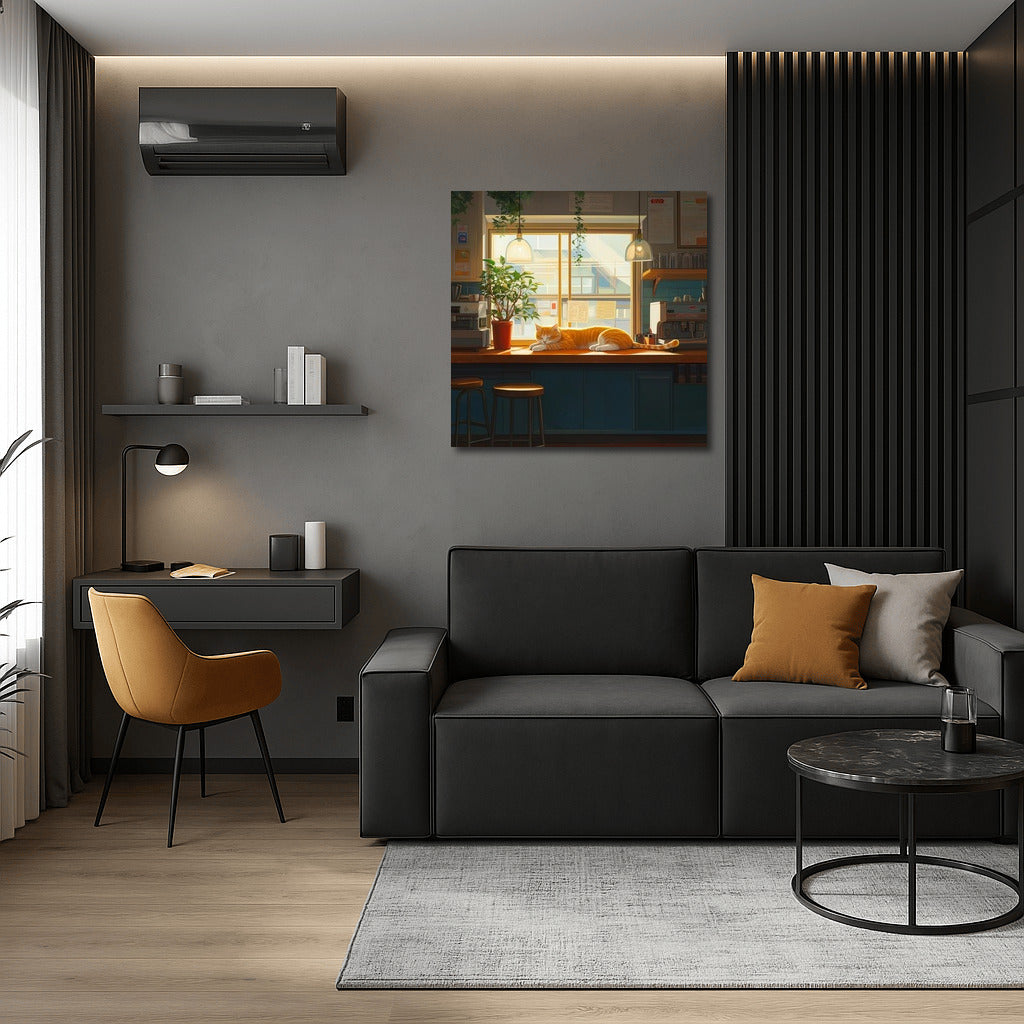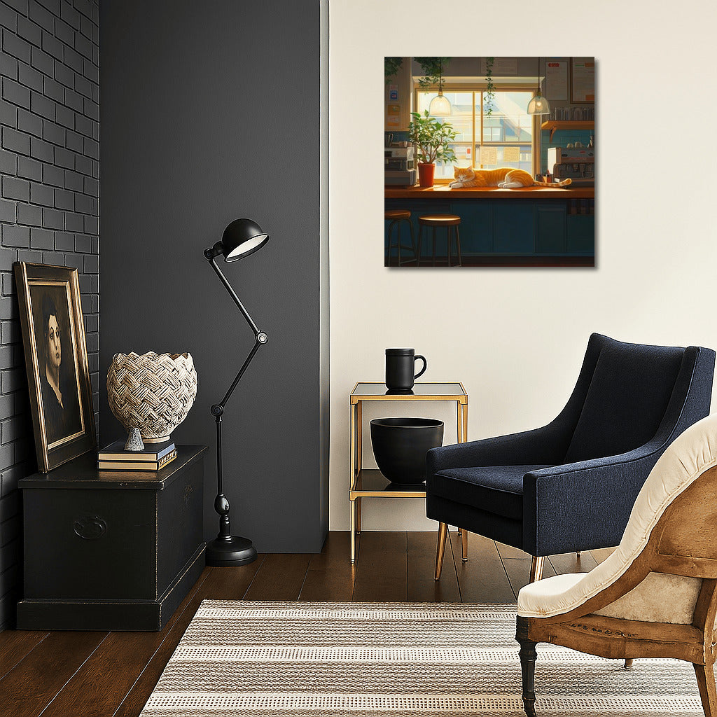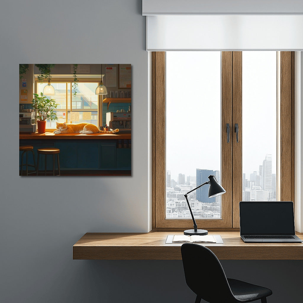 Gentle morning in a cozy coffee shop: a ginger cat on the counter enjoys the sunlight. A poster for creating home comfort. See more from the collection: Anime & Manga genres Art
