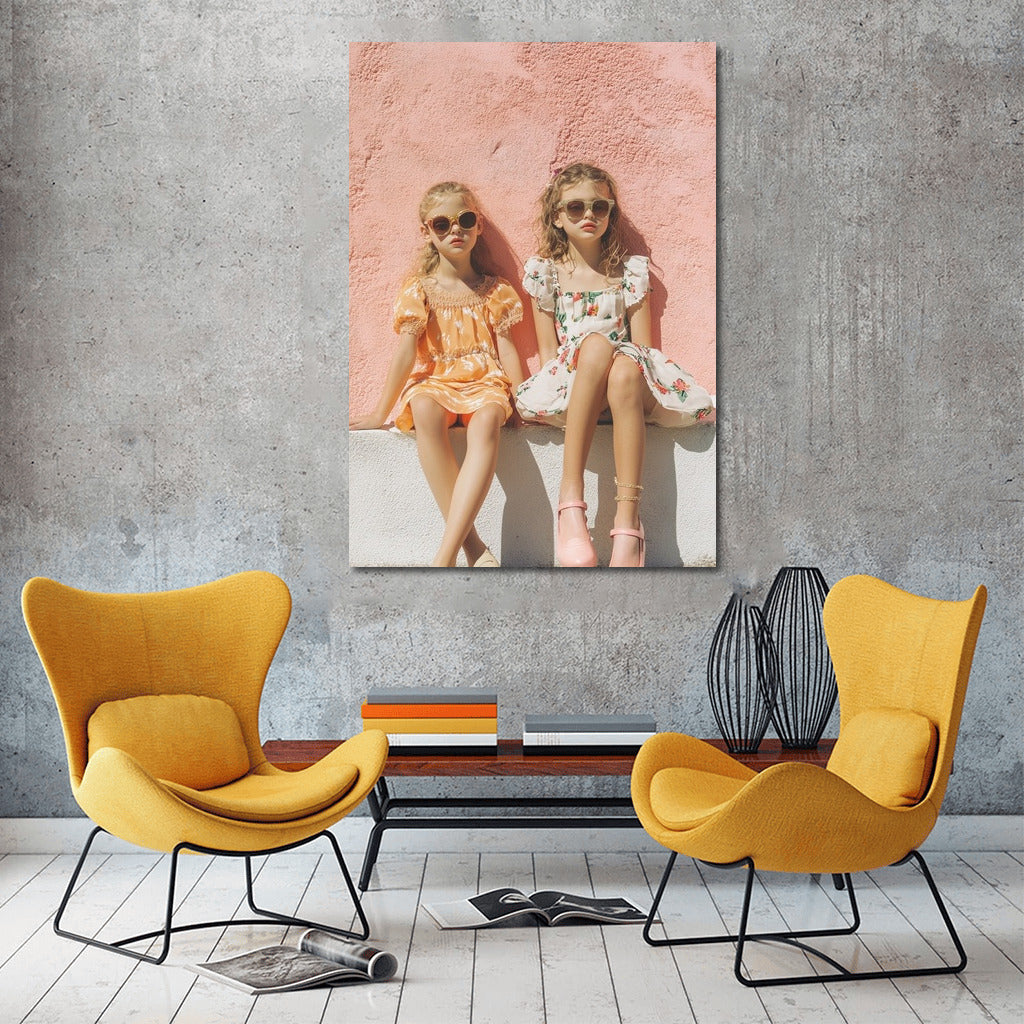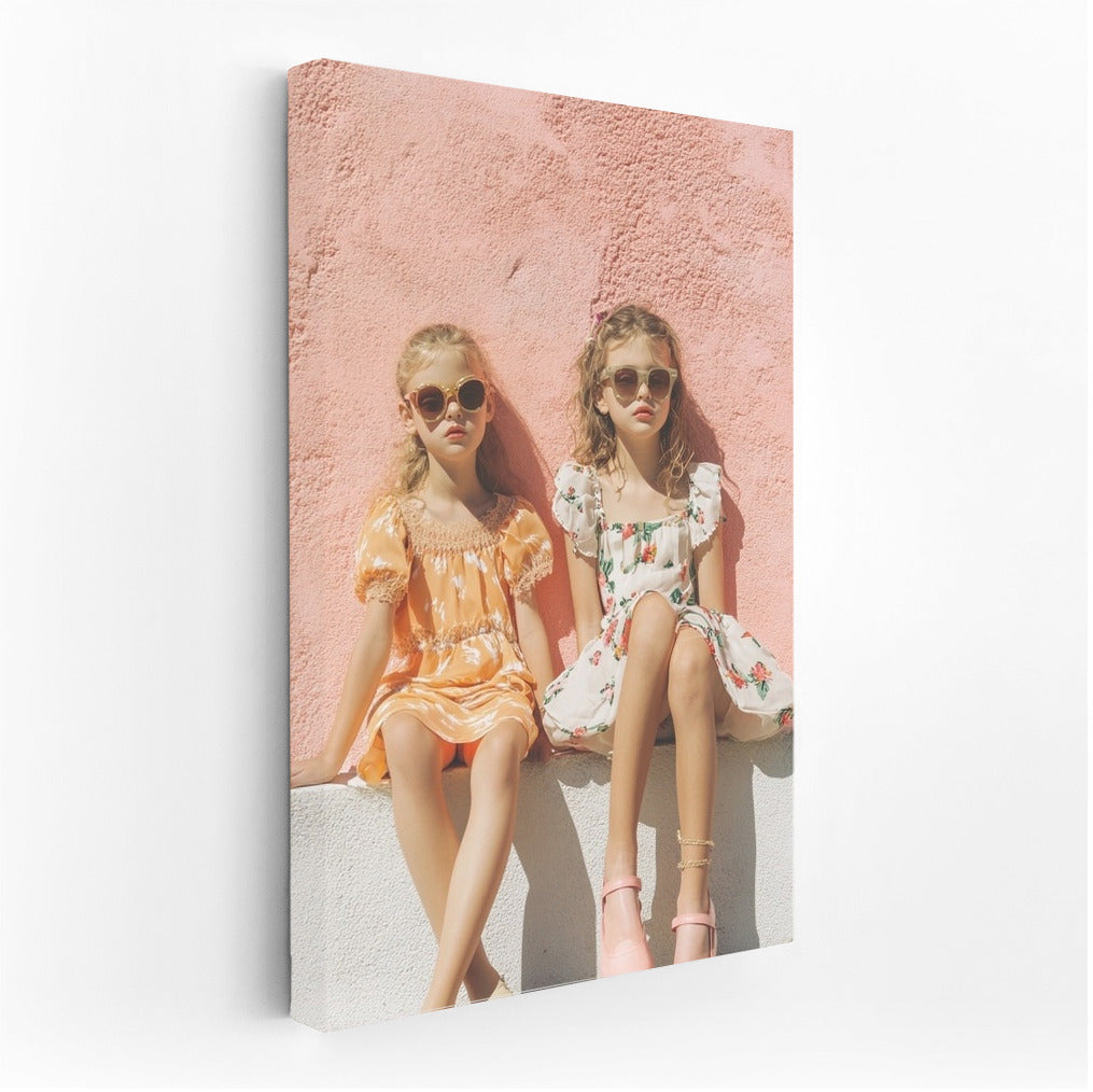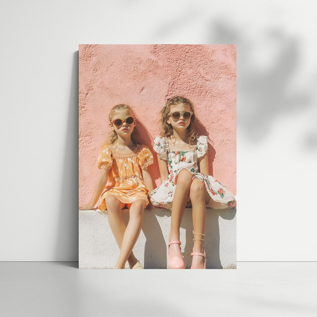 Adorable girls in sunglasses against a pink wall. Add tenderness to your interior with this expressive wall art! See more from the collection: Art For Girls