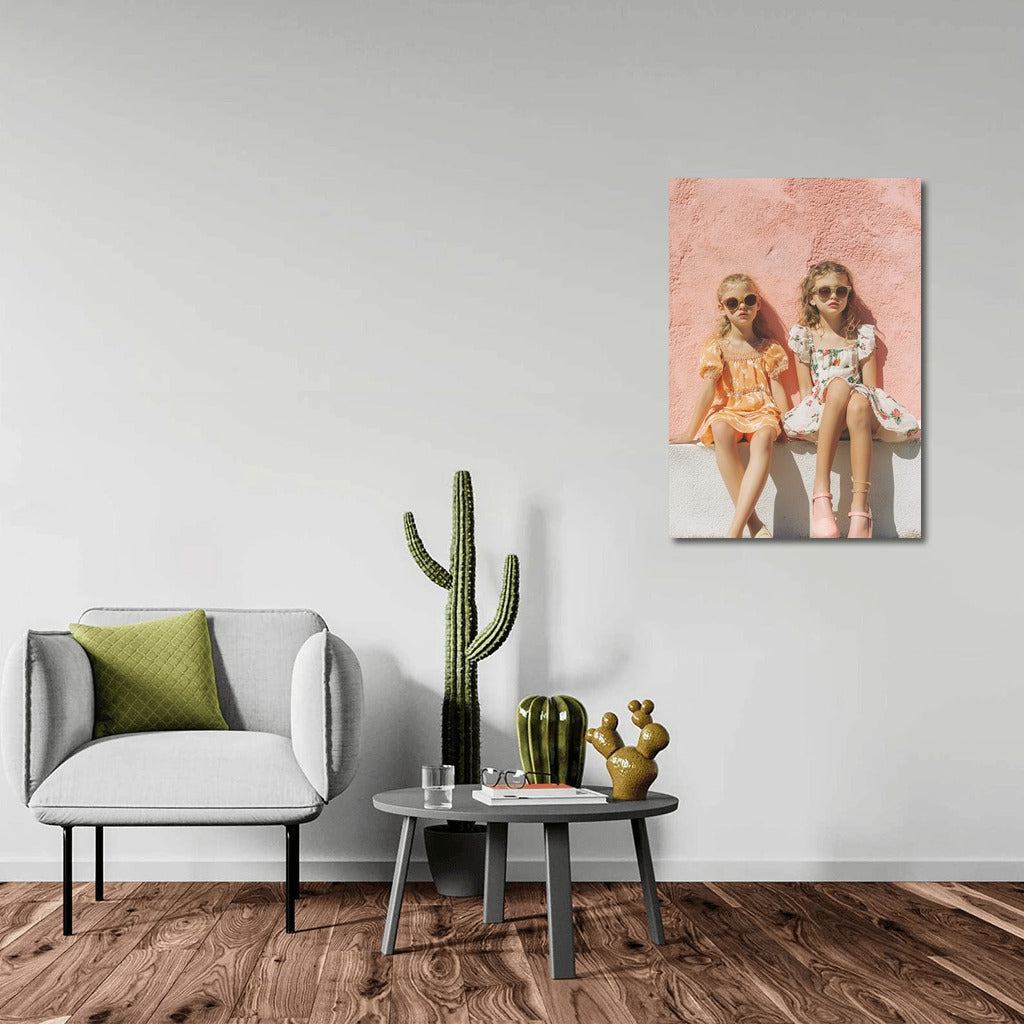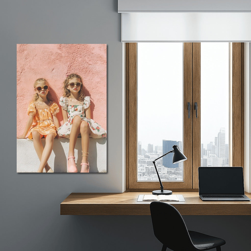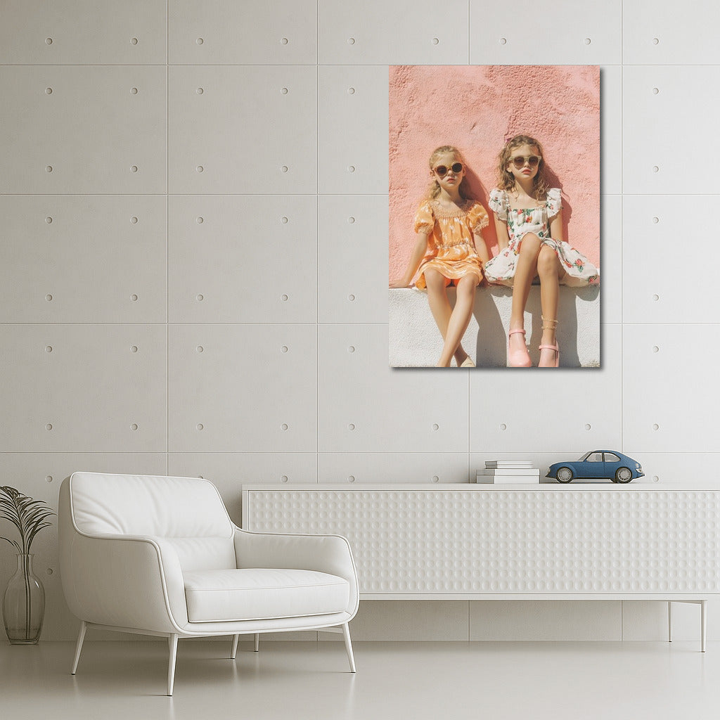 Adorable girls in sunglasses against a pink wall. Add tenderness to your interior with this expressive wall art! See more from the collection: Art For Girls