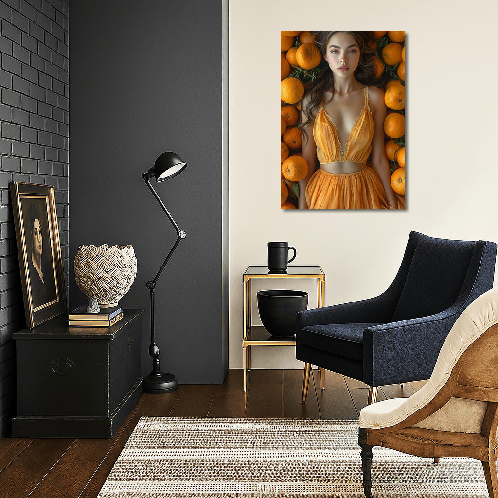 Bright poster with orange symphony: mysterious charm among oranges. Wall art with the scent of the sun. ? See more from the collection: Wall Art with Women