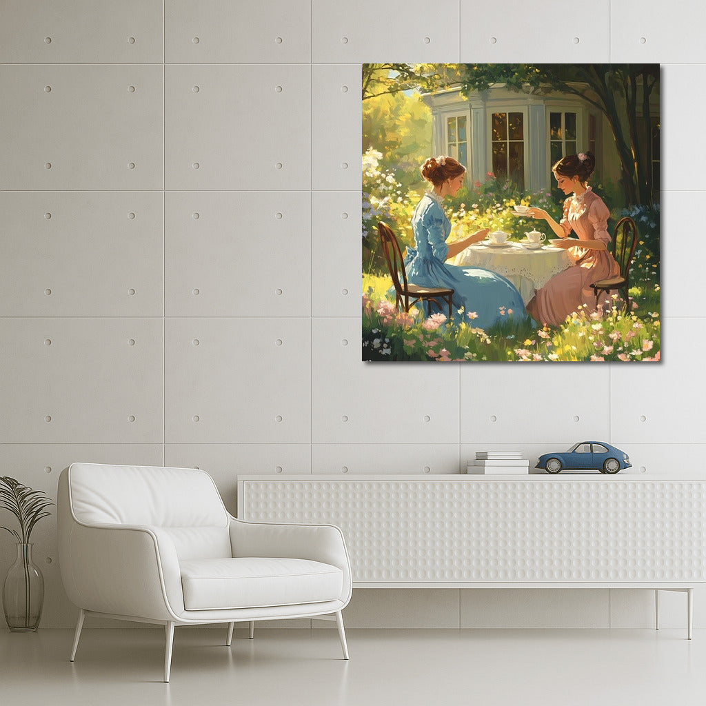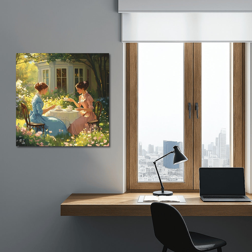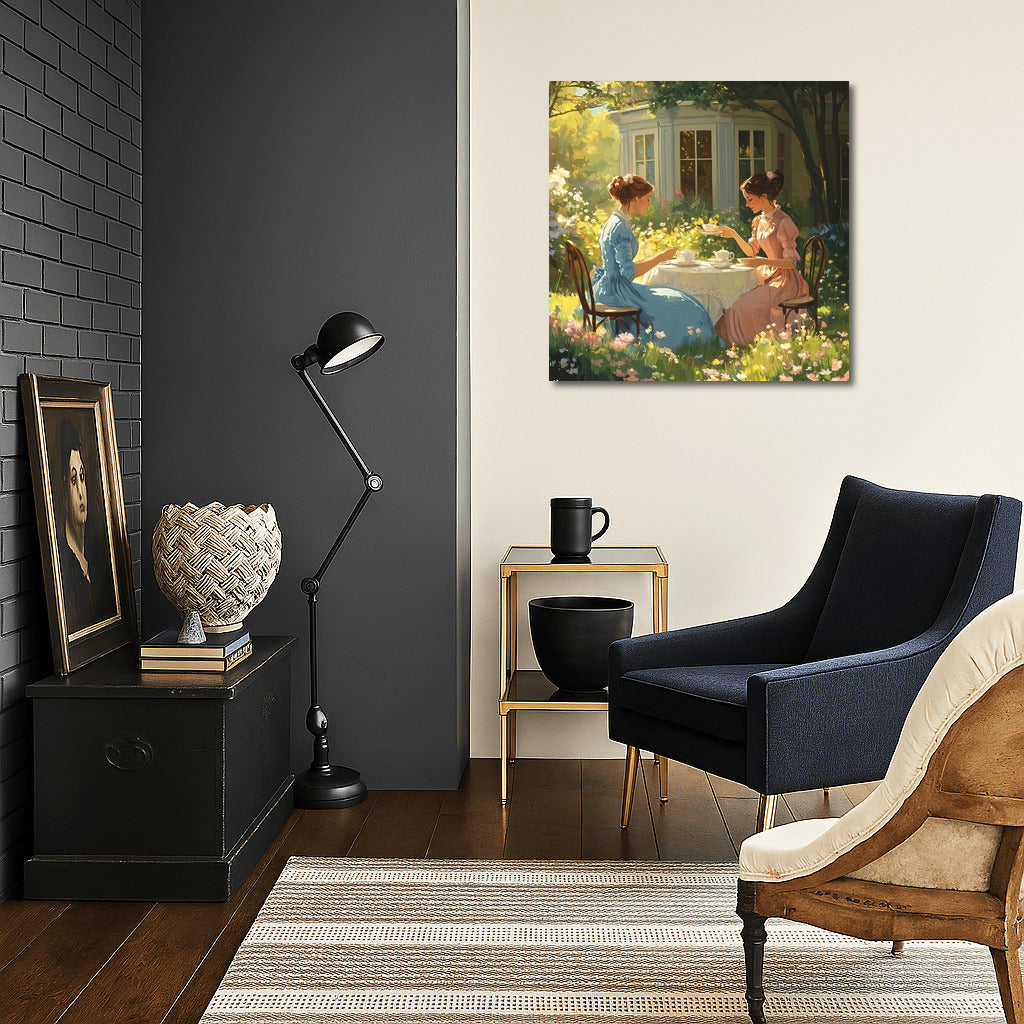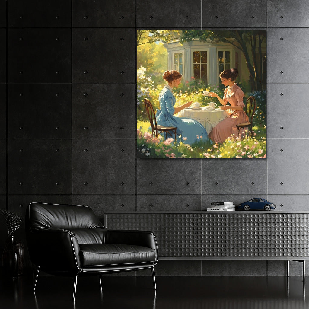 Two figures drinking tea in a garden surrounded by sunlight. A perfect painting for your cozy corner. Wall art. See more from the collection: Mixed Wall Art
