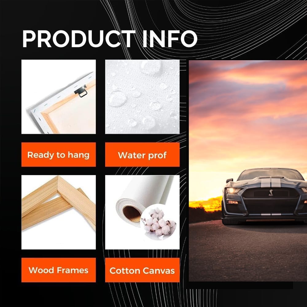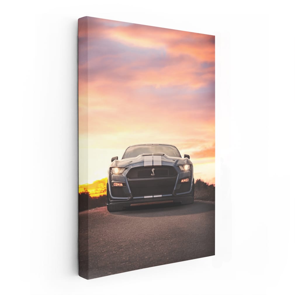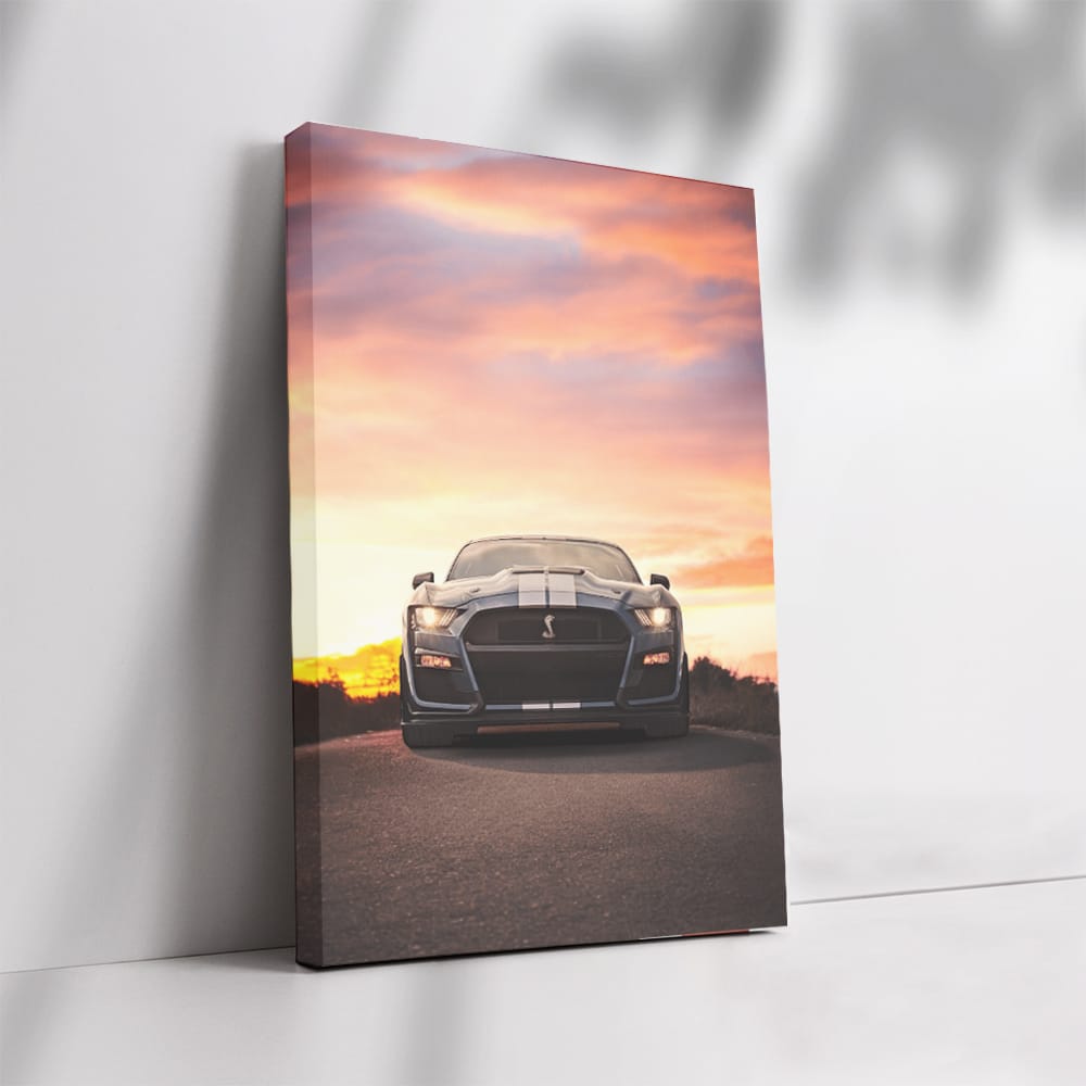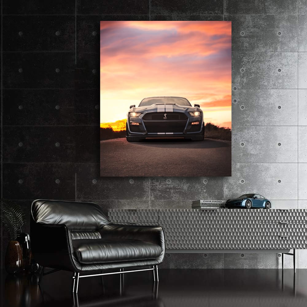 The poster of a blue Mustang racing into the sunset has all the power and spirit of freedom. This is wall art for those who live for speed and adrenaline. The painting screams: "Press the gas and don't look back!" See more from the collection: Ford Art