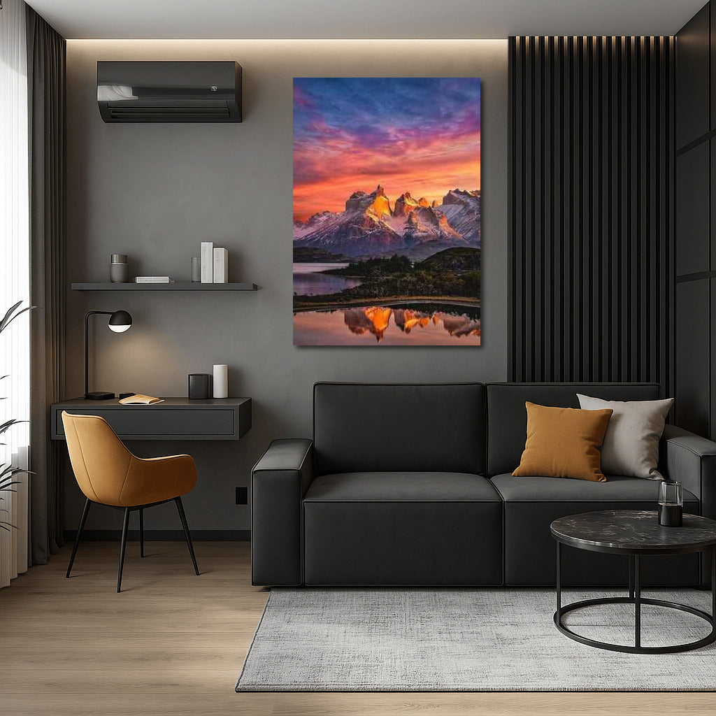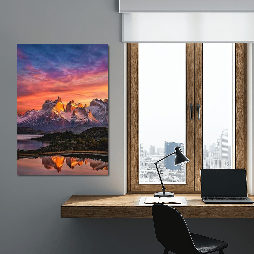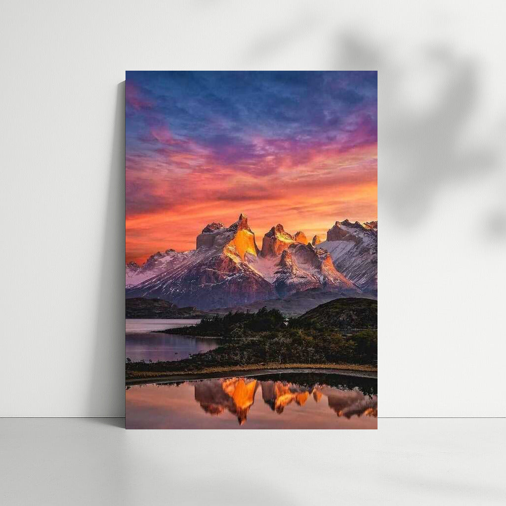 Sunset splendor of Chile: mountains and lakes in an epic dance of light. Nature's perfection for your wall art. See more from the collection: Country Art