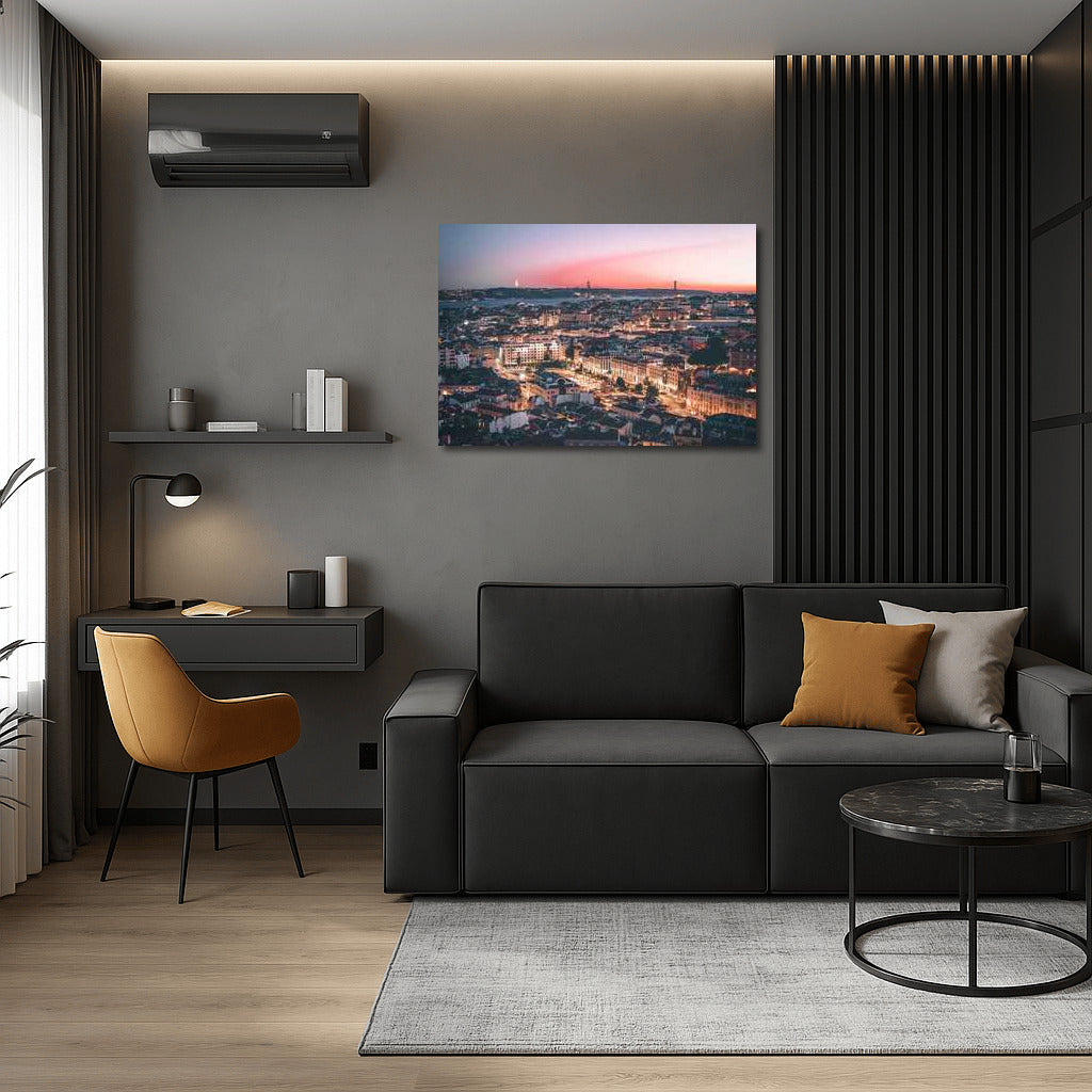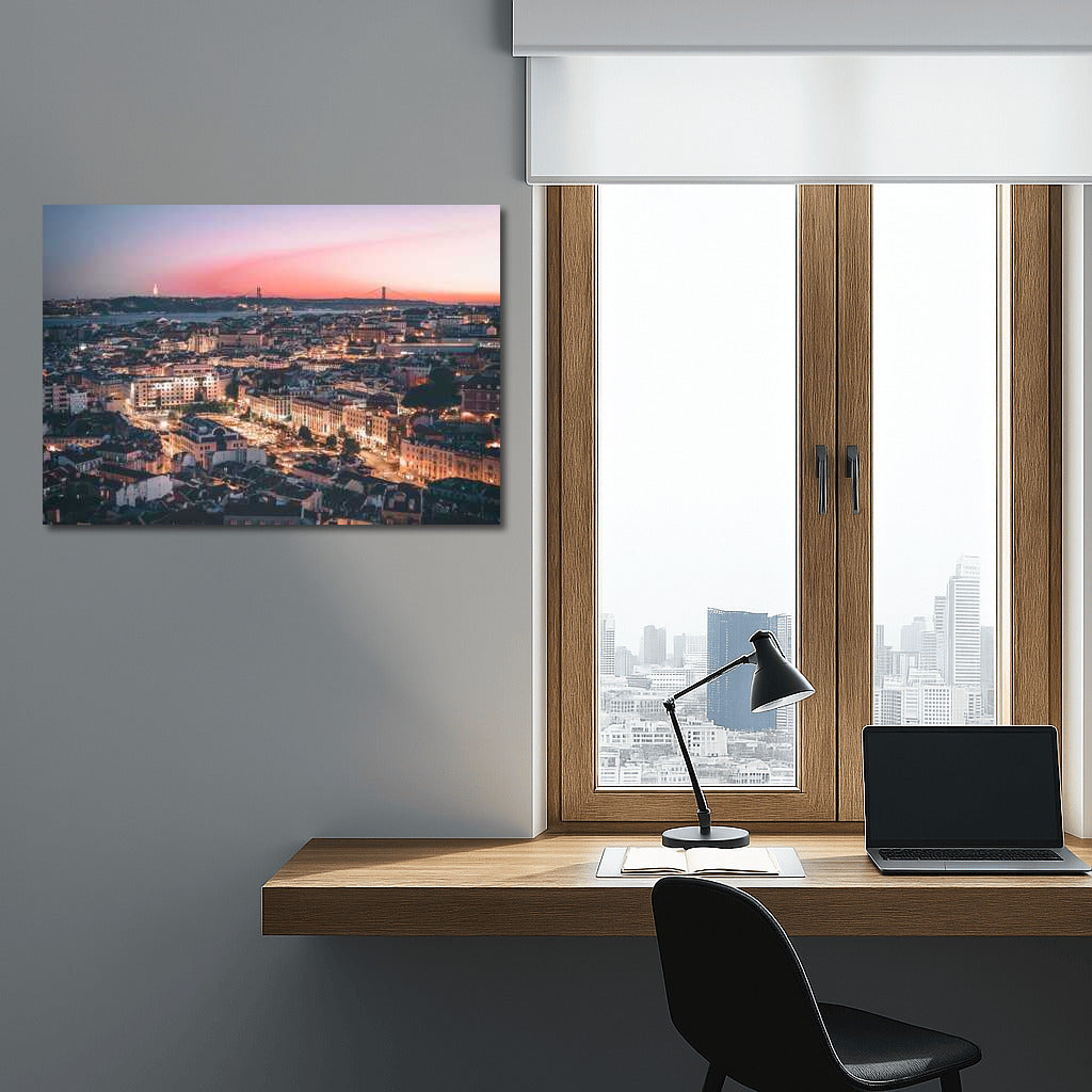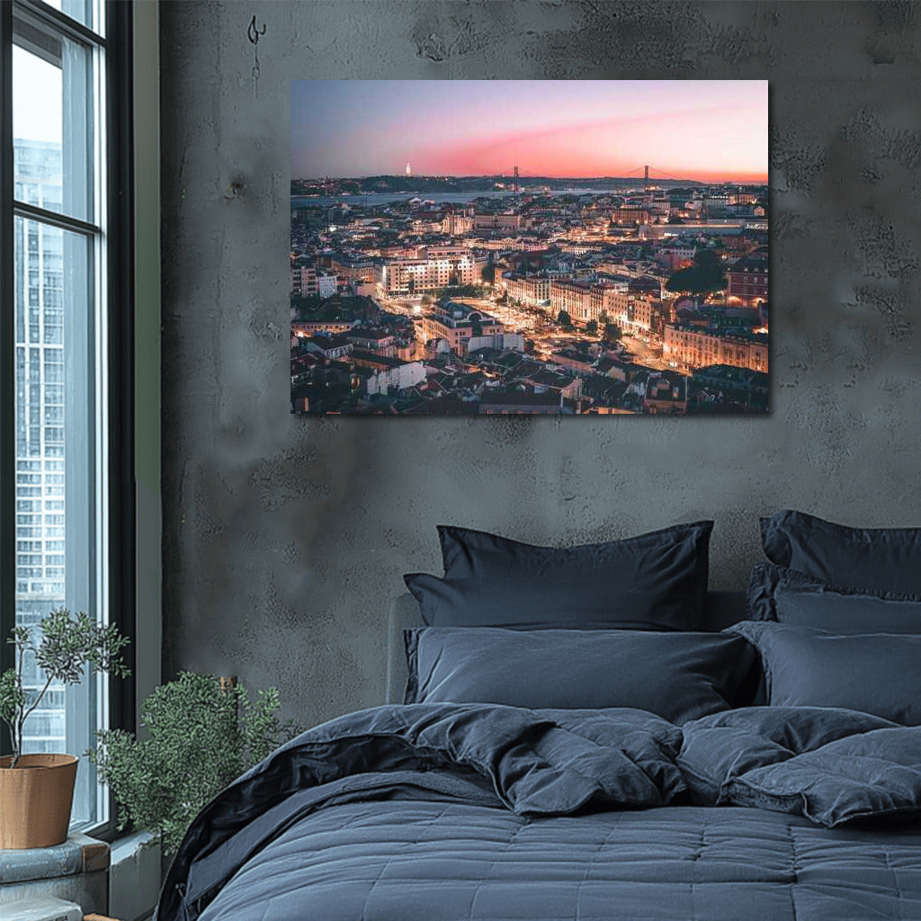 Wall art: Lisbon evening panorama, where the city lights dance under the sunset sky. Cityscapes Skylines, Lisbon Portugal. See more from the collection: Cityscapes & Skylines Art