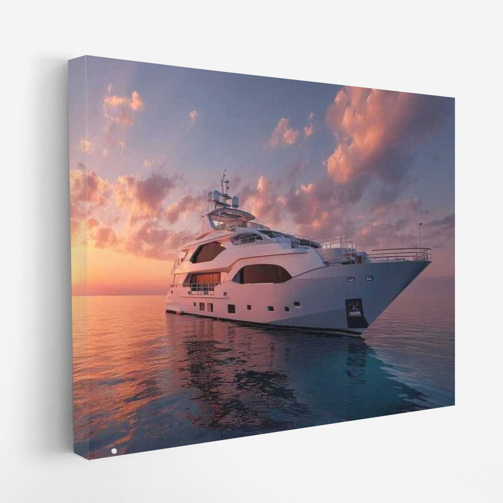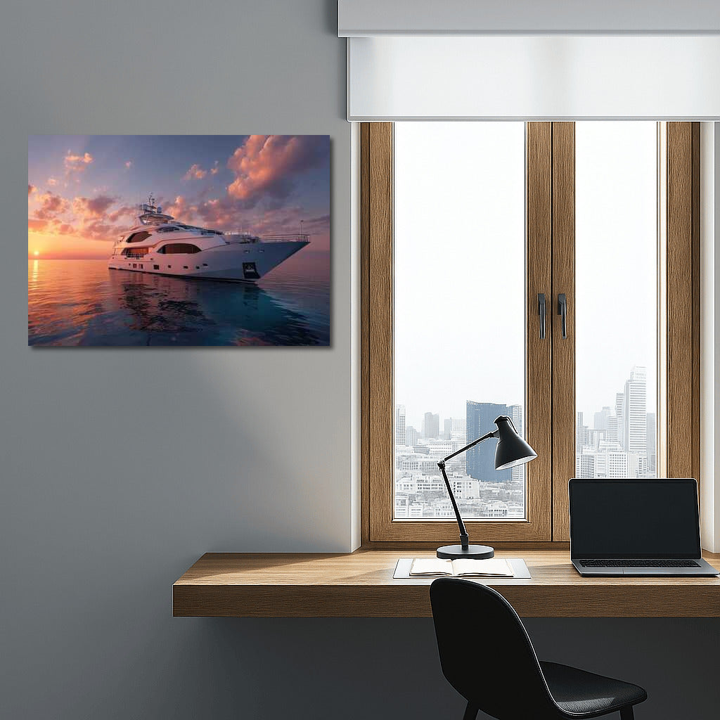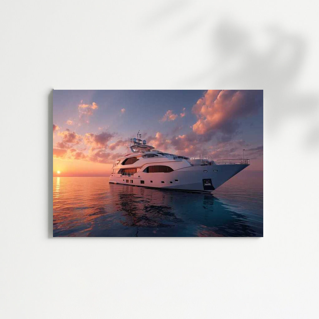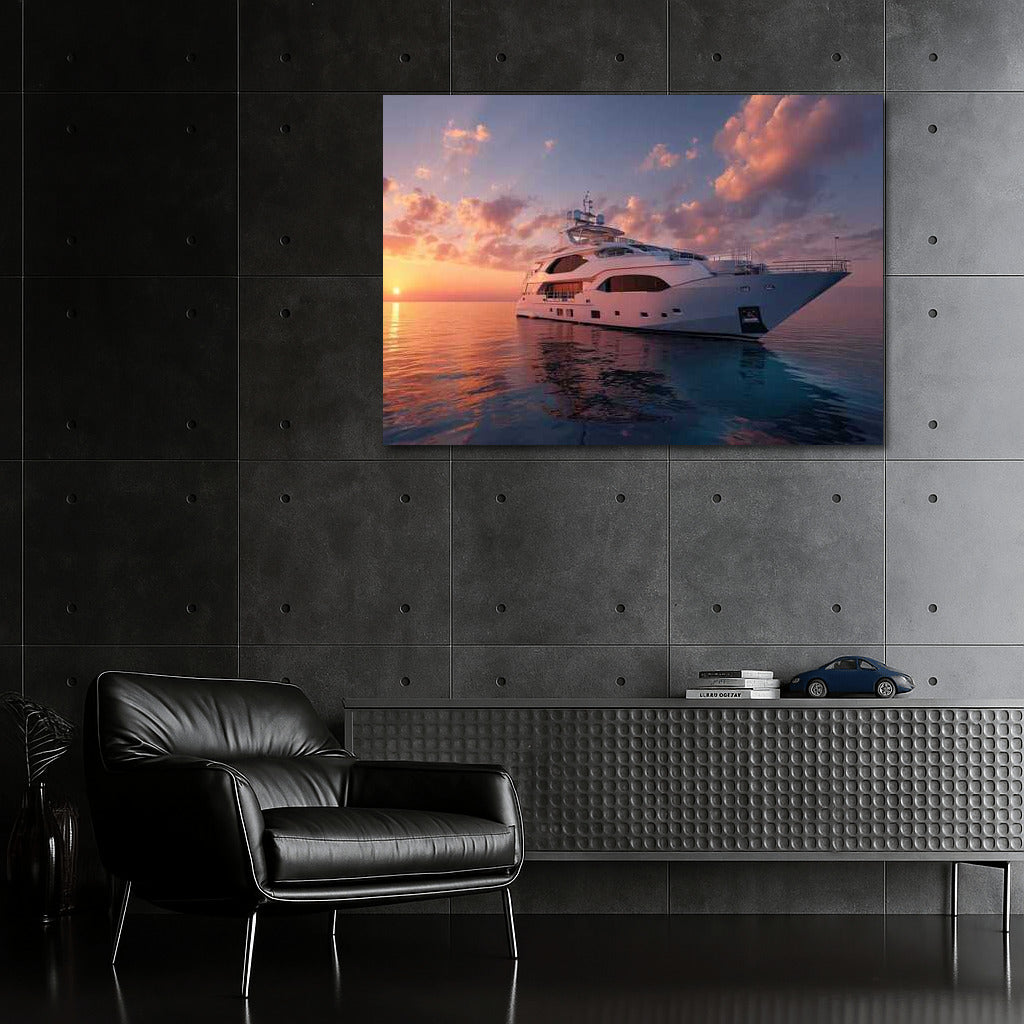 Luxury and dreams come together in this poster: an elegant yacht conquers the sunset waves, adding charm to your space. See more from the collection: Transport Art