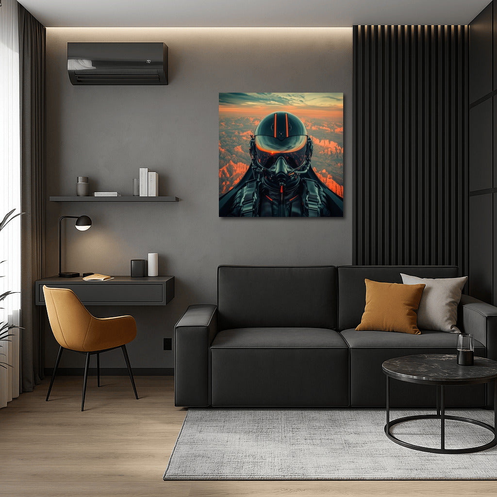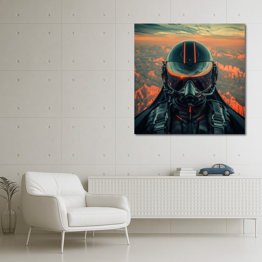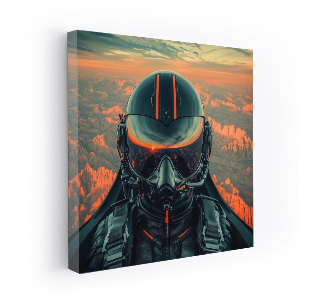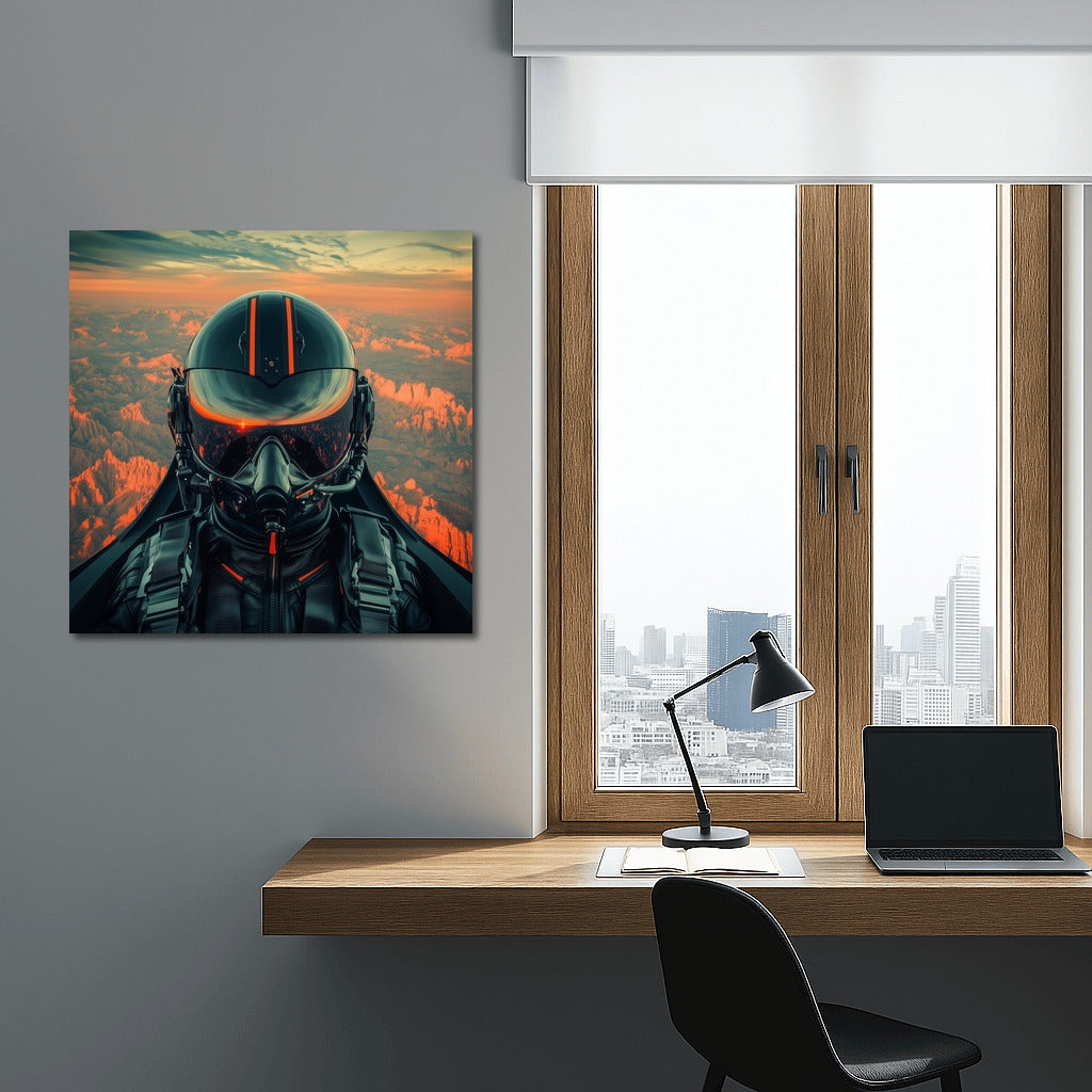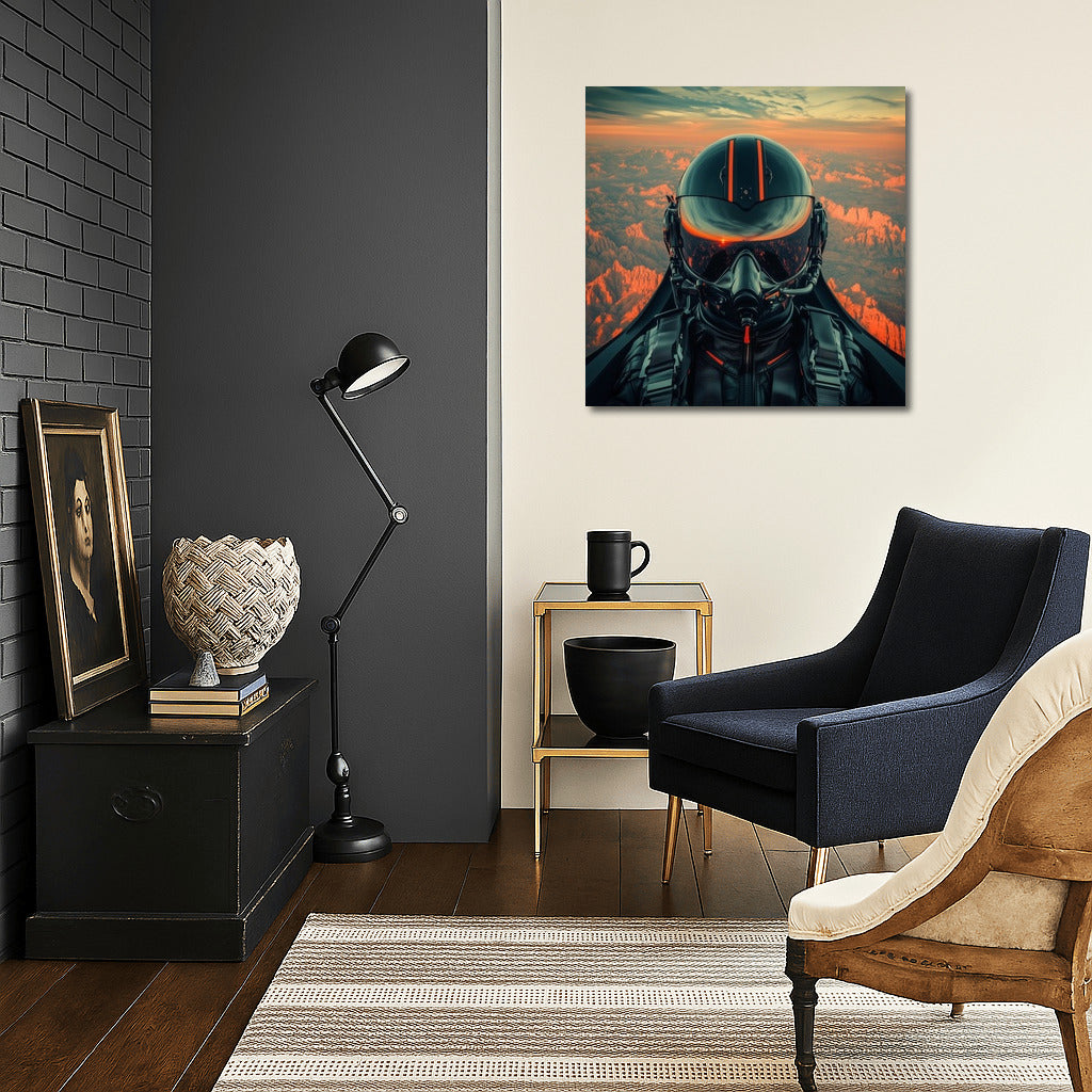 Pilot's helmet in a breathtaking sunset. This poster will add dynamics and mystery to your wall art. Feel the rhythm of the heights! See more from the collection: Mixed Wall Art