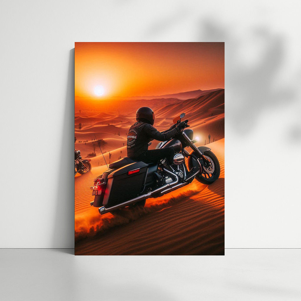 A poster of powerful Harley Davidsons racing through the desert at sunset. Inspiration and freedom on your wall! See more from the collection: Harley-Davidson Motorcycle Art
