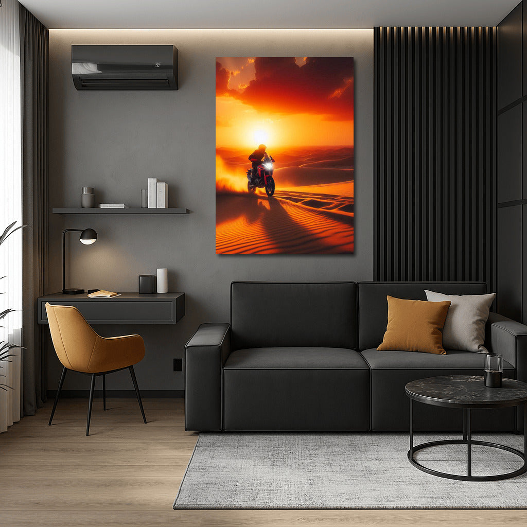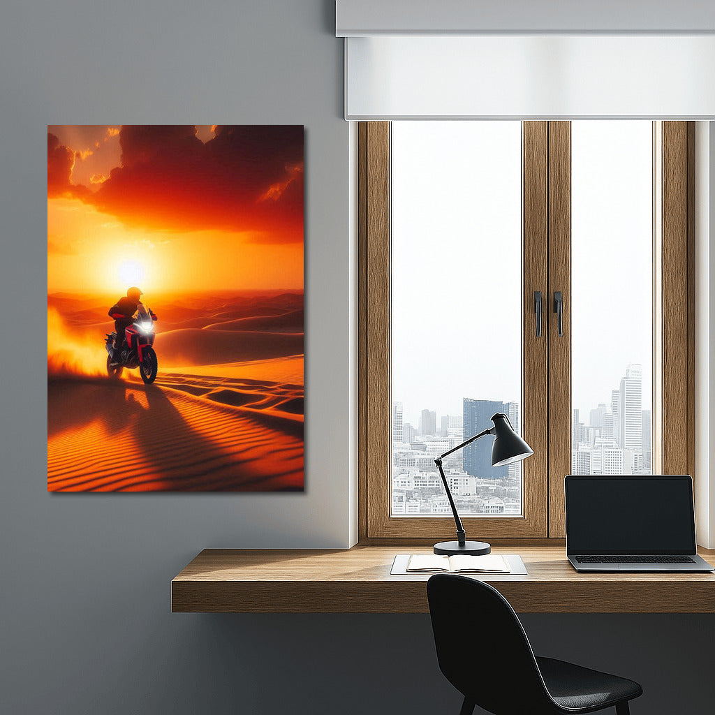 Immerse yourself in the sunset magic with the poster: Honda on the desert waves. Wall art of speed and freedom. See more from the collection: Honda Motorcycle Art