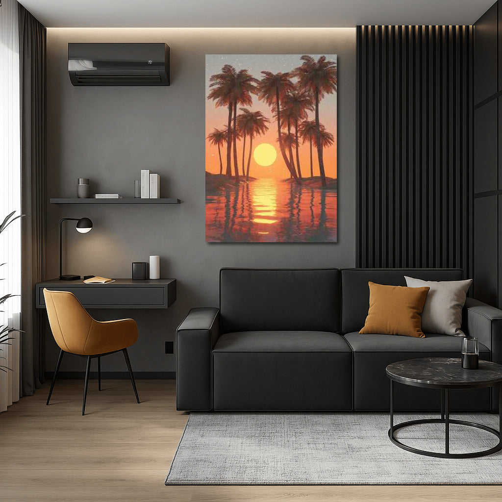 Sunset surrounded by palm trees, reflected in the water. Wall art will take you to the atmosphere of a Florida vacation. See more from the collection: Country Art
