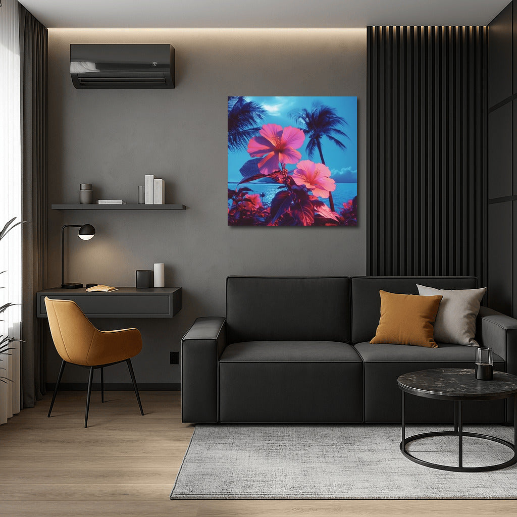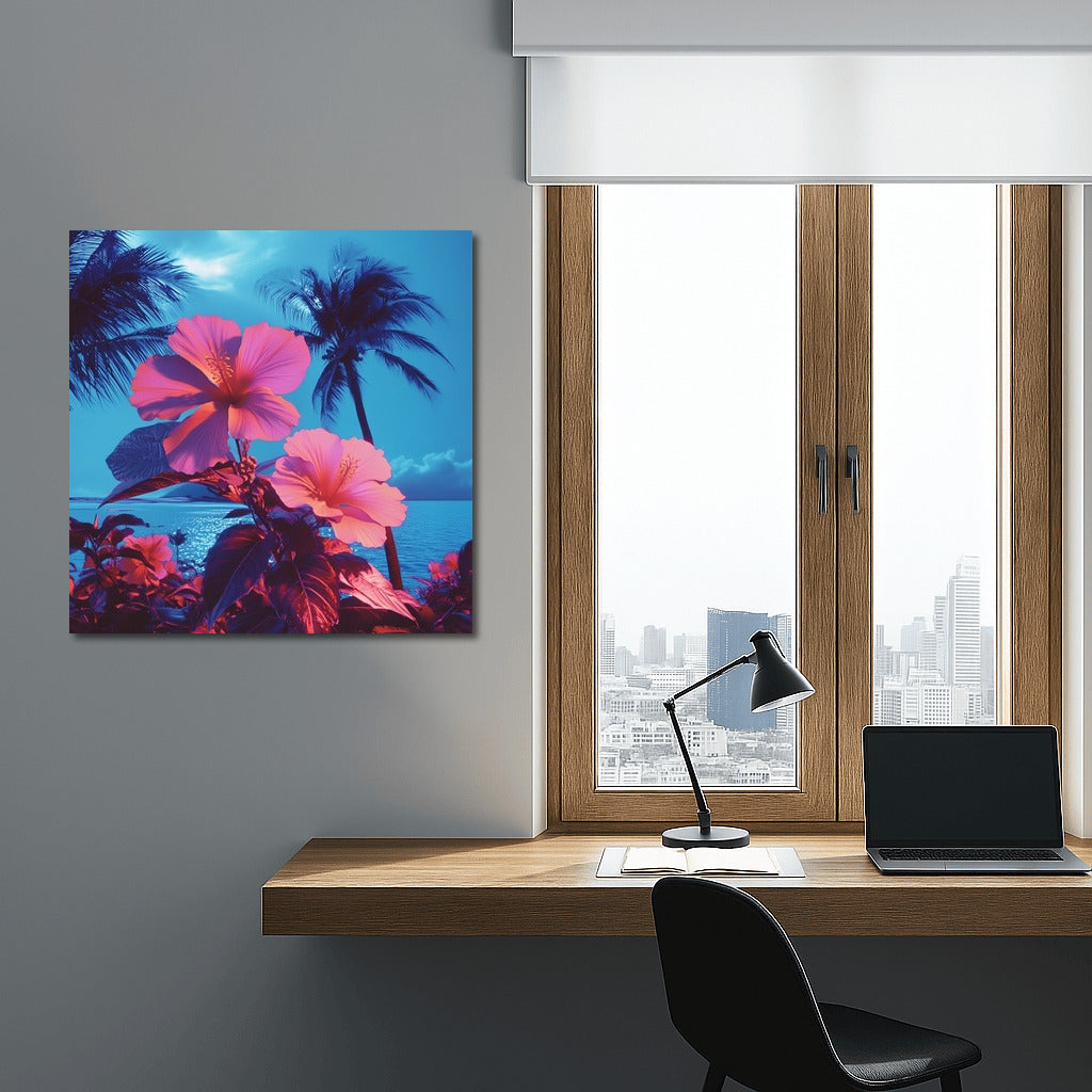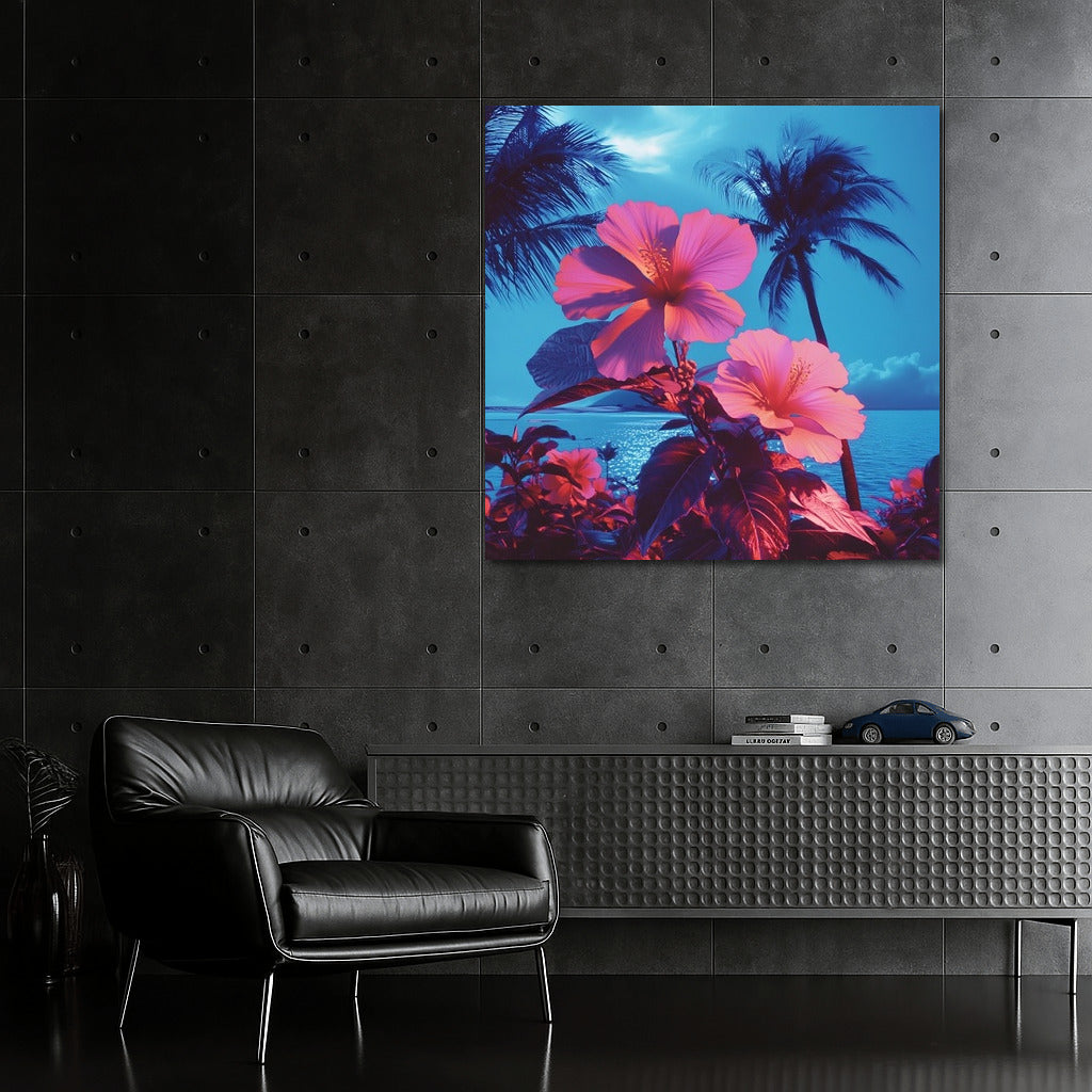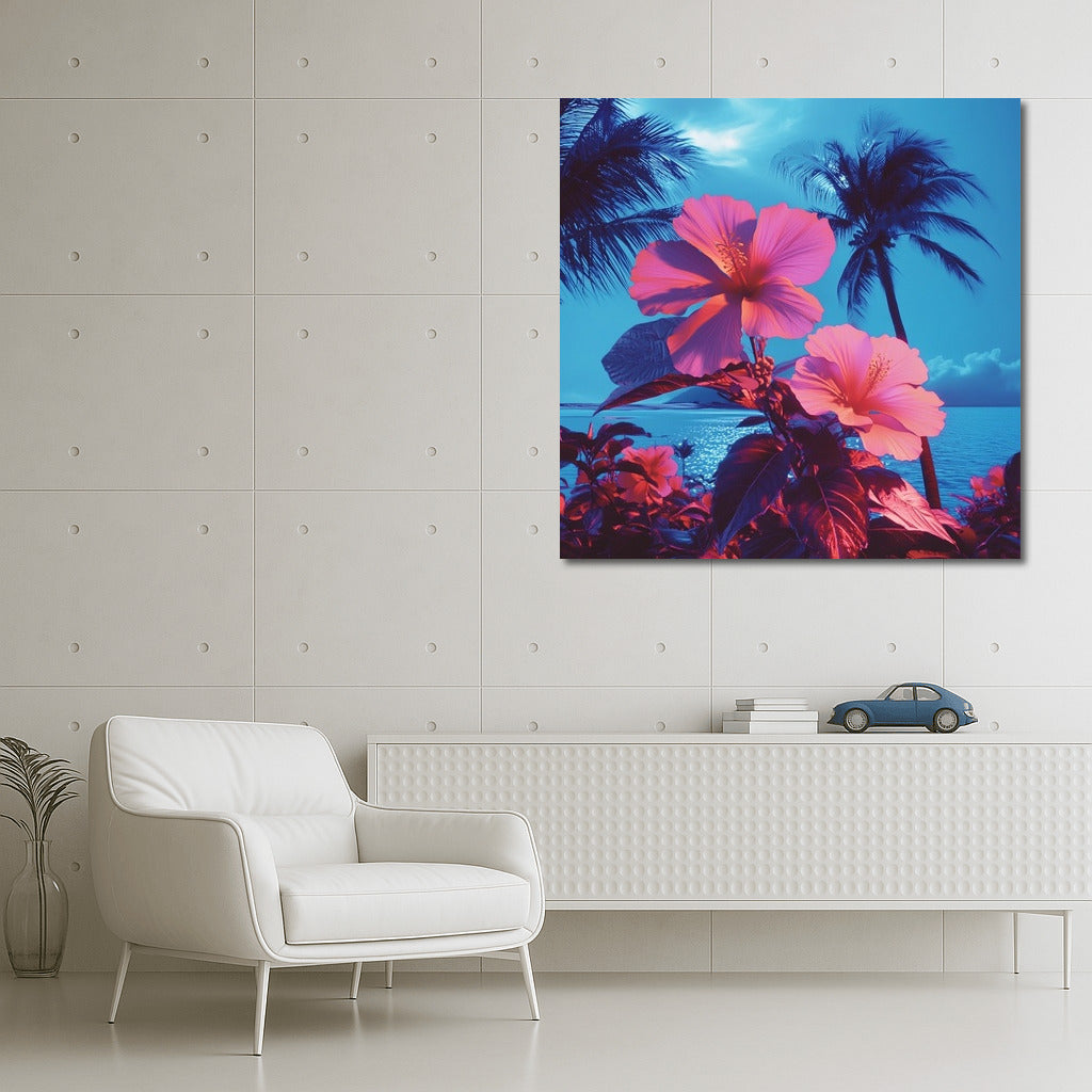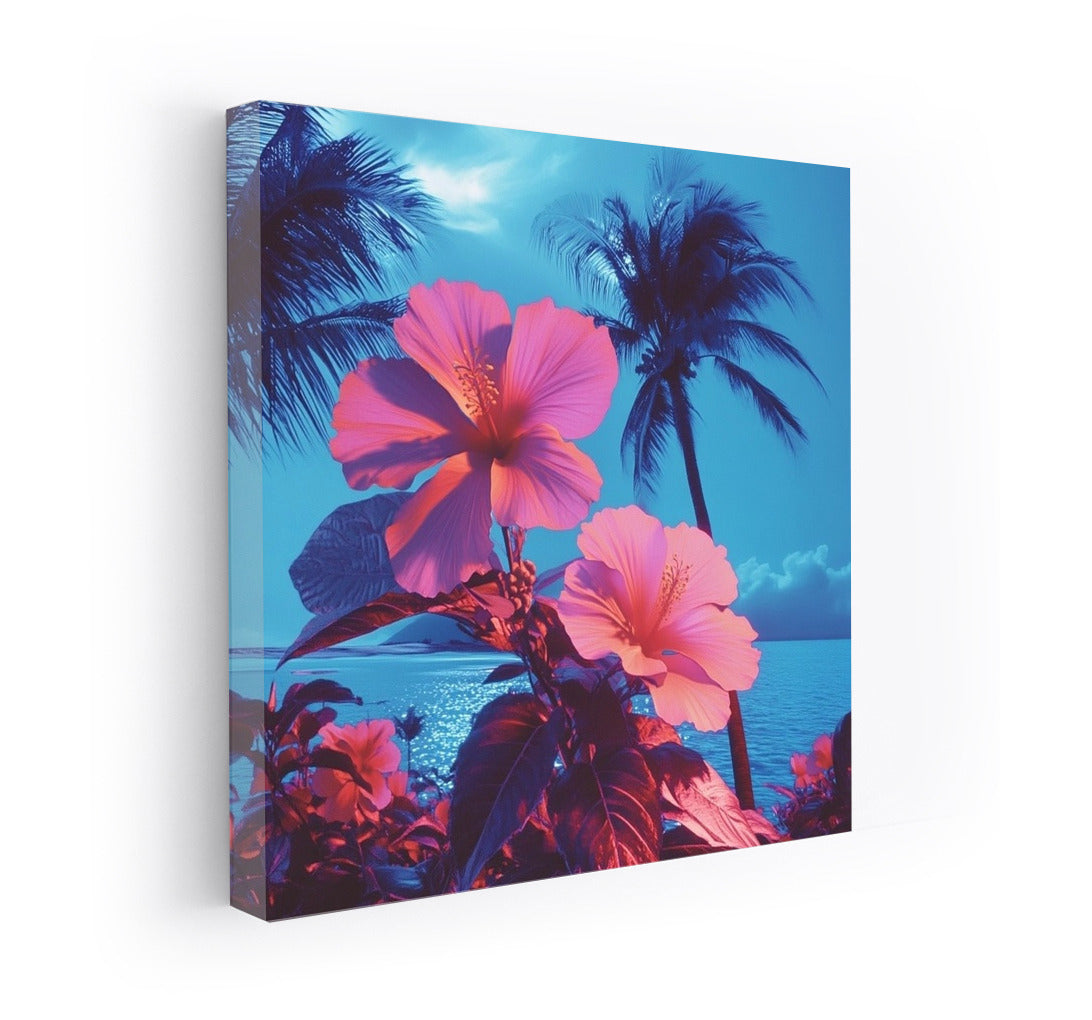 A tropical dream on your wall: bright hibiscus and palm trees in the glow of a sea sunset. The perfect poster for coziness and inspiration. See more from the collection: Flowers Art