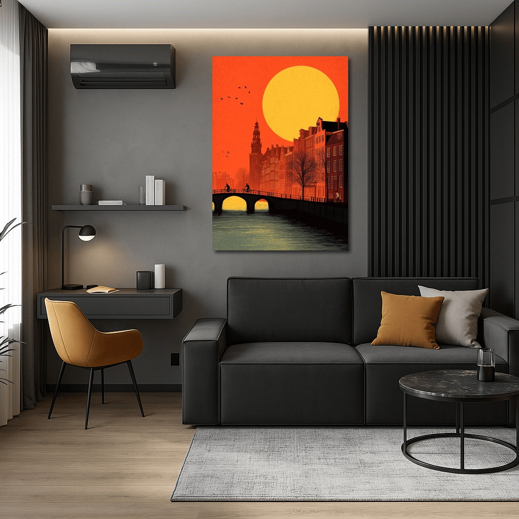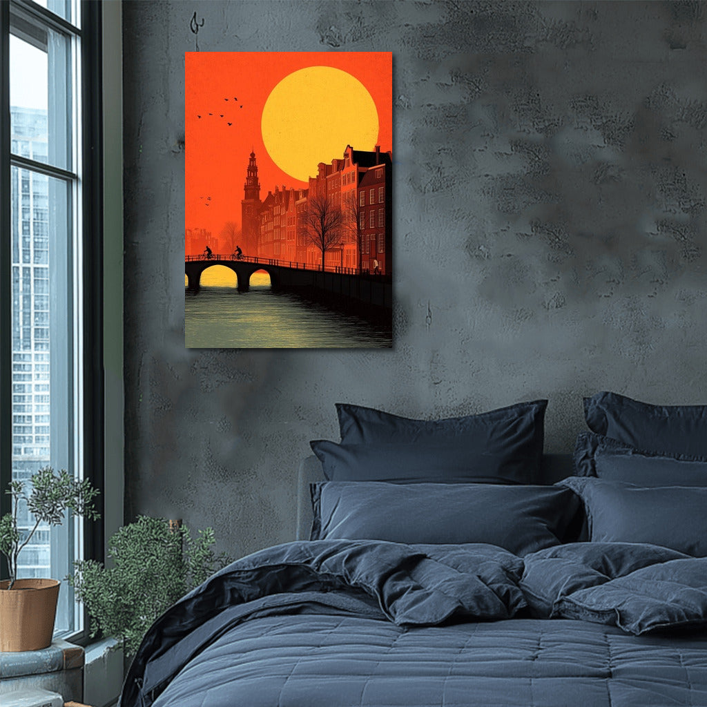 A sparkling Amsterdam sunset in this poster brings a piece of the Netherlands magic to your wall art collection. See more from the collection: Amsterdam, Netherlands Art
