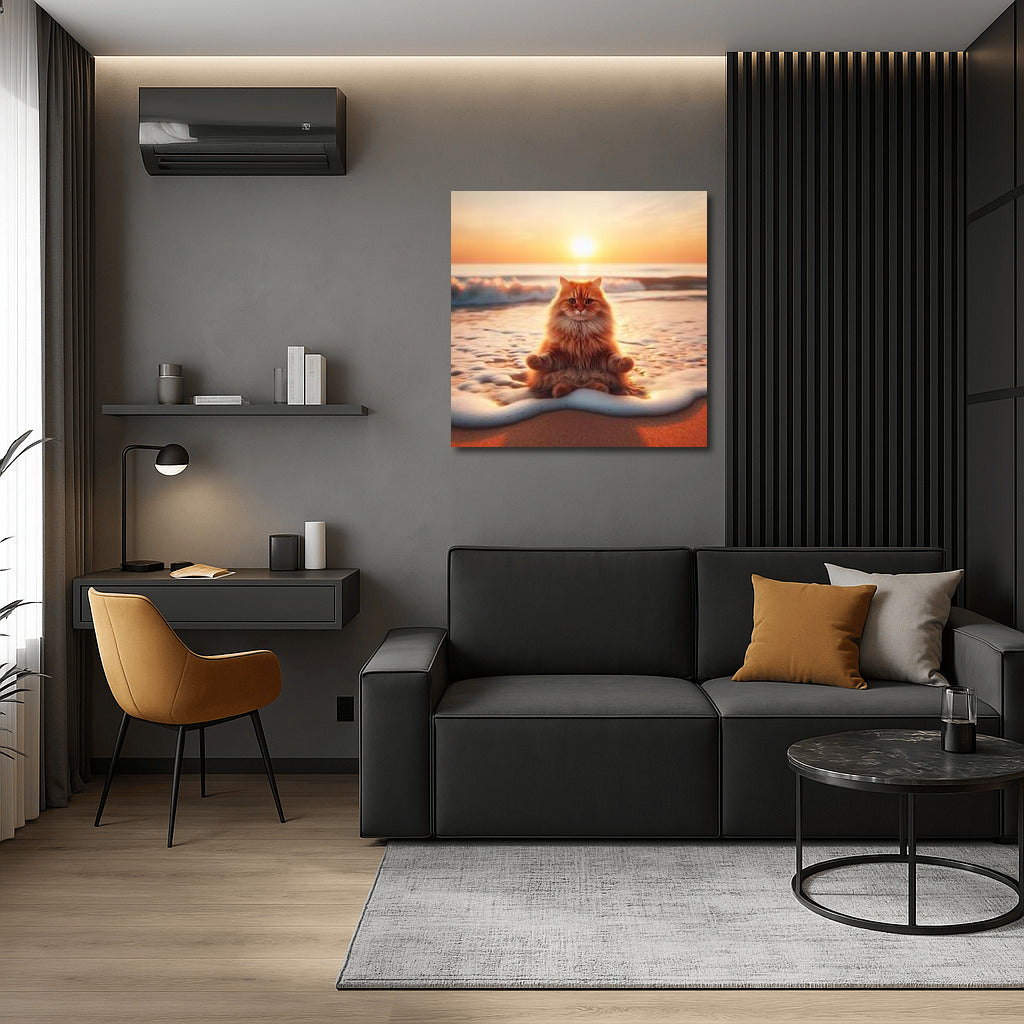 Calming poster: a cat meditating on the beach in the rays of the sunset. Perfect for creating harmony in your space! See more from the collection: Animals Art
